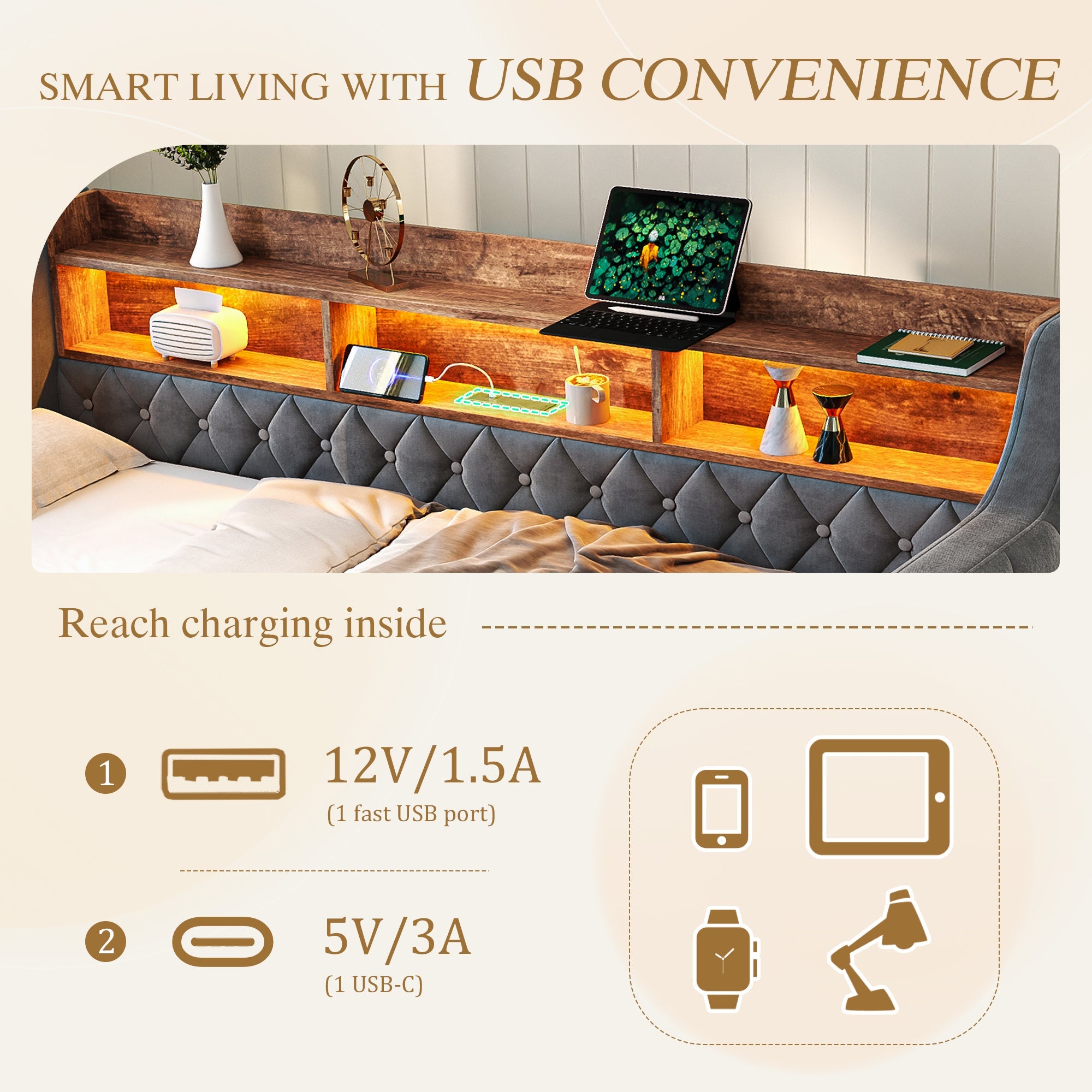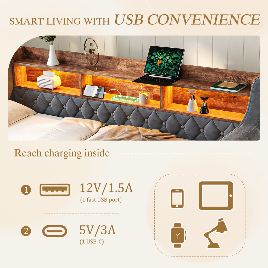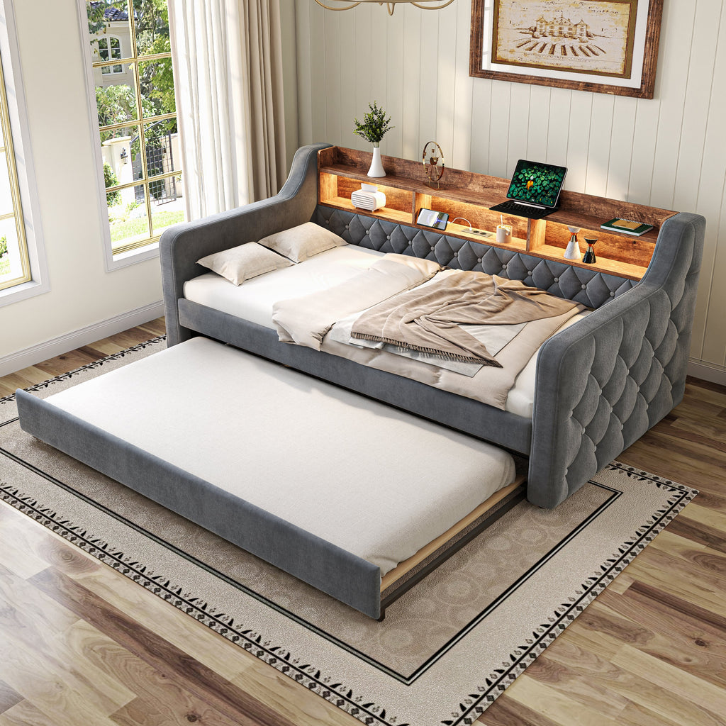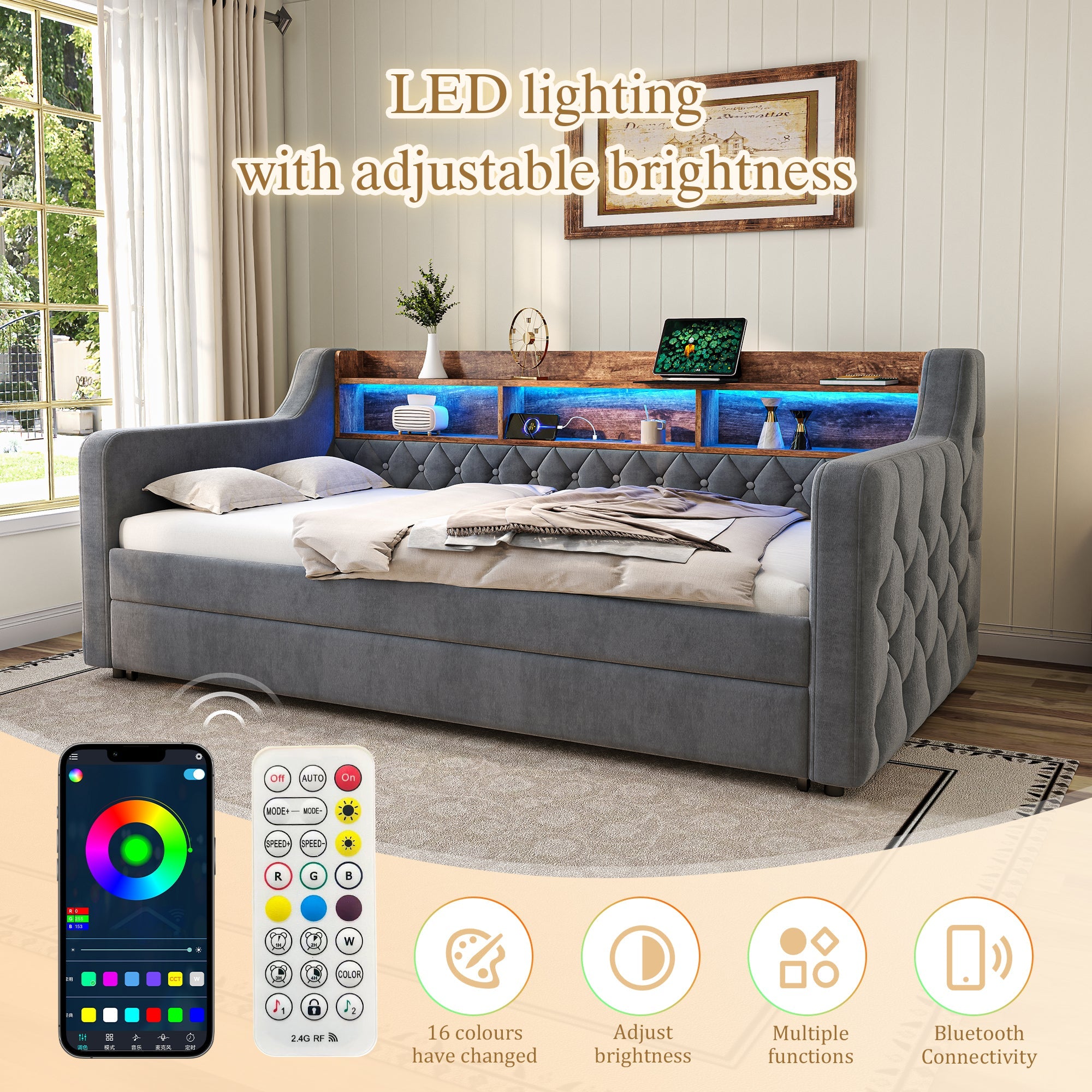 Space-saving Sofa Bed 90x190 cm with Storage, LED Ambiance & USB-C Port, Velvet Gray