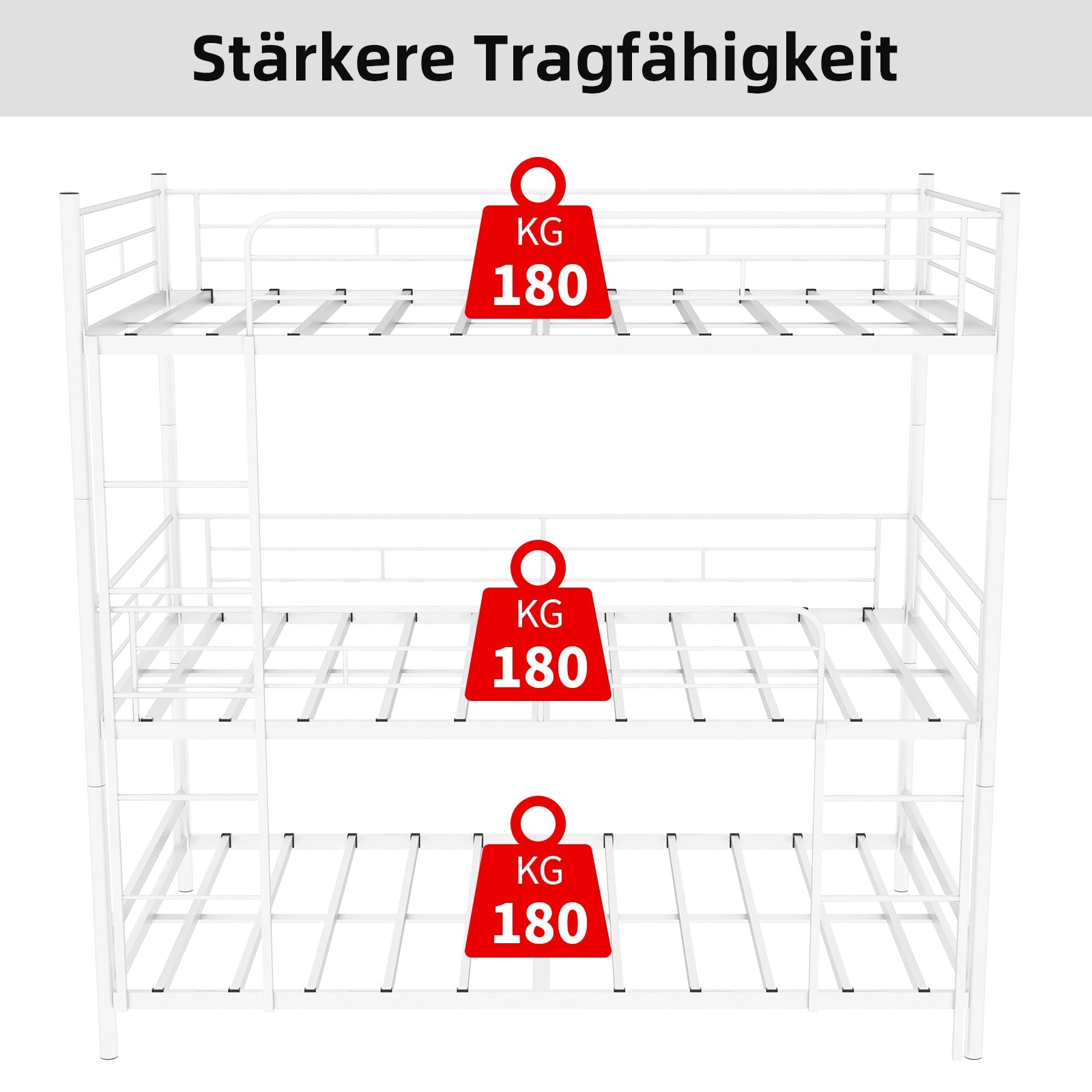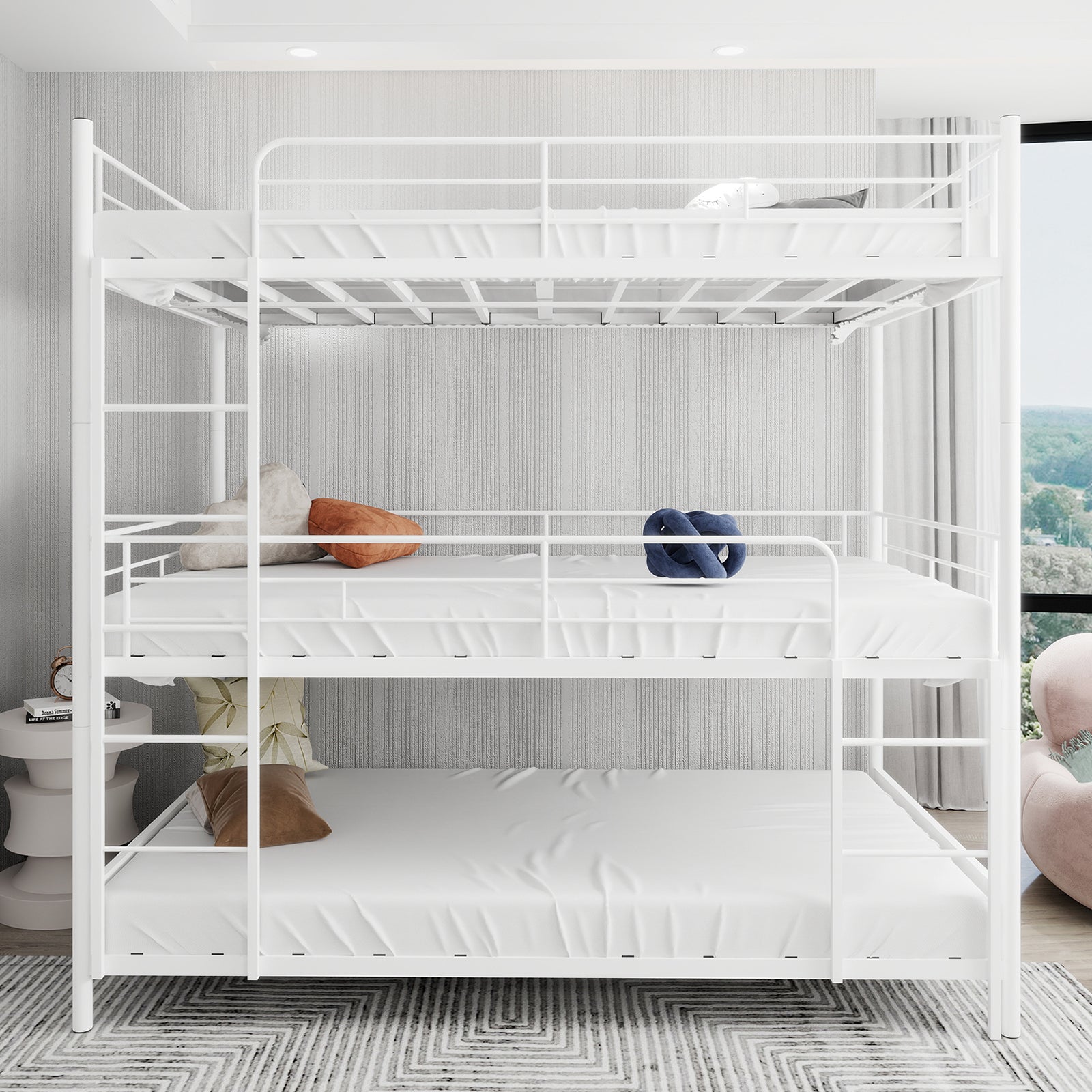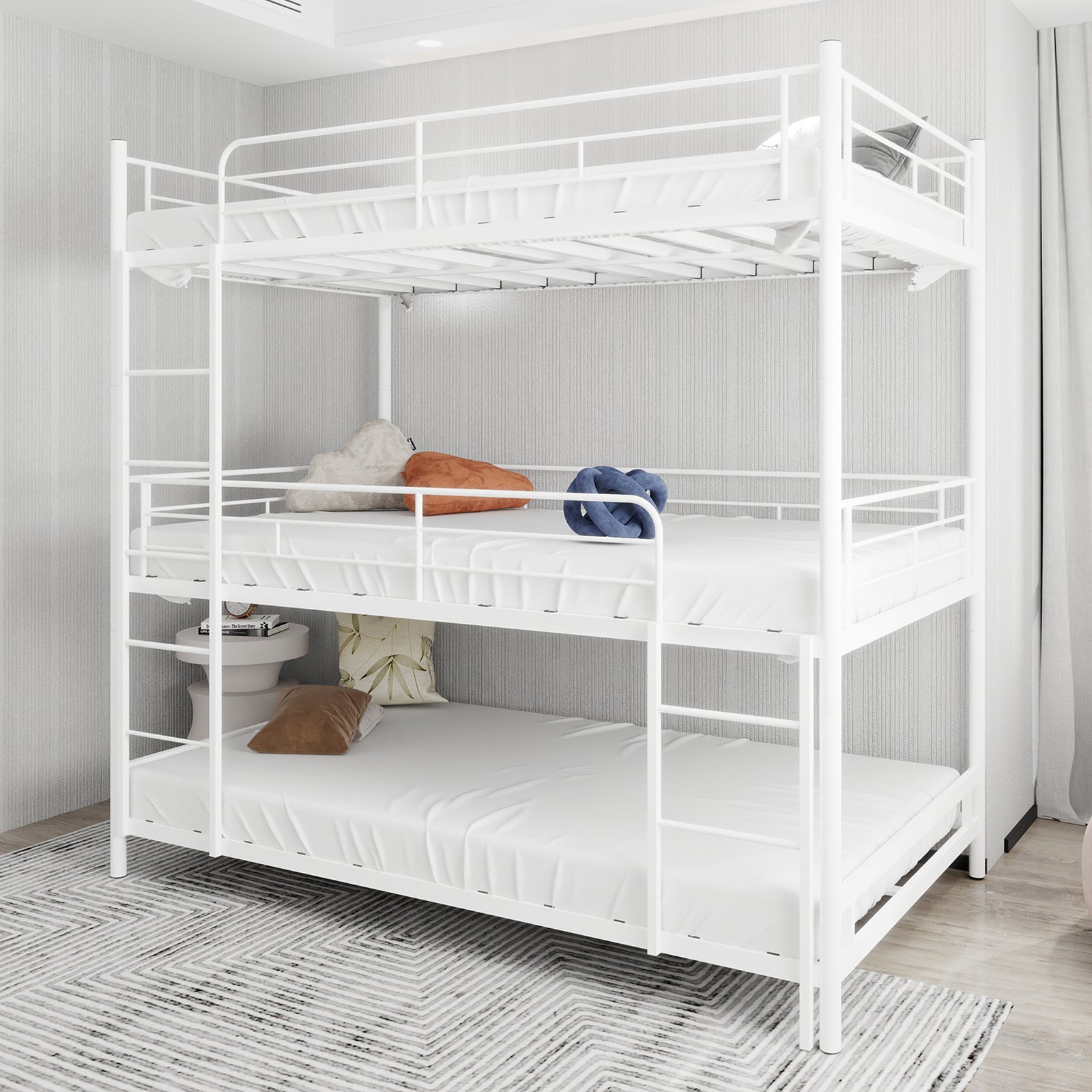 Triple Frame Bed, Heavy-Duty with Built-in Ladder & Railing, Metal