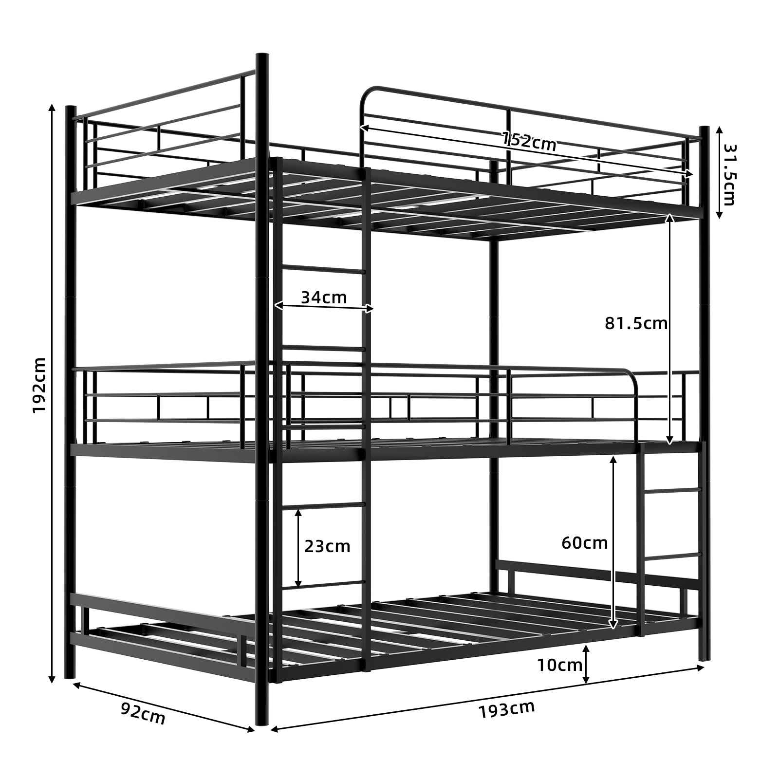 Sturdy Construction: Our triple bunk bed frame is constructed of high-quality, solid metal, ensuring unsurpassed durability and stability for long-term use, making it a great investment for any family. Whether you're a child or an adult, this triple bunk bed will give you peace of mind with its superior strength and reliability.