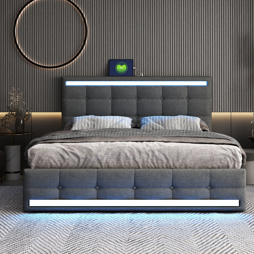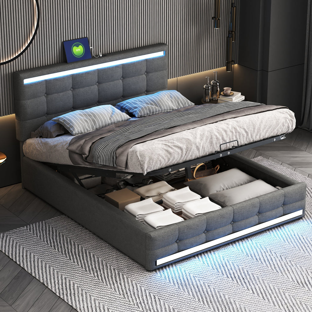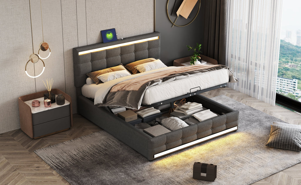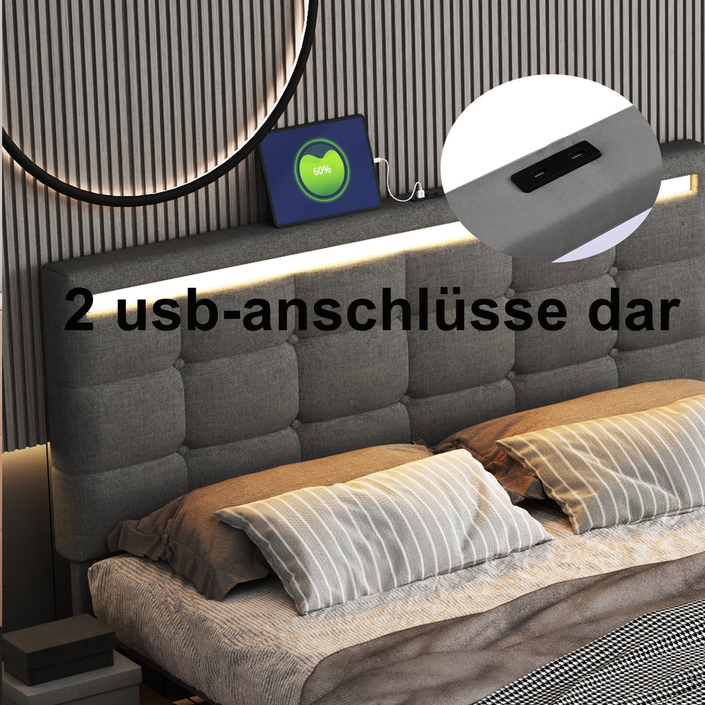 Upholstered Bed 140*200, LED Frame with Storage & USB, Adjustable Headboard, Linen Fabric Gray