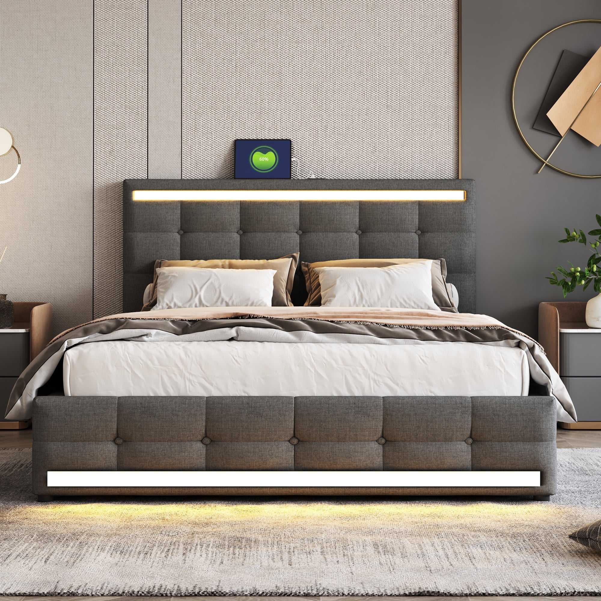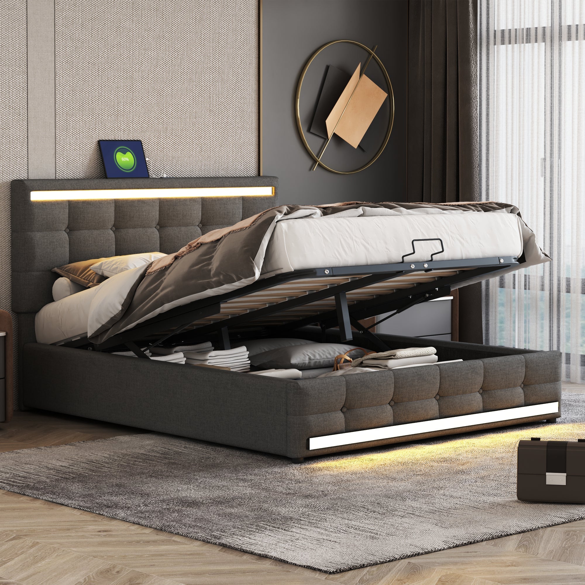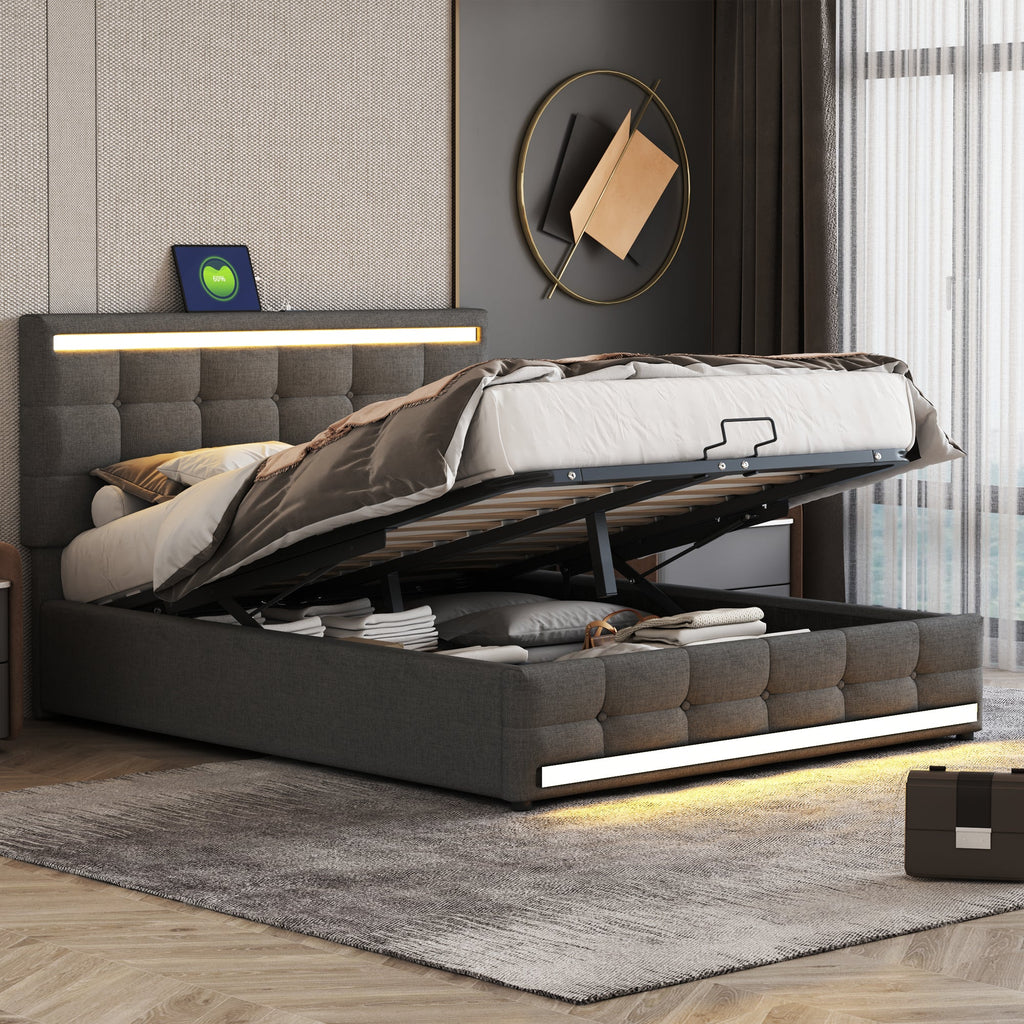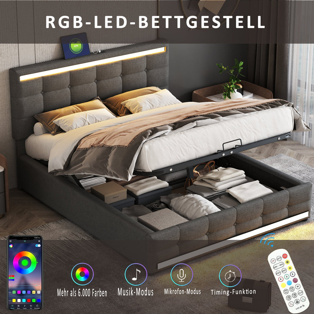 Upholstered Bed 140*200, LED Frame with Storage & USB, Adjustable Headboard, Linen Fabric Gray