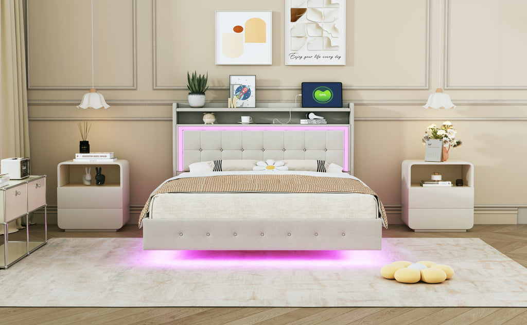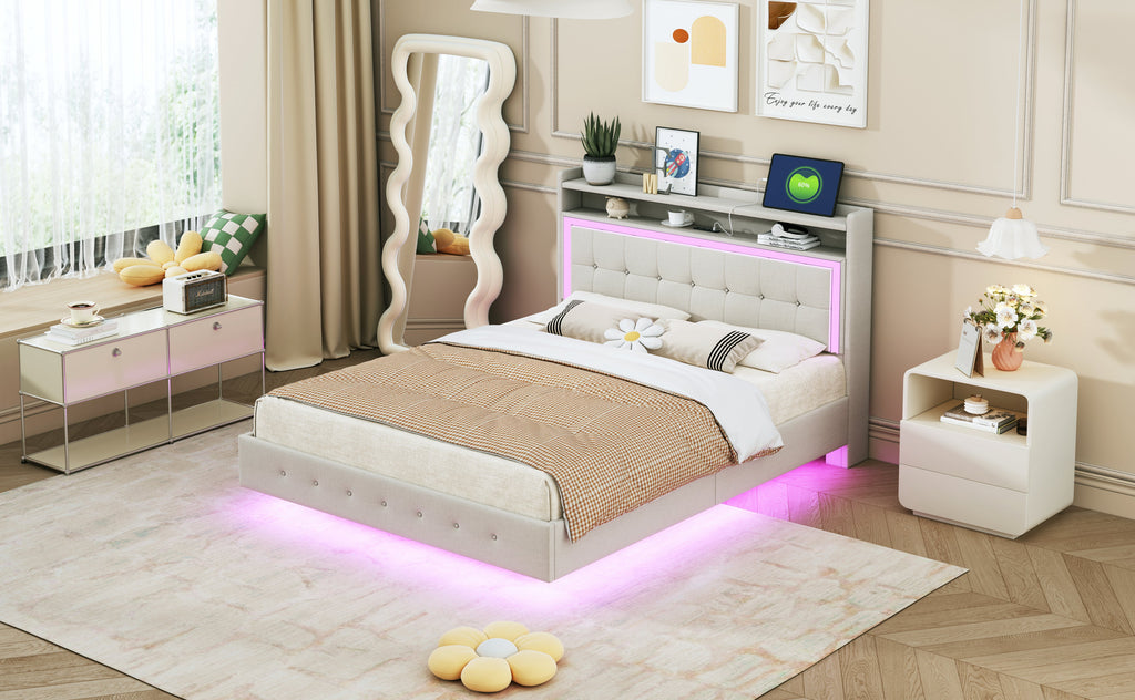 Upholstered Bed 140*200 with USB & LED Light, Linen Beige