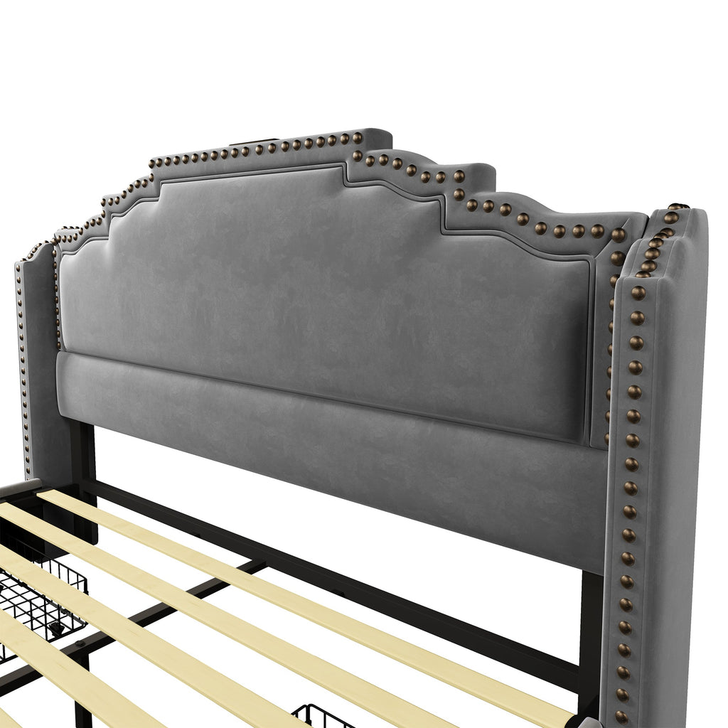 Upholstered Bed 140x200, Double with 4 Drawers, LED & USB-C, Velvet Grey