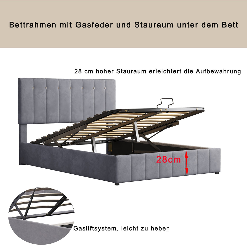 Upholstered Bed, 140x200 Double with Hydraulic Storage & Adjustable Headboard, Velvet Gray