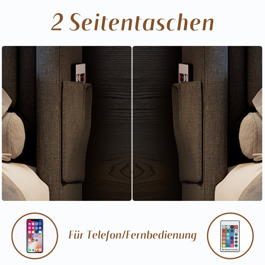 Upholstered Bed, 140x200 Double with LED Headboard, USB C & 4 Drawers, Gray Cotton
