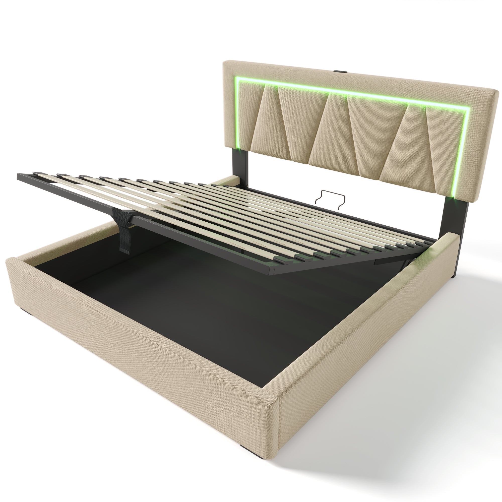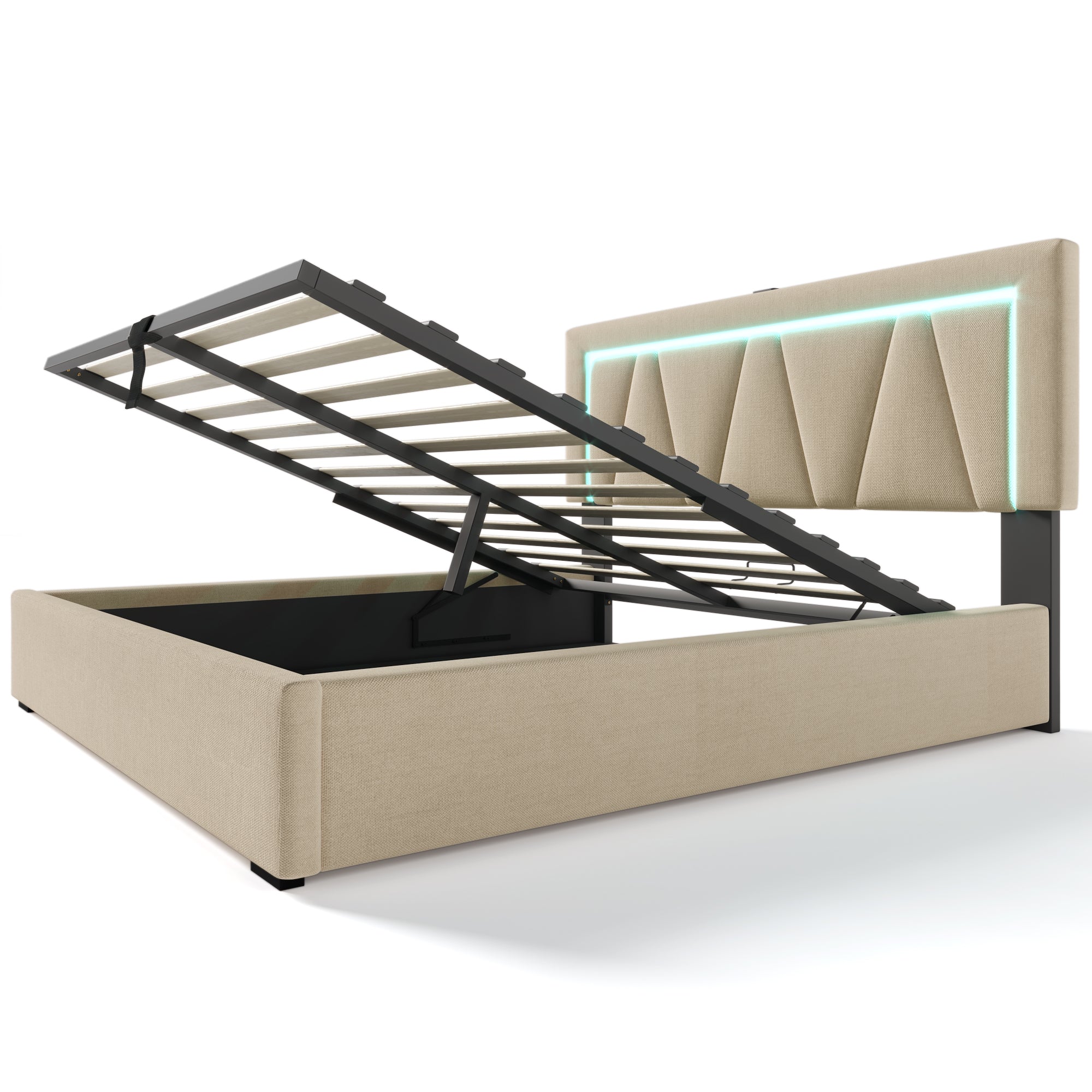 Upholstered Bed, 140x200 LED Double with USB-C Charging, Storage, Linen