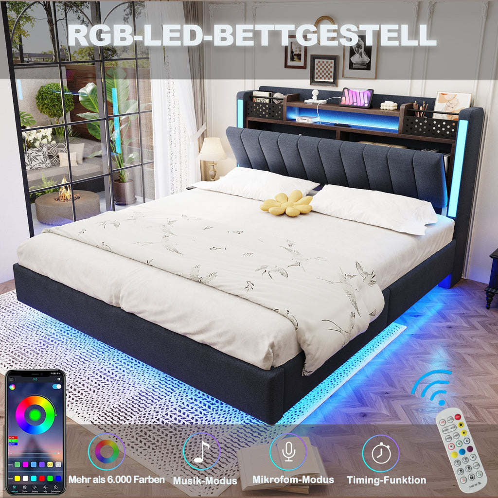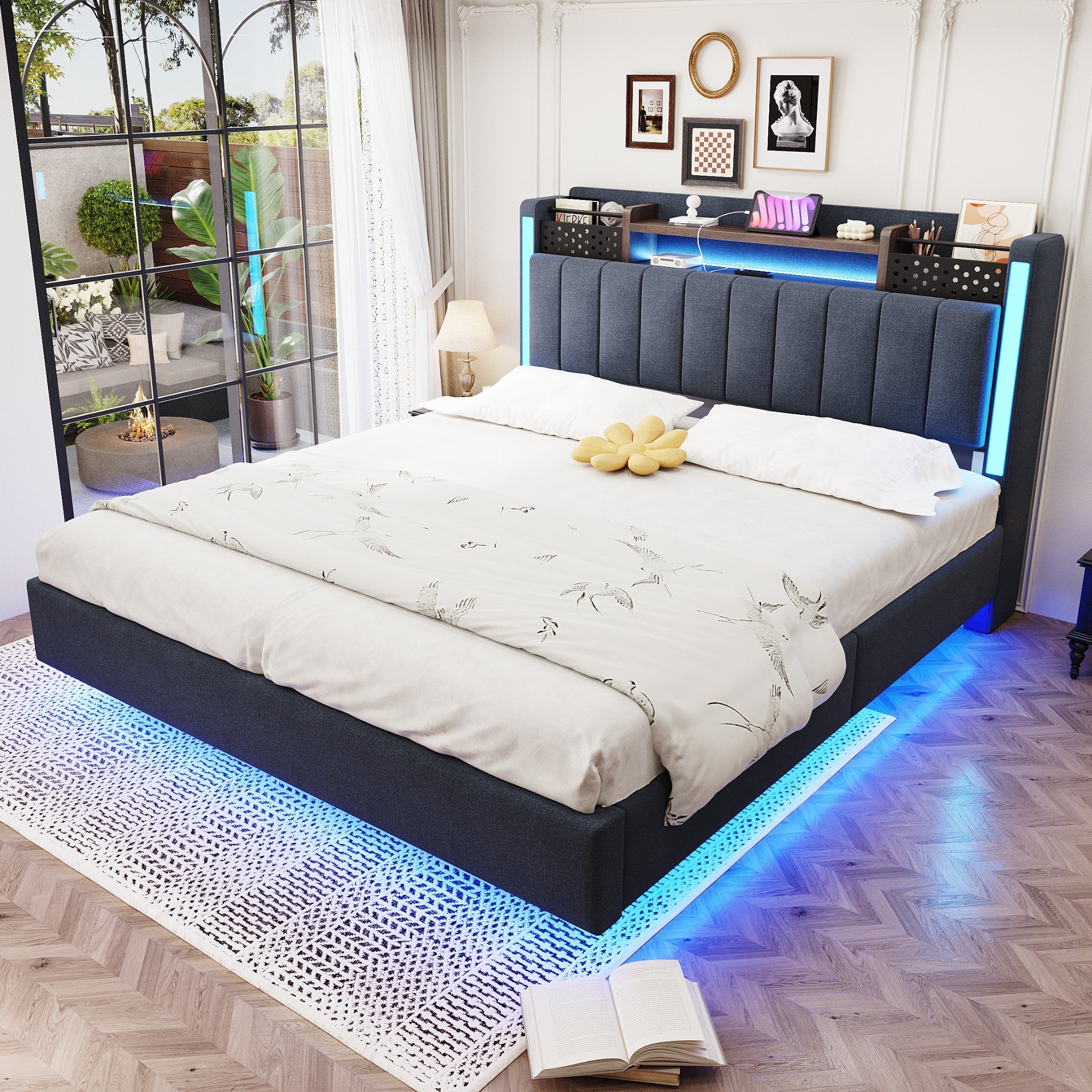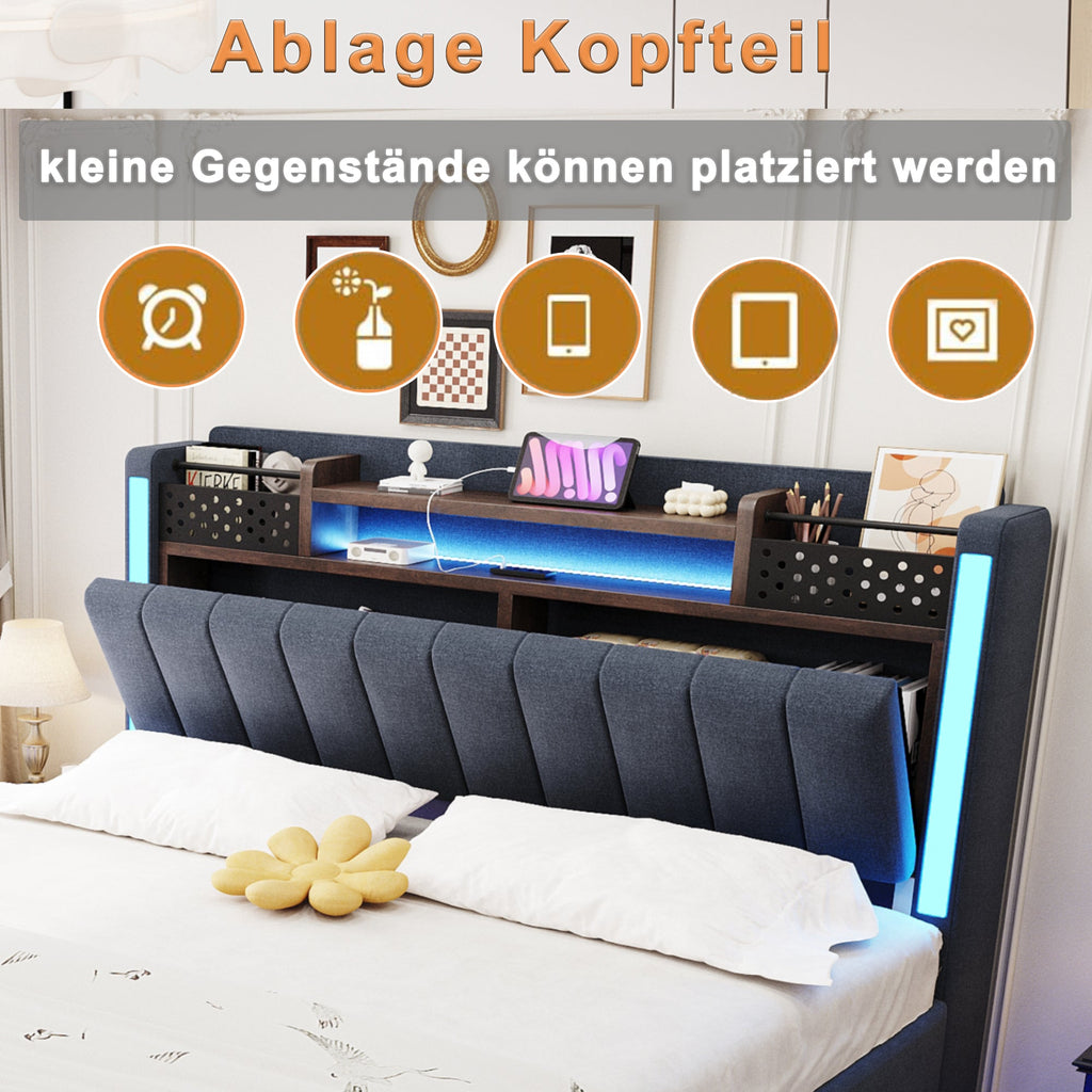 Upholstered Bed, 140x200, LED & USB, Storage Headboard, Floating Design, Grey Linen