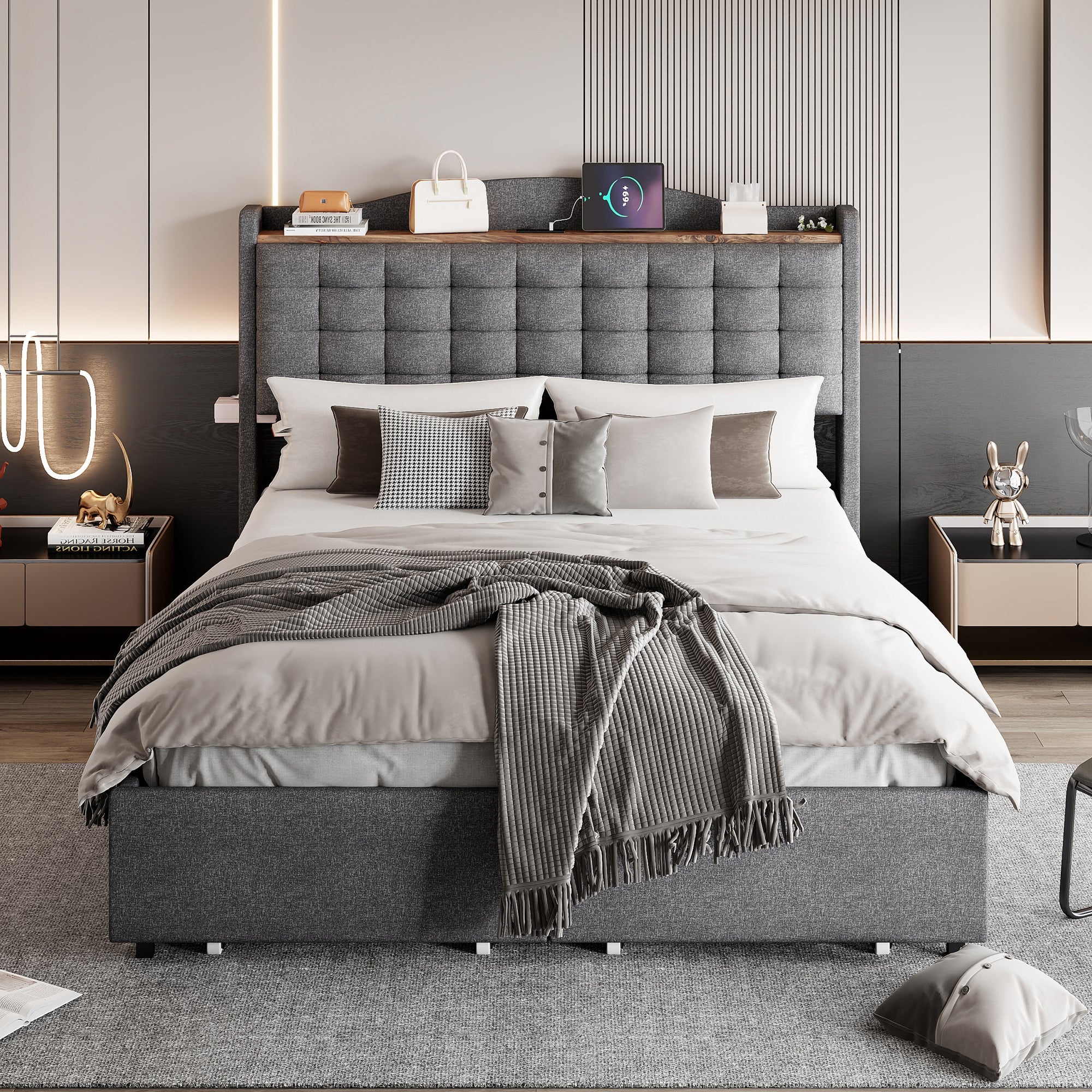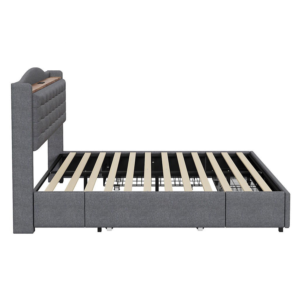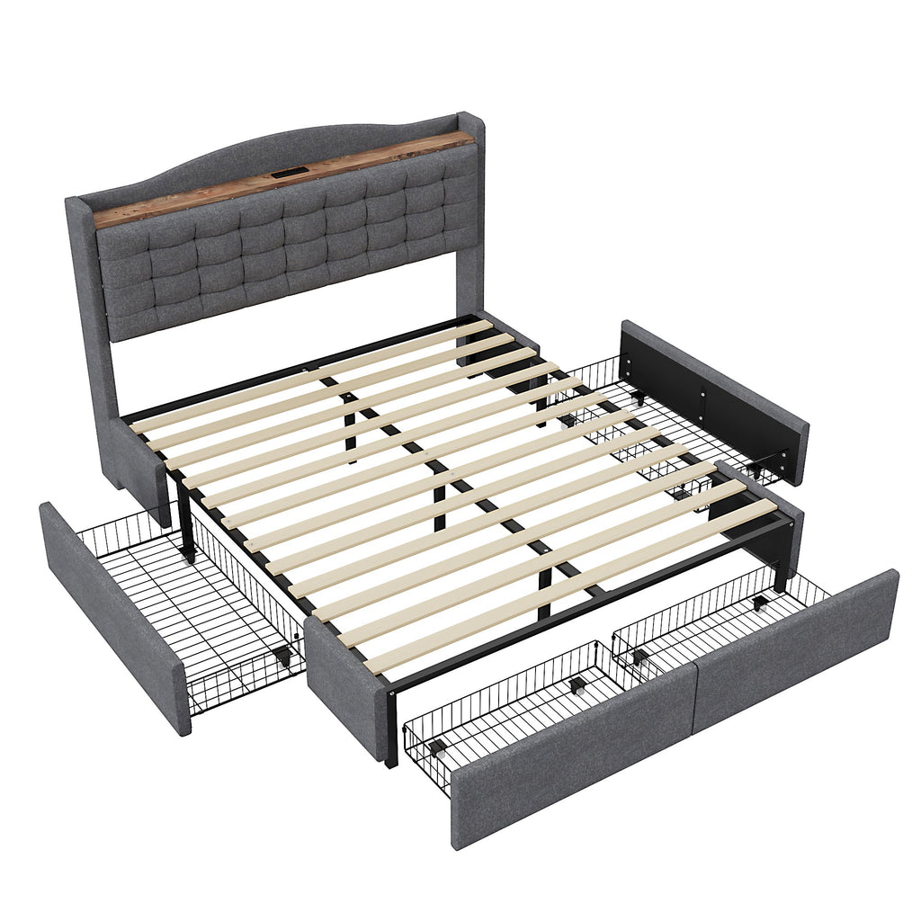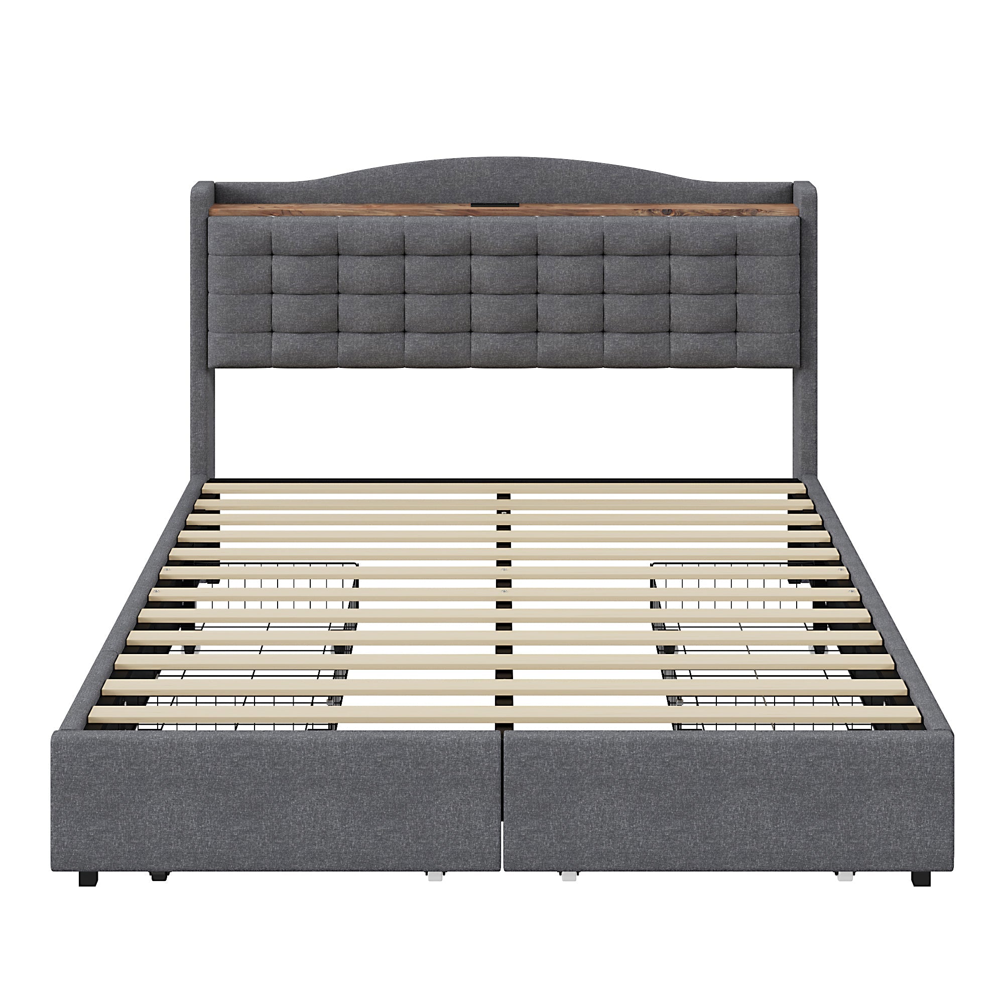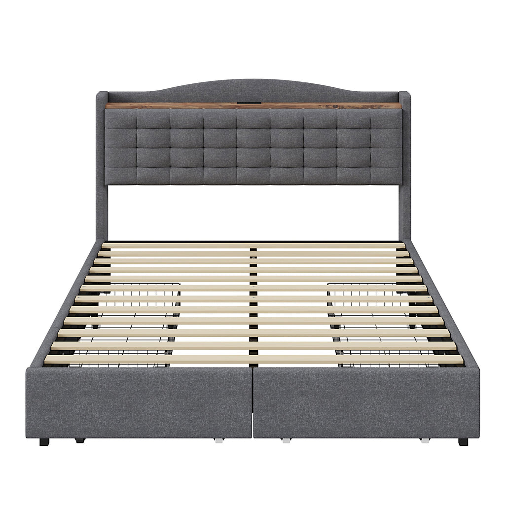 Upholstered Bed, 140x200cm Double Flat with 4 Drawers & USB Bedside Table, Gray Linen