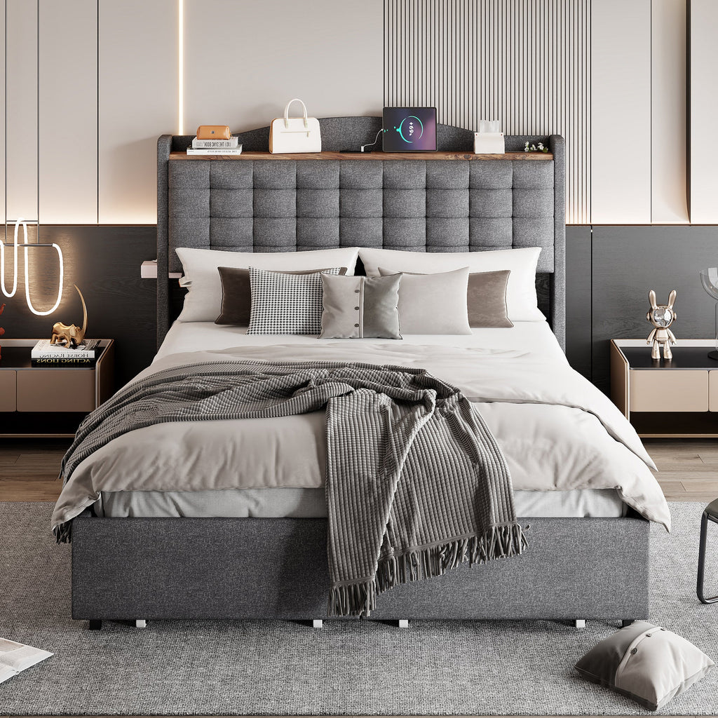 This upholstered bed for the modern living area features a headboard with a USB charging port and a convenient storage shelf, so you can keep your devices close at hand while you rest.