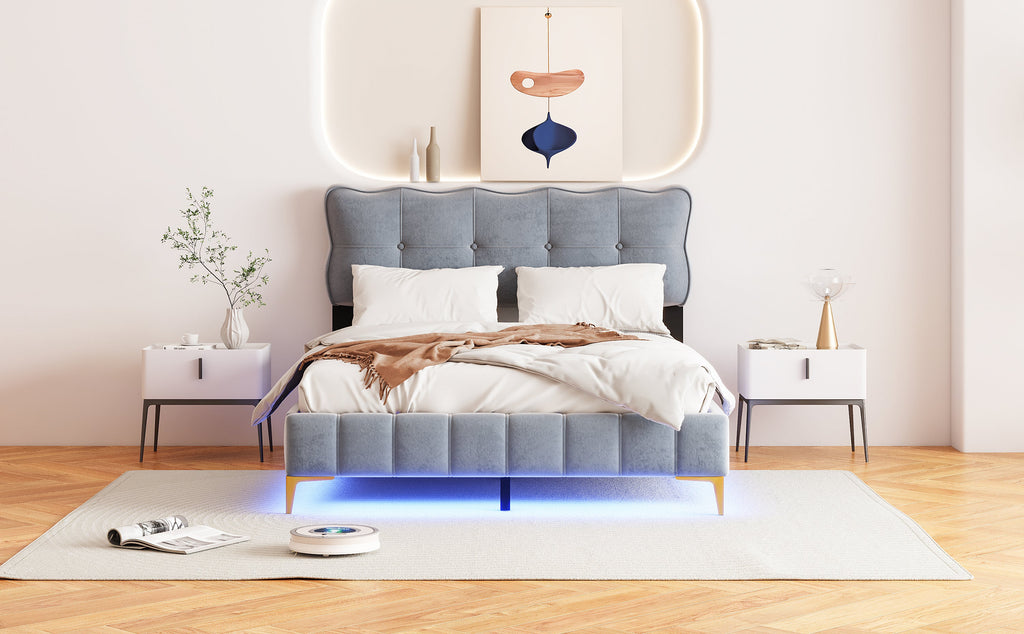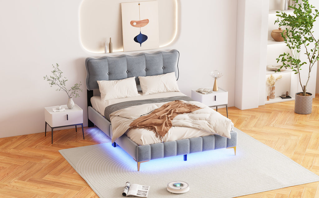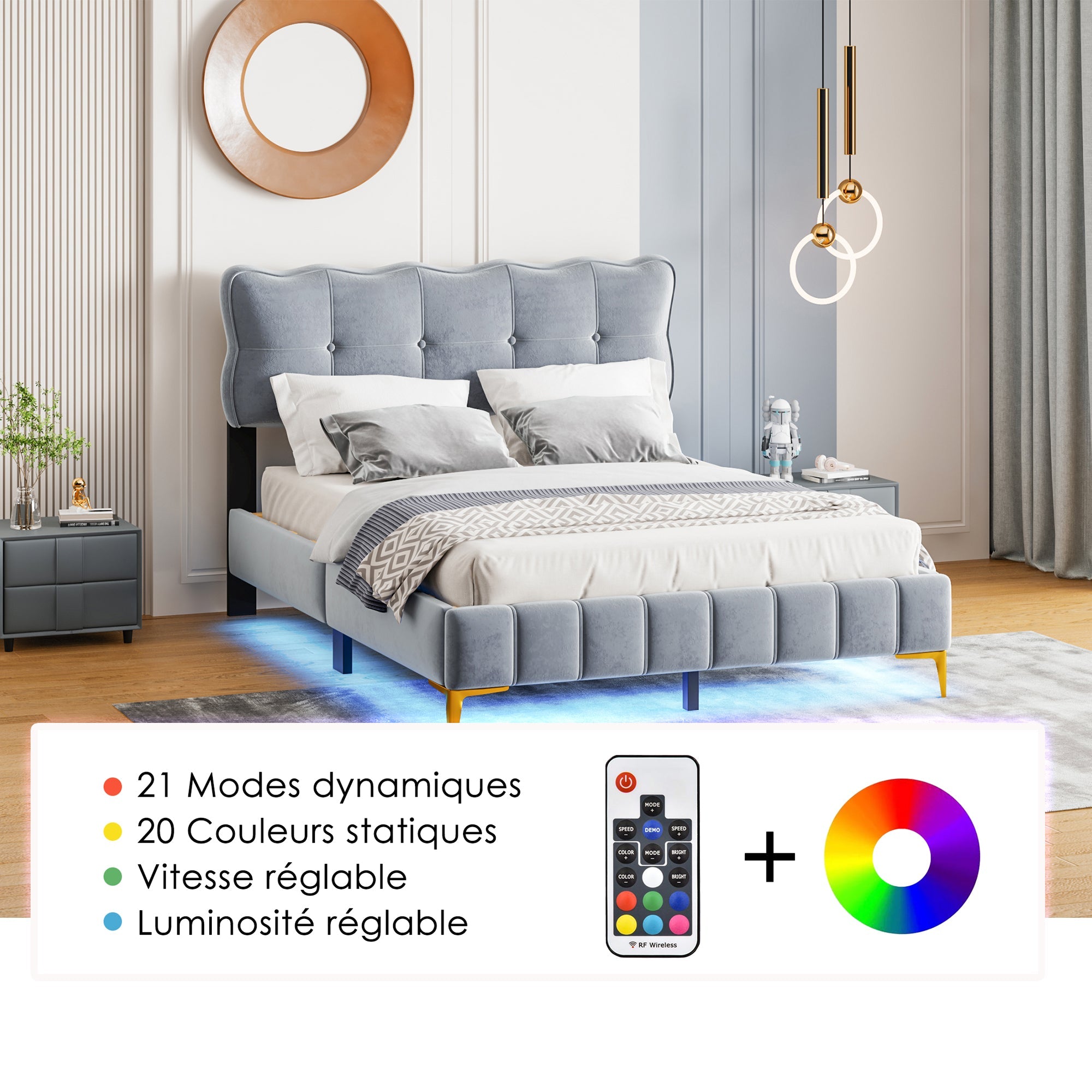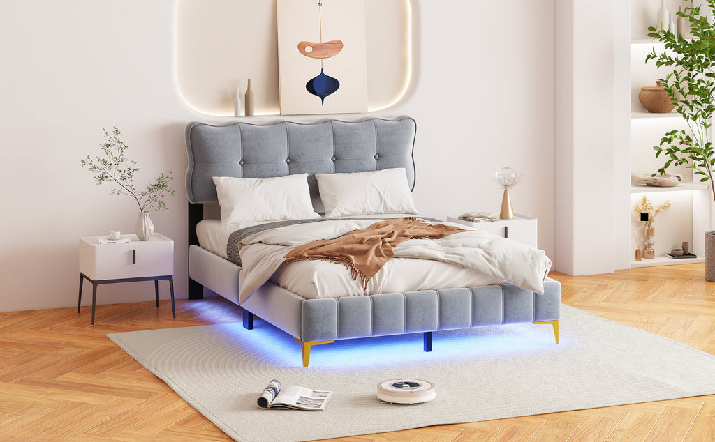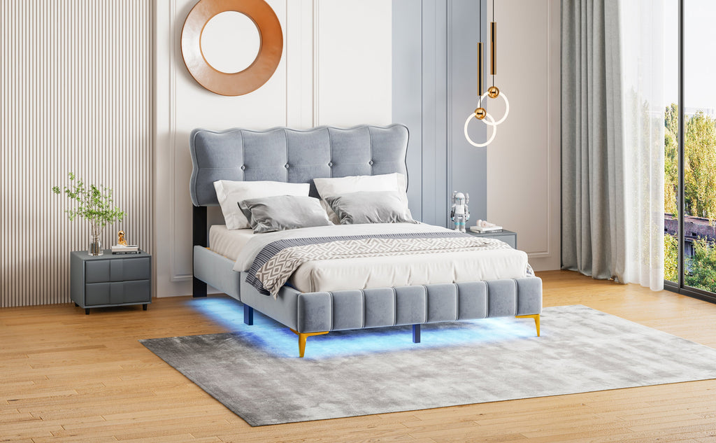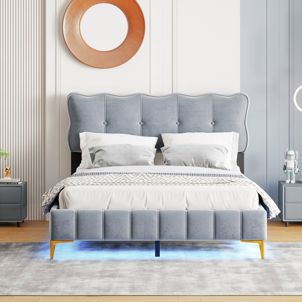 Upholstered Bed, 140x200cm Double with LED & Slatted Frame, Velvet Fabric, Grey