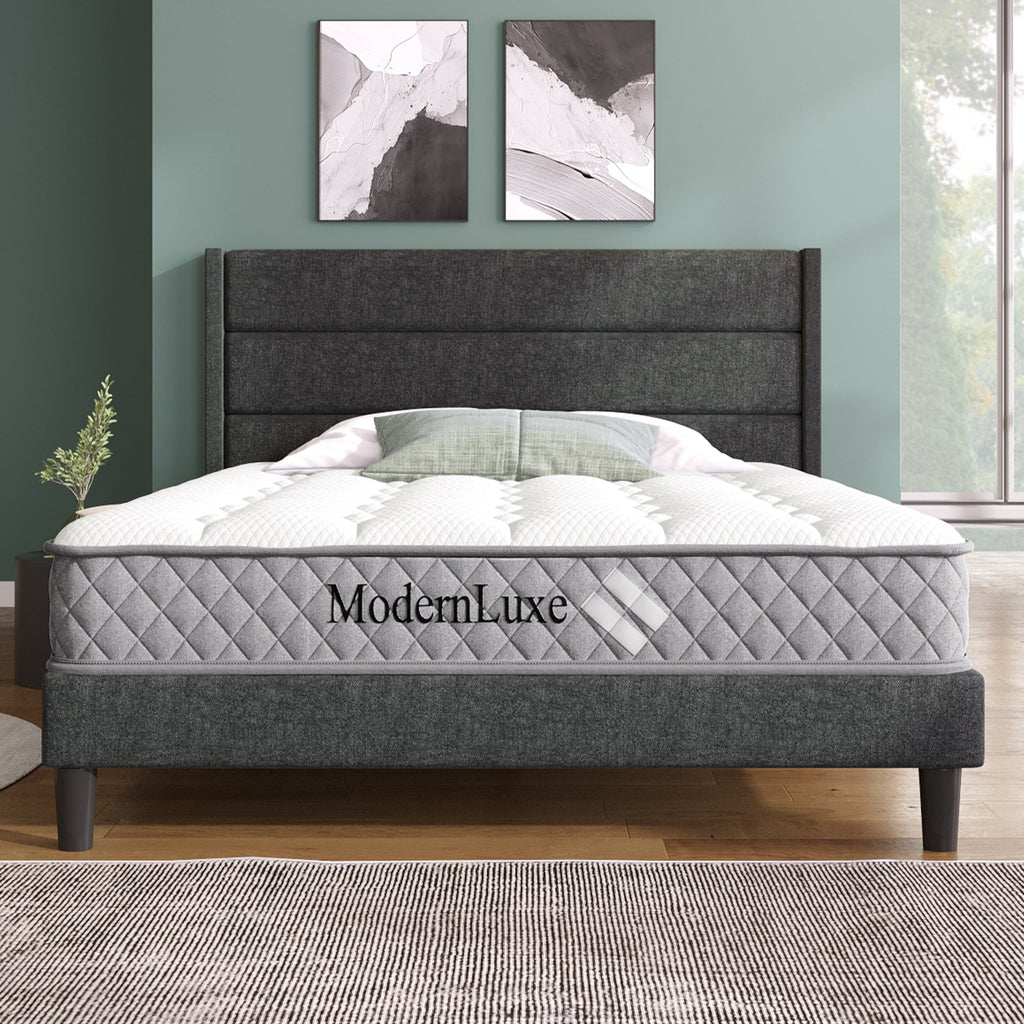 Upholstered Bed 140x200cm, Double with Slatted Frame & Headboard, Dark Grey Linen