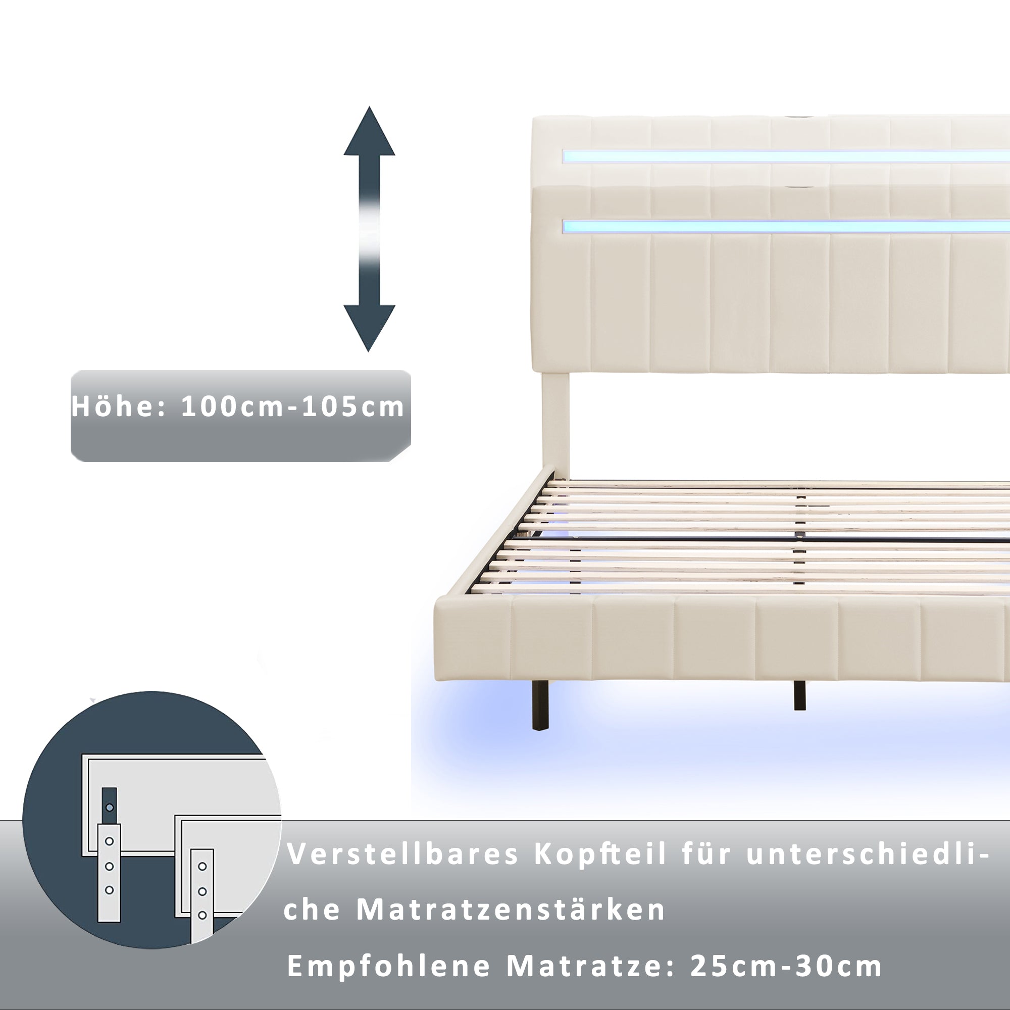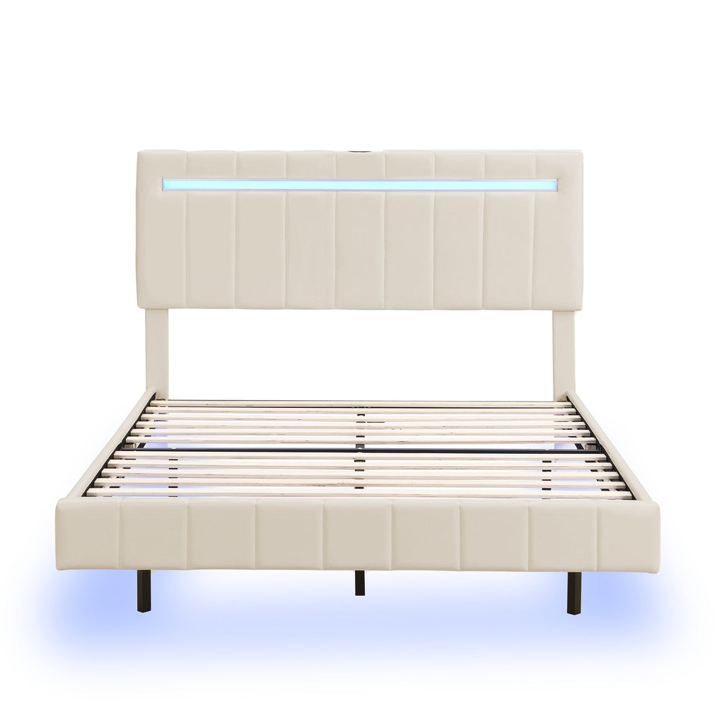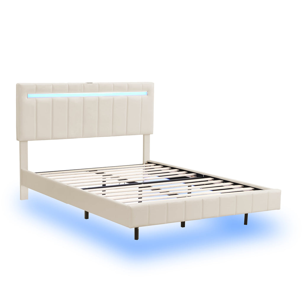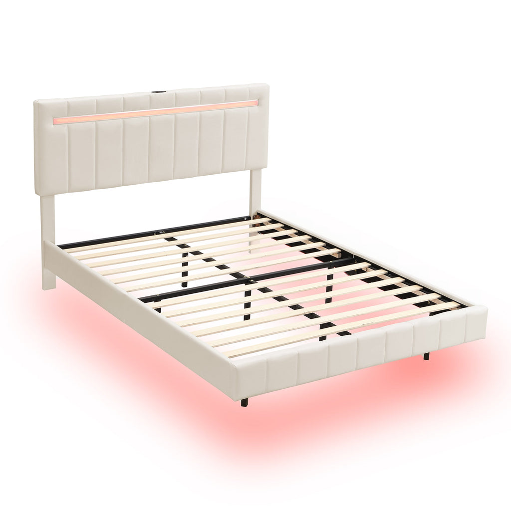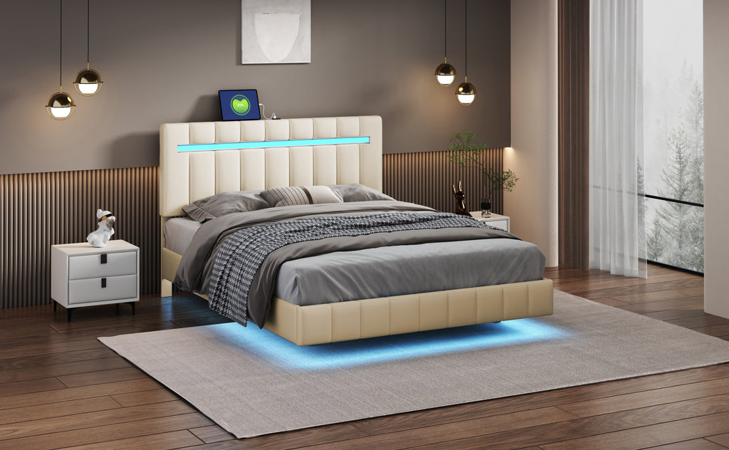 Upholstered Bed 140x200cm, Floating Frame with LED & Headboard, Beige Linen