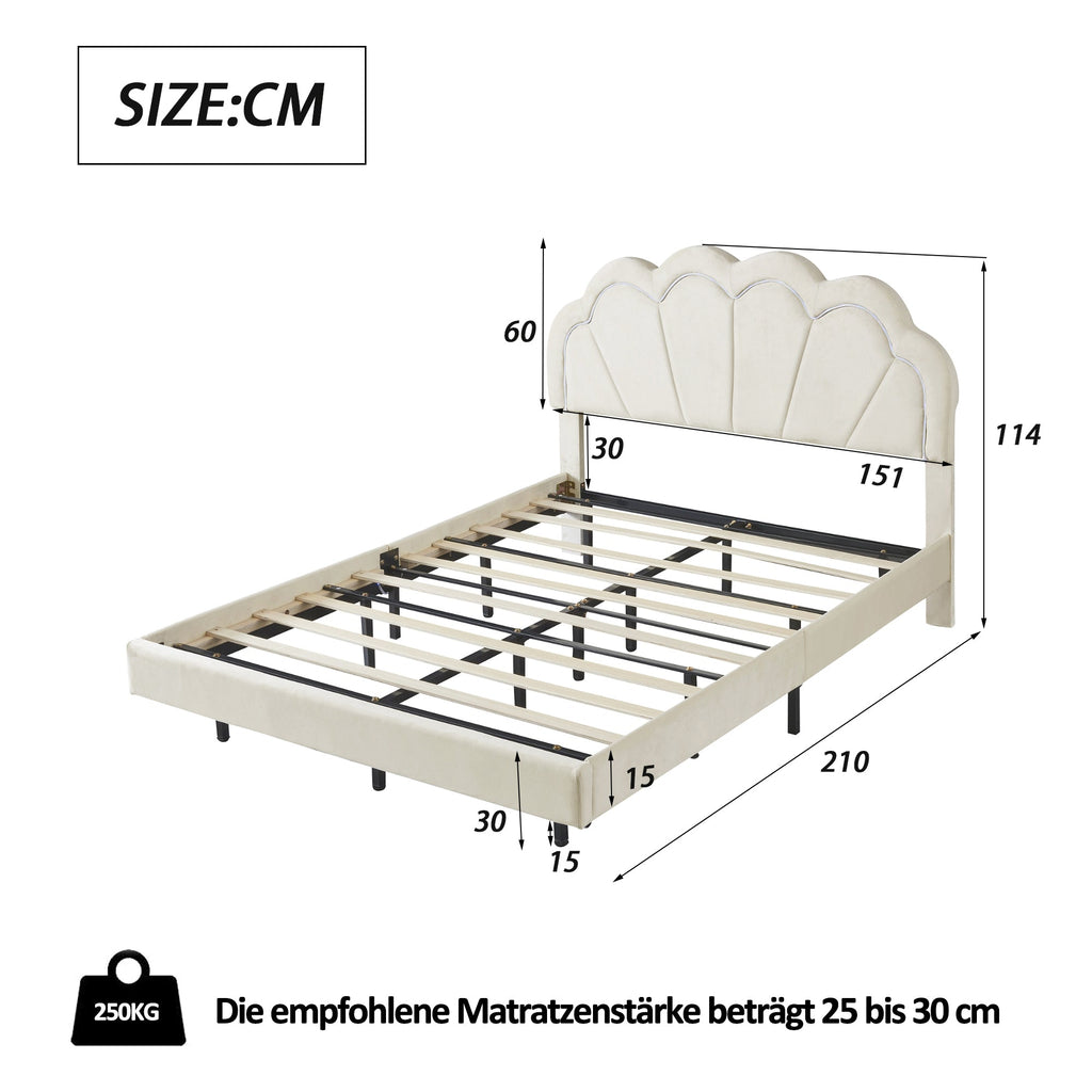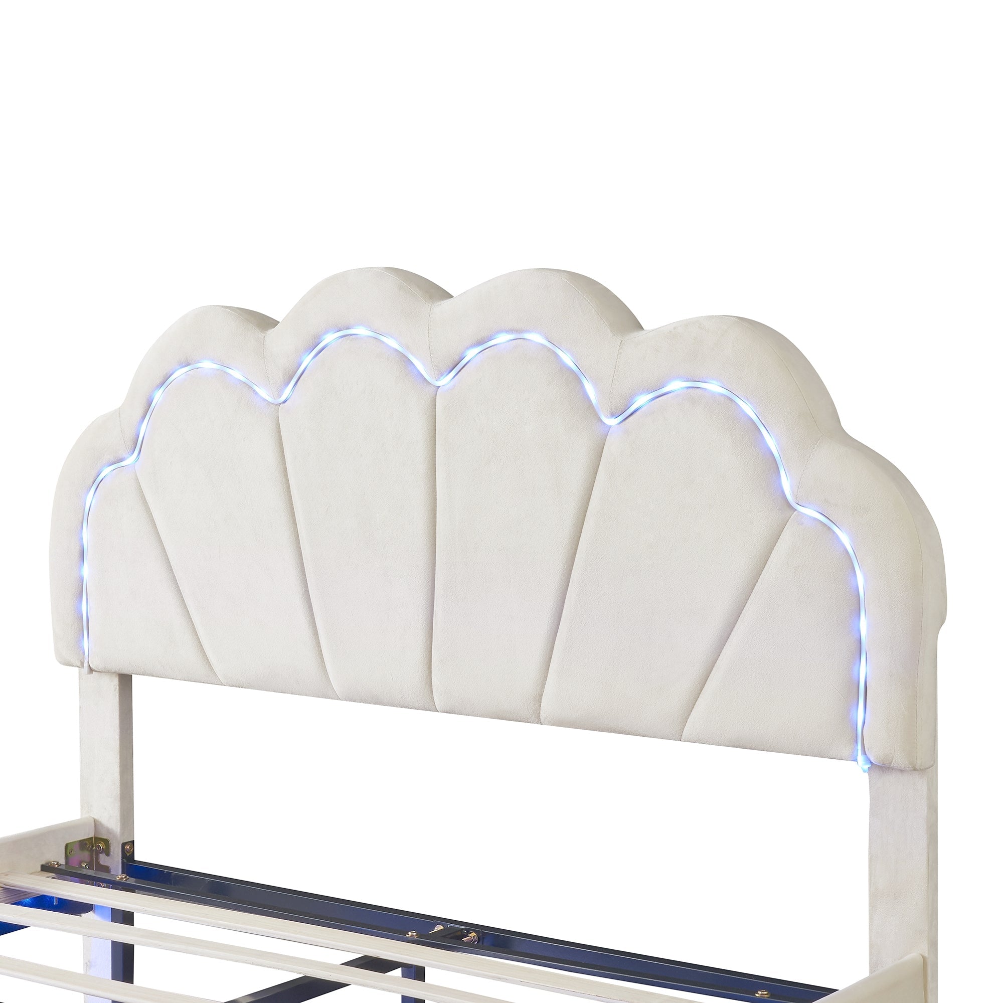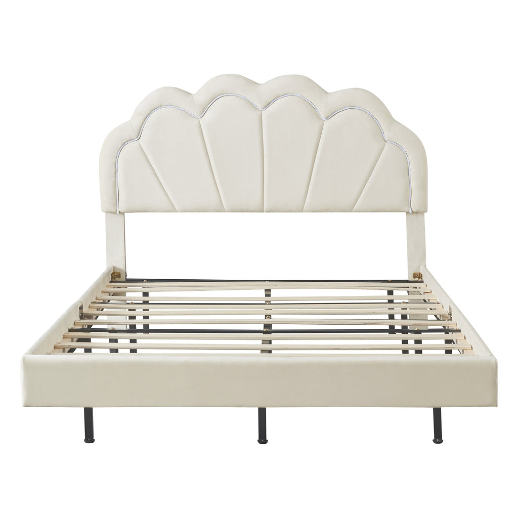 Upholstered Bed, 140x200cm Floating Frame with LED & Headboard, Beige Velvet Fabric