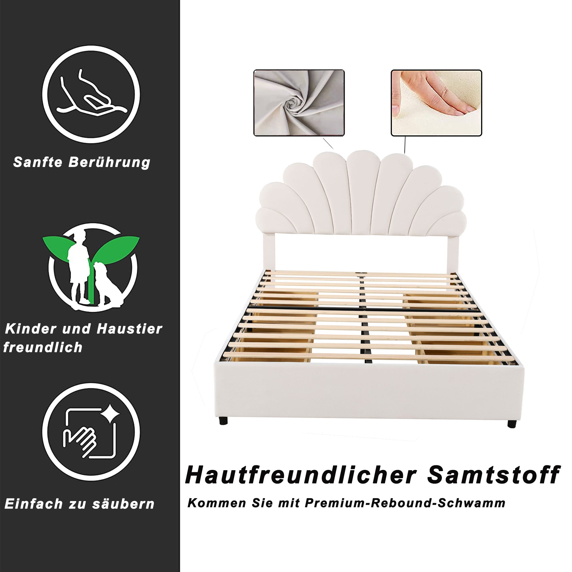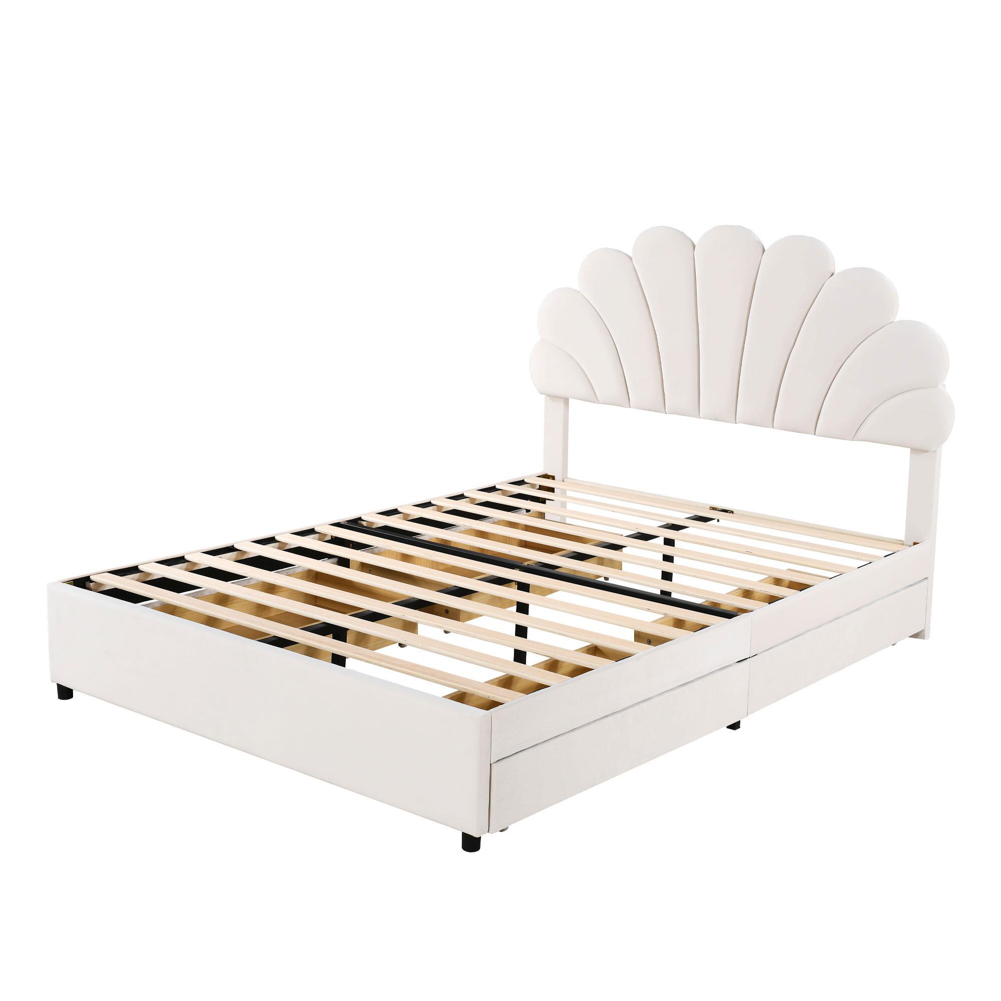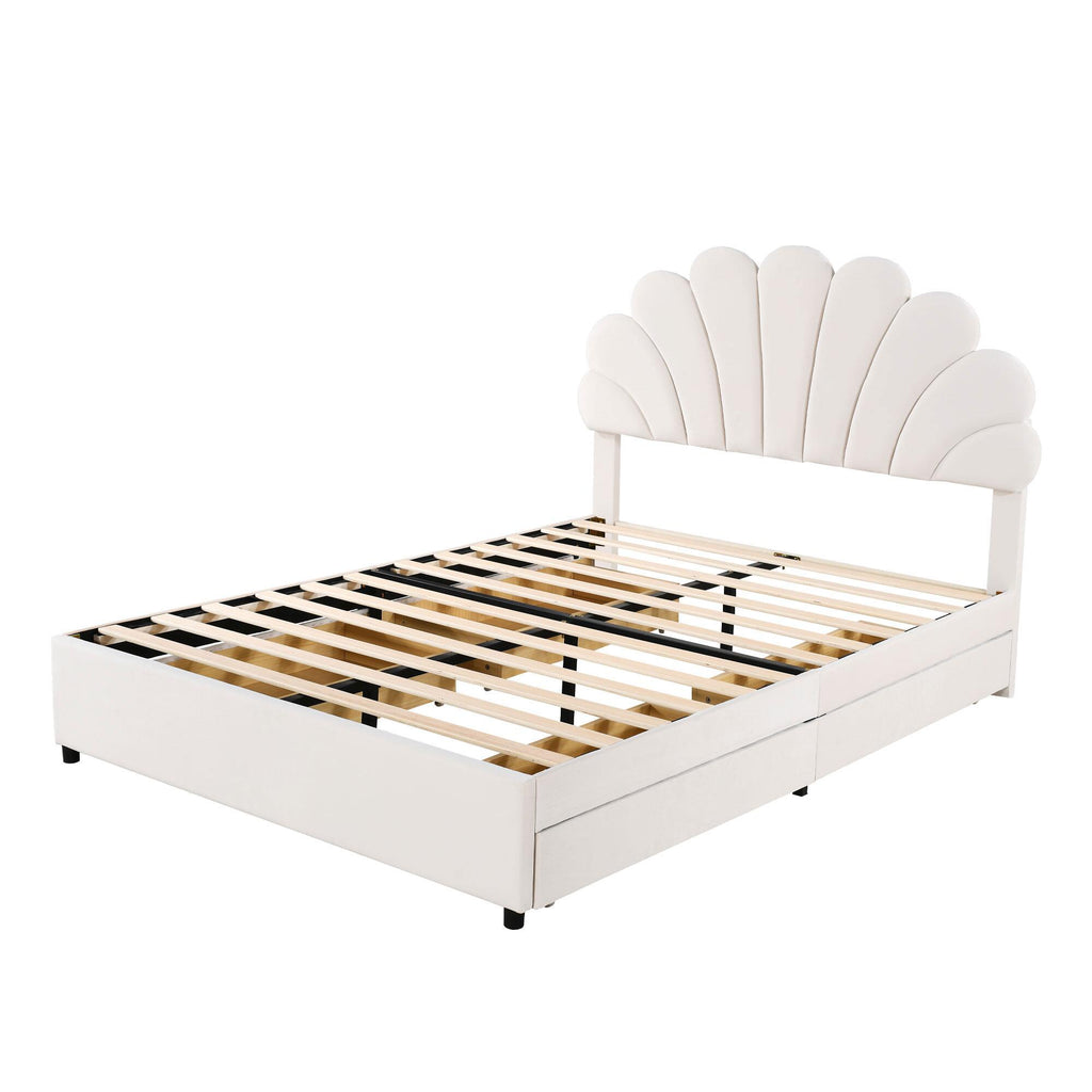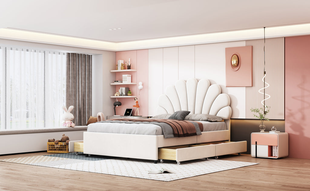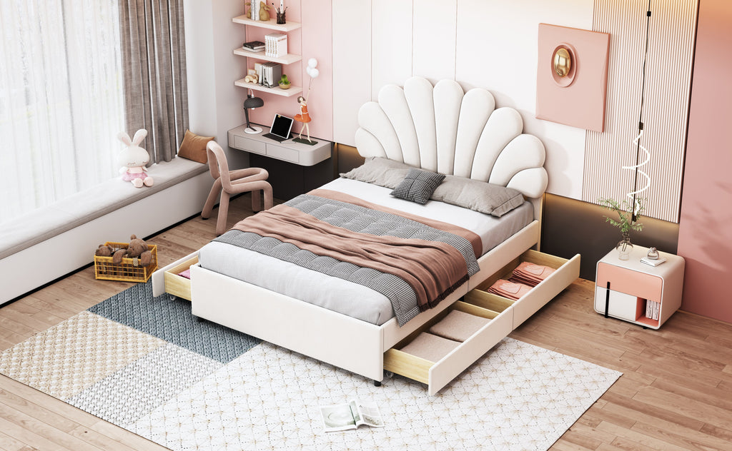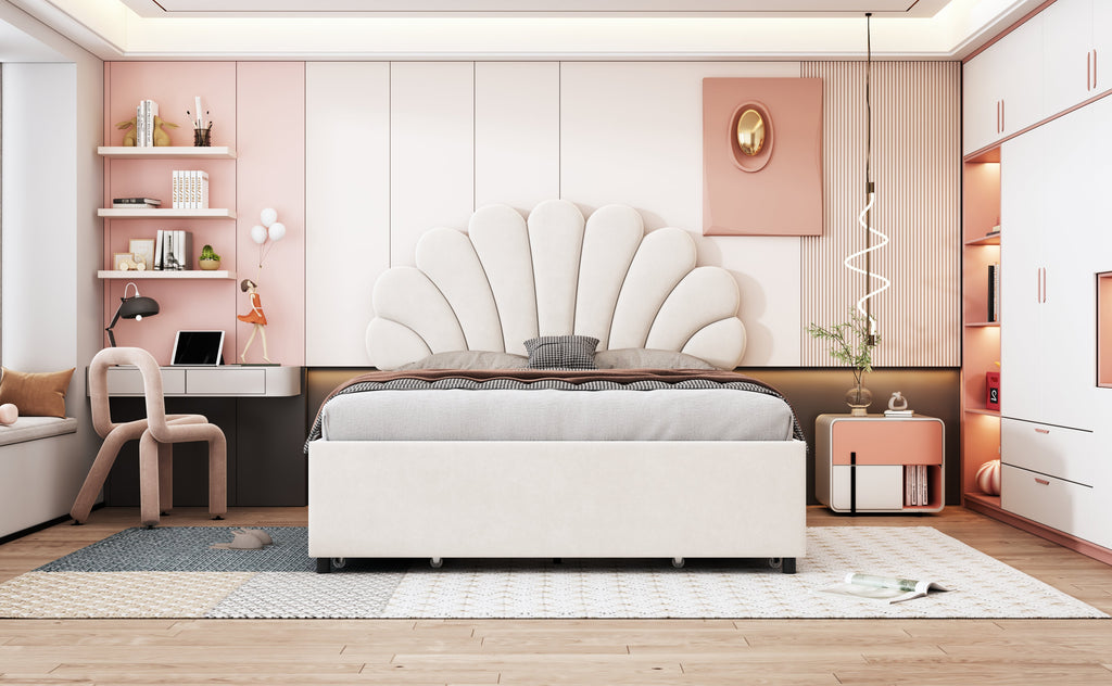 The bed's distinctive feature is its charming petal-shaped backrest. This unique headboard, modeled after delicate flower petals, adds a whimsical and sophisticated touch to your room. It is padded with soft foam cushions that provide a comfortable backrest for reading or relaxing. This upholstered bed features four drawers to keep your room organized.