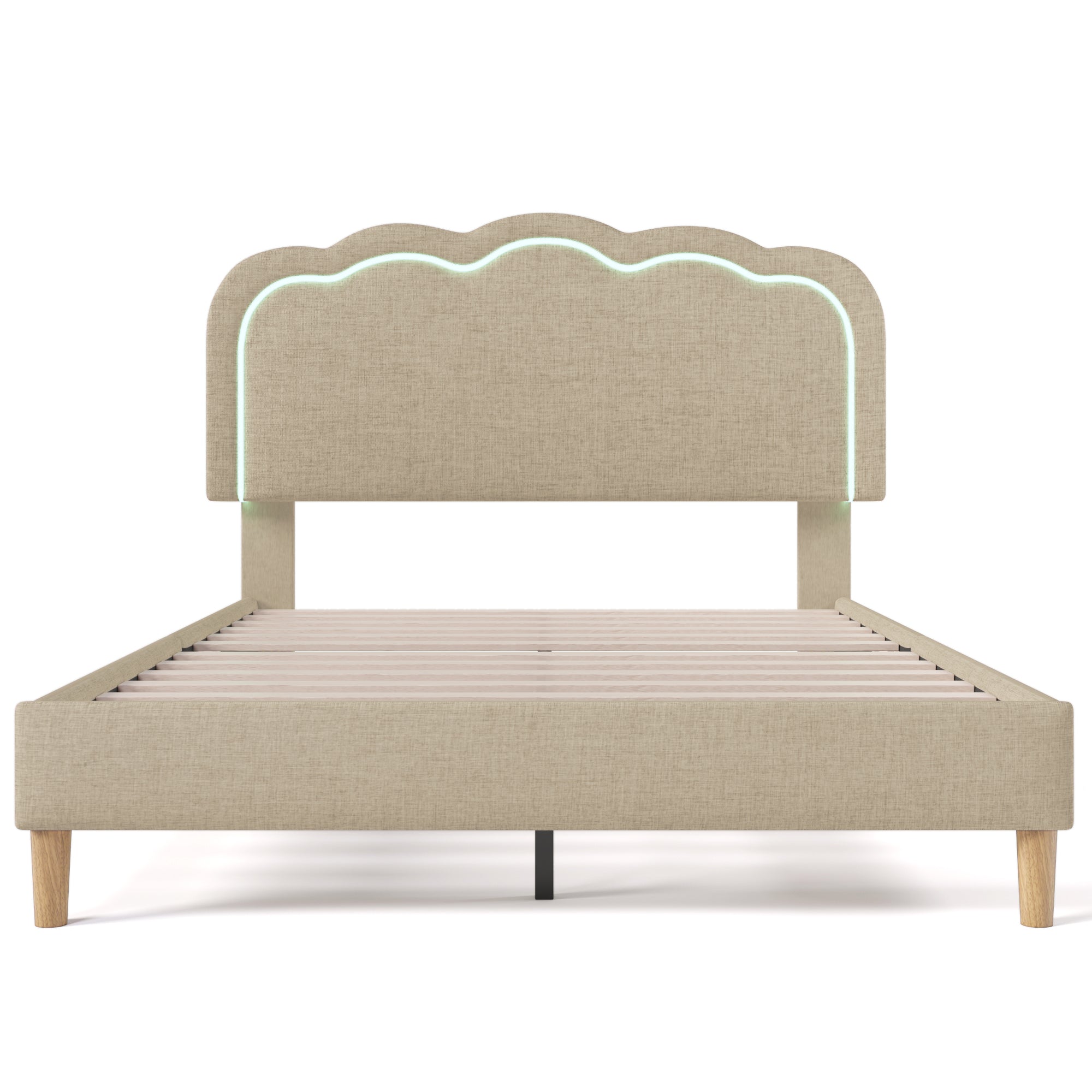 Upholstered Bed, 140x200cm LED Double with Adjustable Headboard, Beige Linen