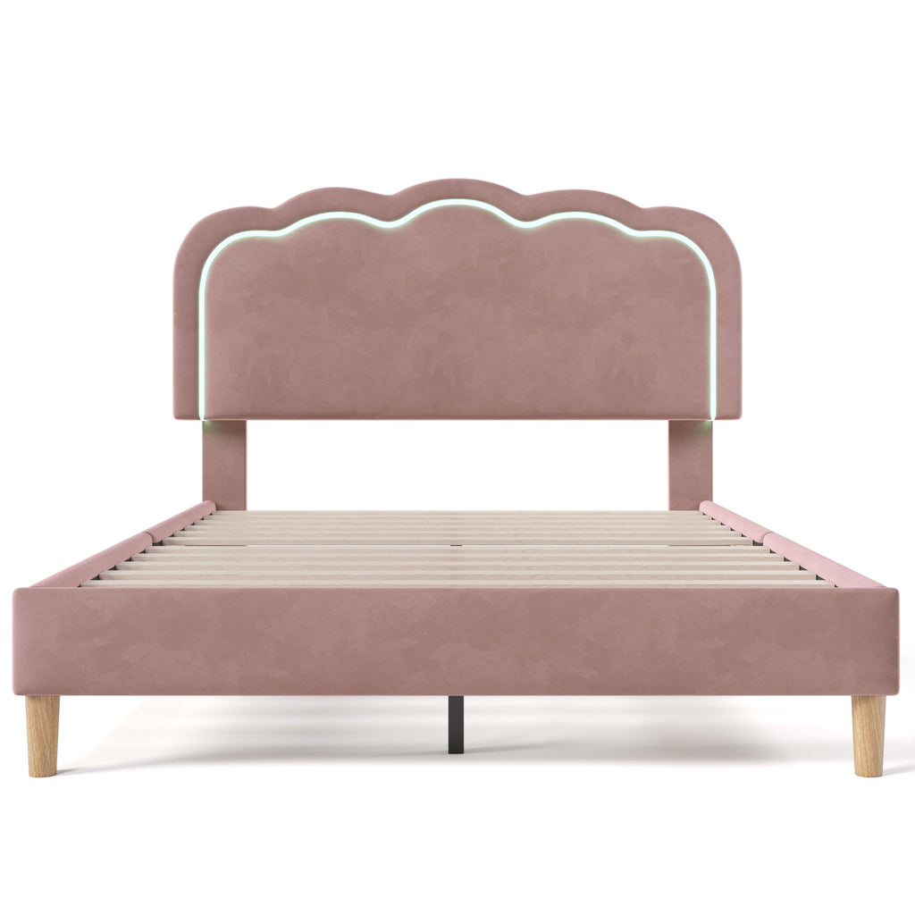 Upholstered Bed, 140x200cm LED Double with Adjustable Headboard, Pink Velvet