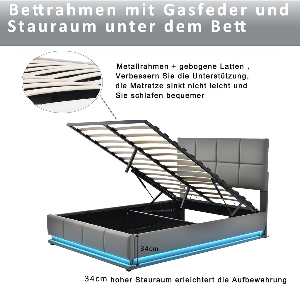 Upholstered Bed, 140x200cm LED Lighting & Liftable Storage, Faux Leather Gray