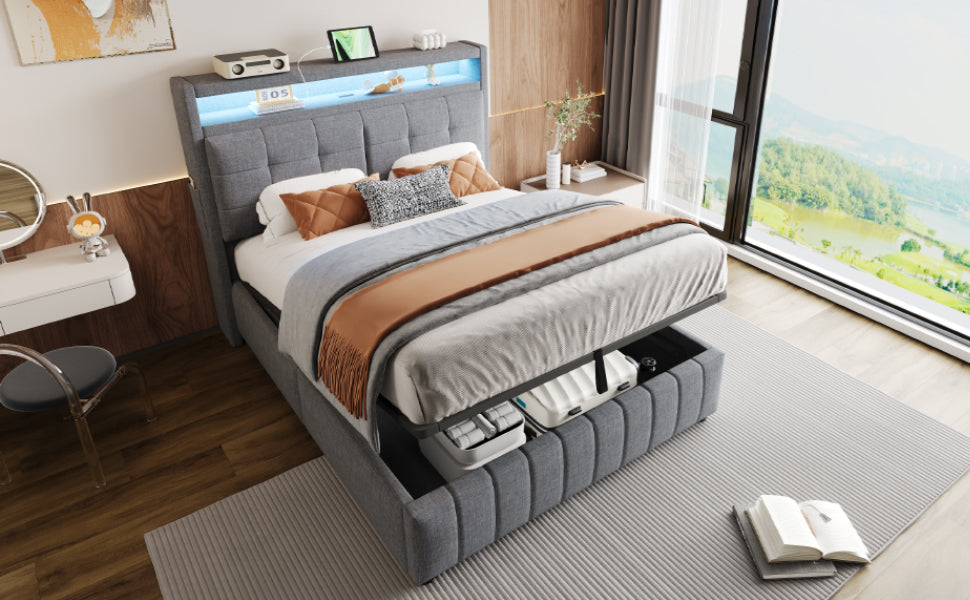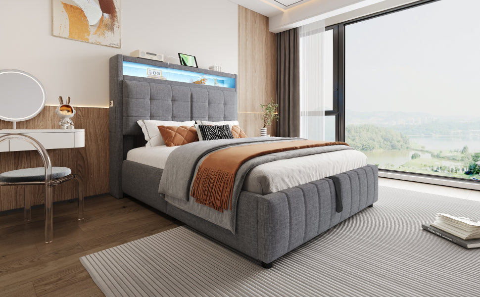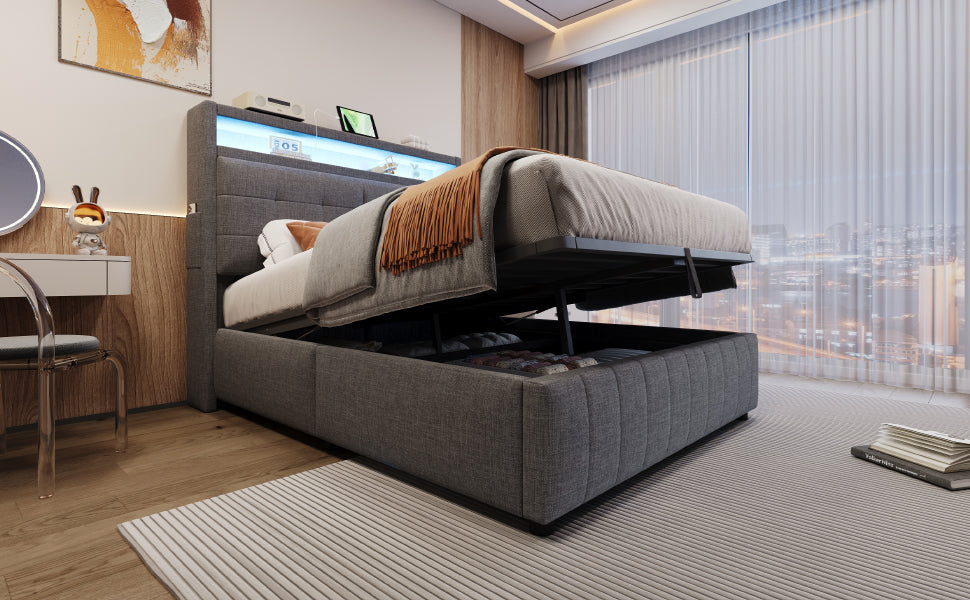 Upholstered Bed 140x200cm, LED & USB, Hydraulic Storage, Linen Fabric Gray