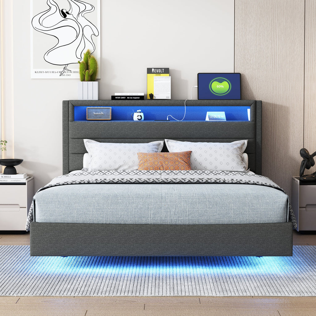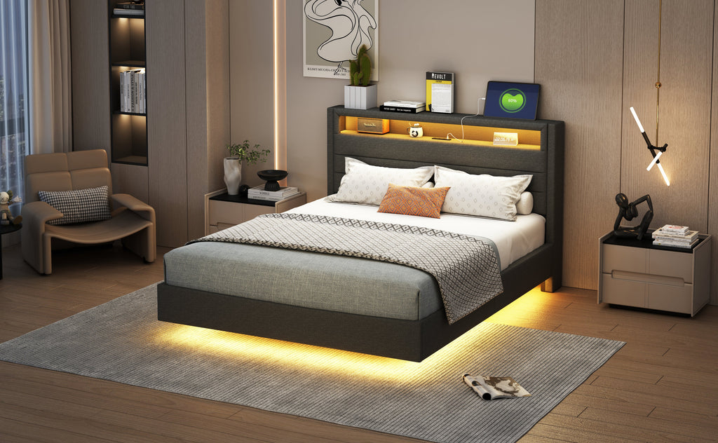 Upholstered Bed 140x200cm, USB & LED, Reversible Headboard, Linen Fabric Grey
