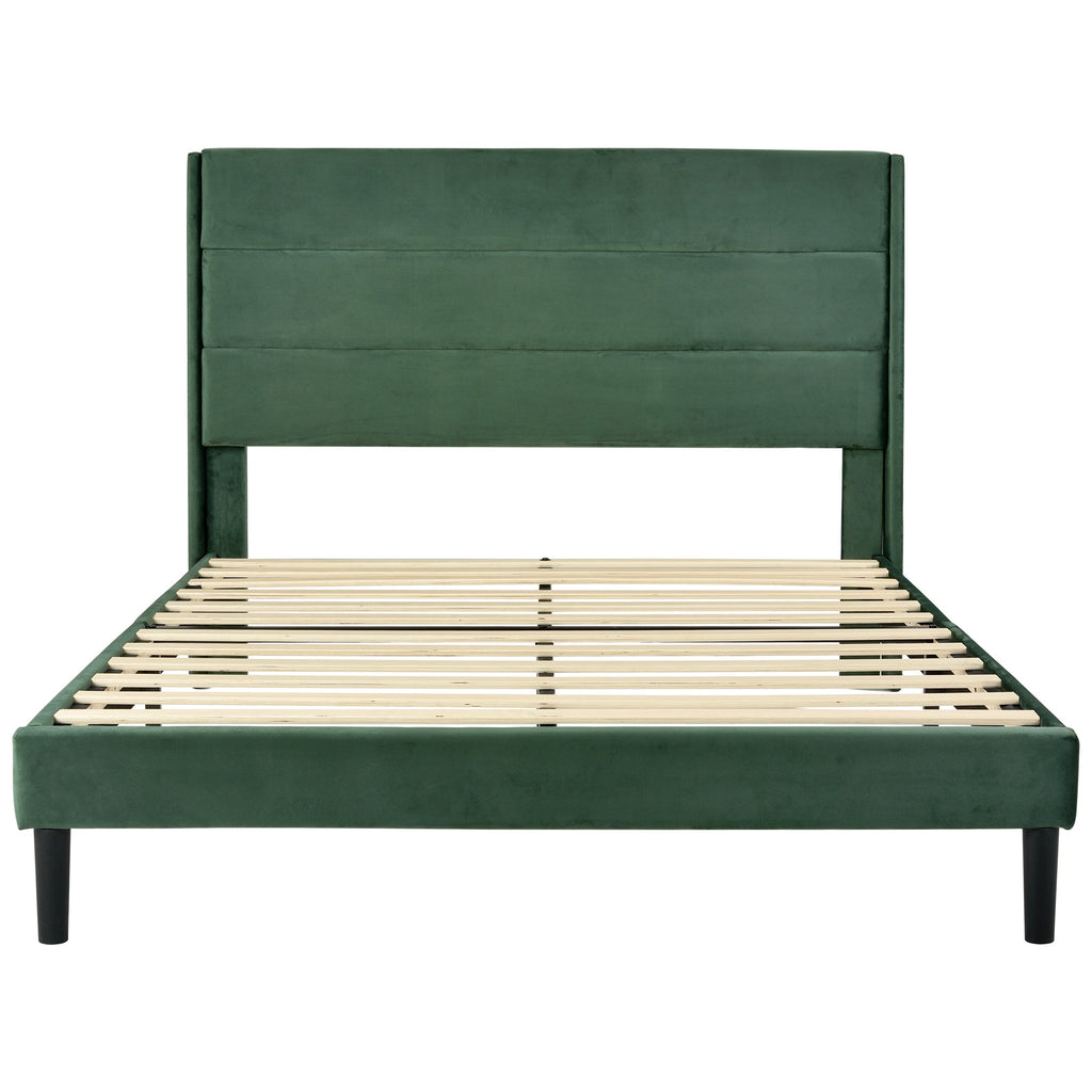Overall Dimensions: 146x210x111 cm (WxLxH). Panel Material: Velvet. Color: Dark Green. Max. User Weight: 181 kg. Box Spring Required: No. Assembly Required: Yes. Package Contents: Bed Frame + Slatted Base. Unique Design: All-Match. Applicable Mattress: 140x200 cm. Package Quantity: 1.