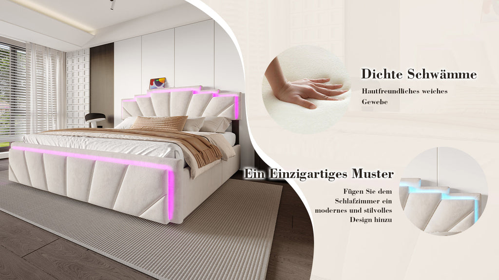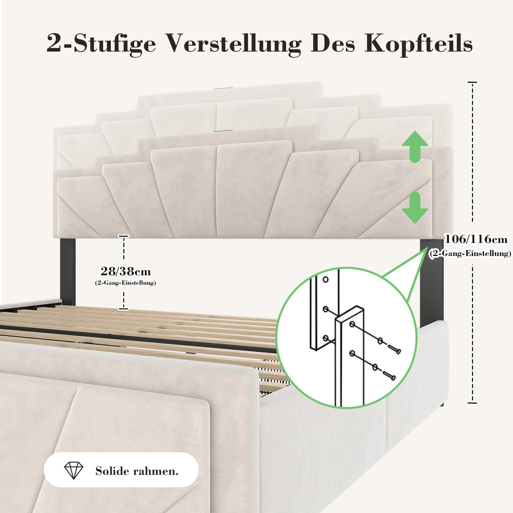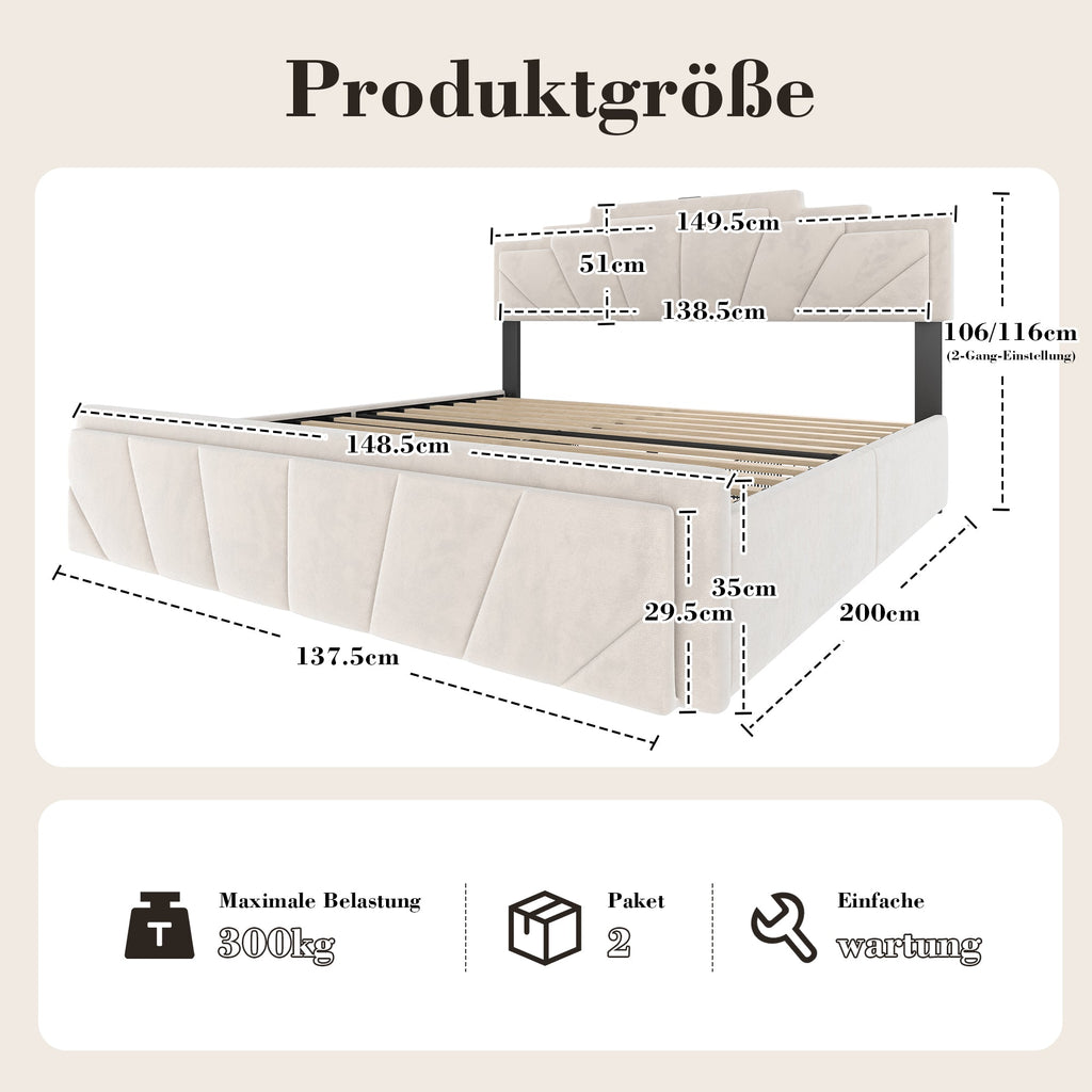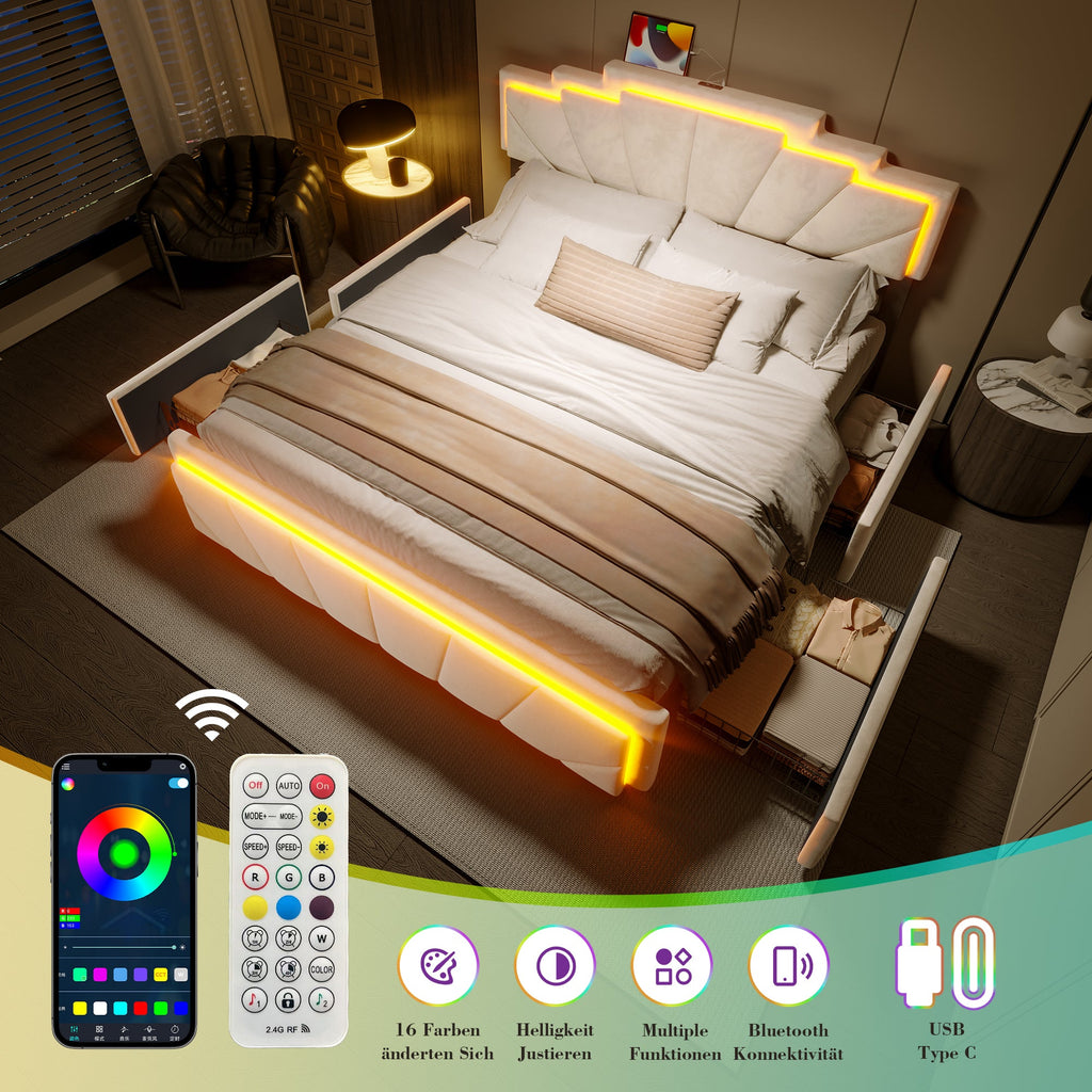 Upholstered Bed 140x200CM with Trapezoidal Headboard, LED Light, USB Type-C, 2 Drawers, Modern Design
