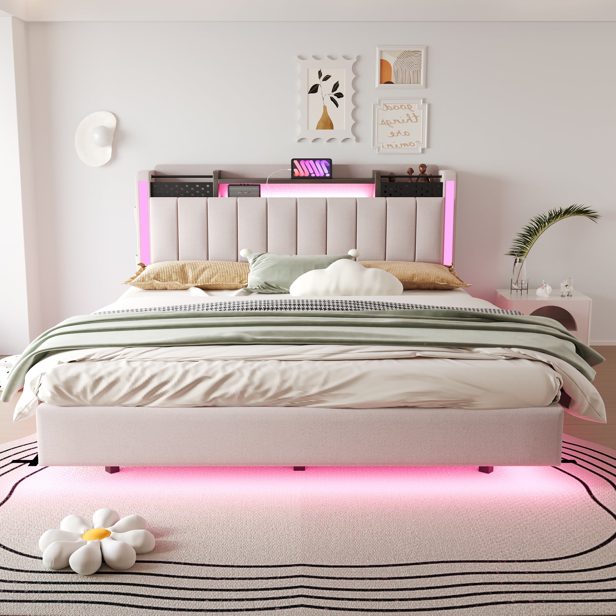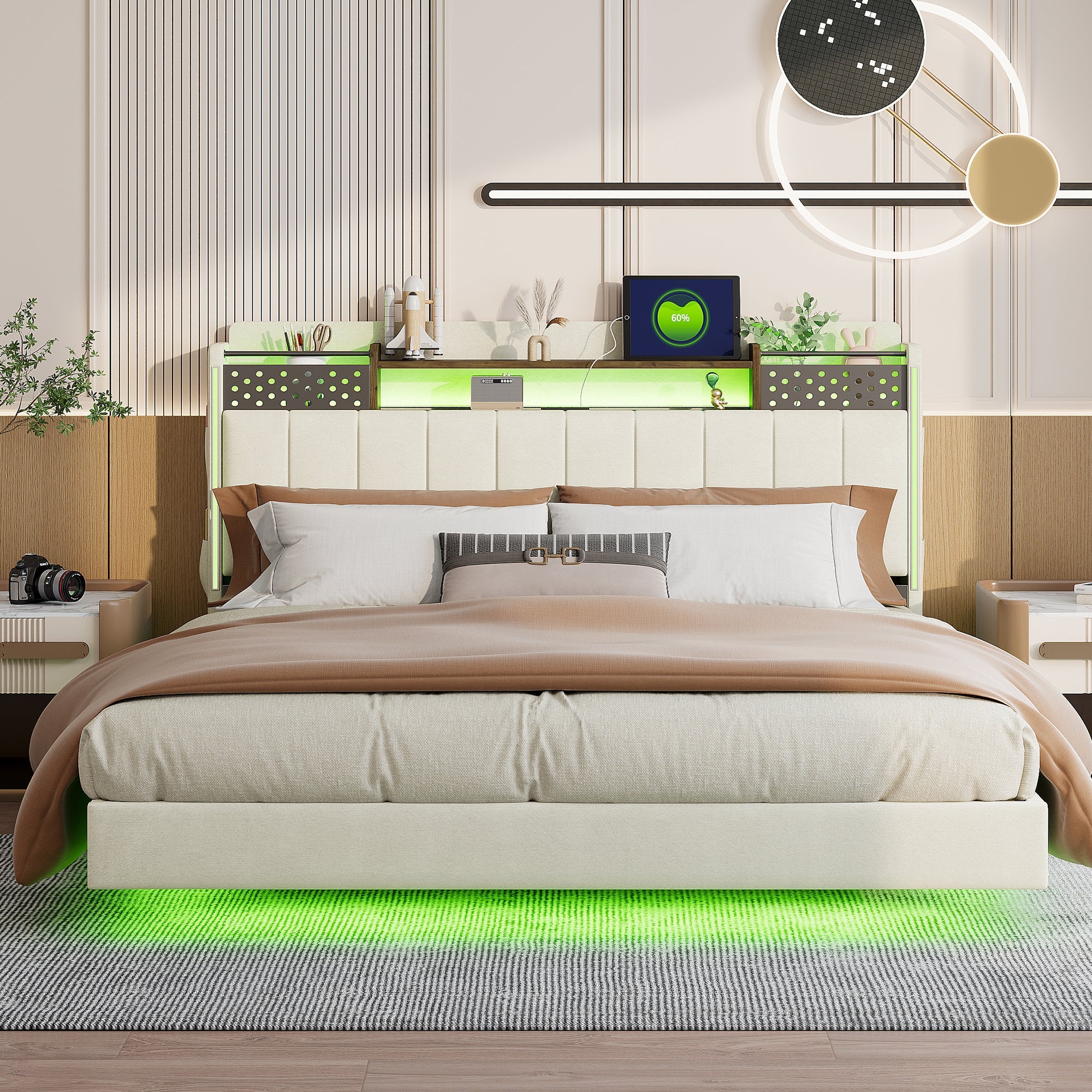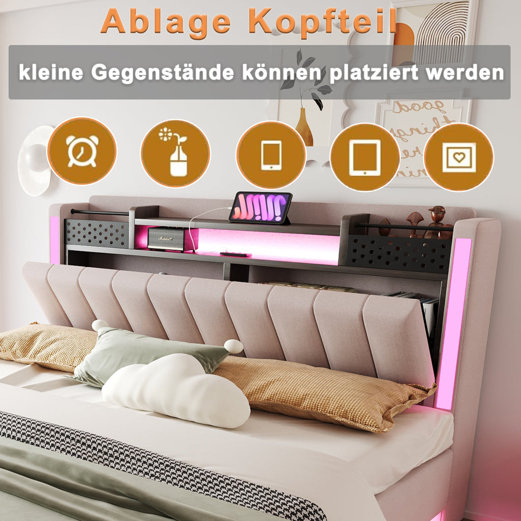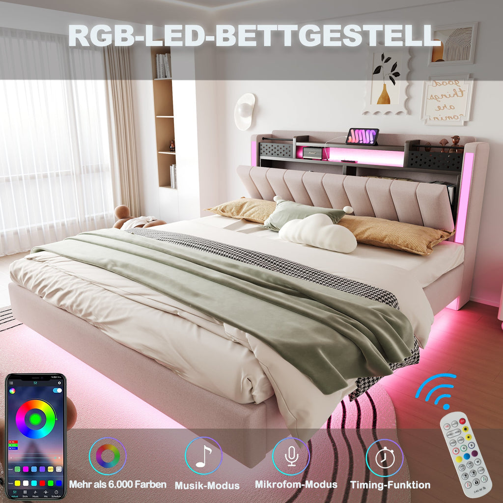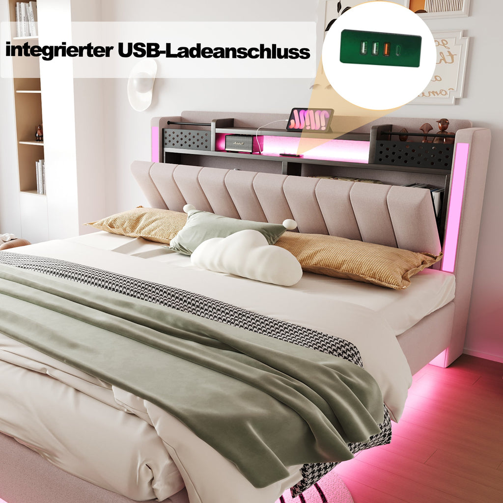 Upholstered Bed, 160*200 LED, USB, Storage, Floating, Linen Fabric, Beige
