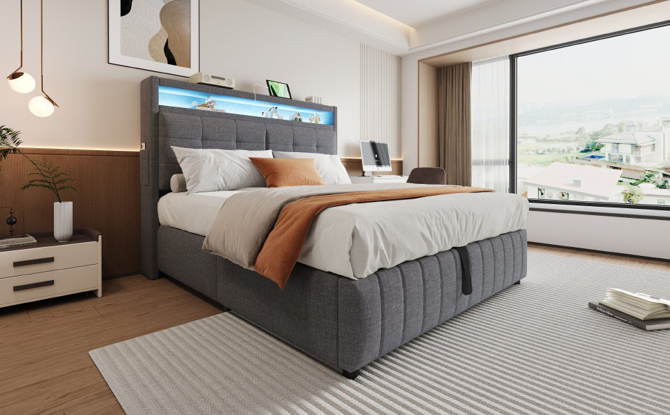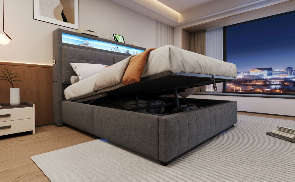 Upholstered Bed 160x200 cm, LED Lighting, USB Socket, Hydraulic Storage, Gray Linen