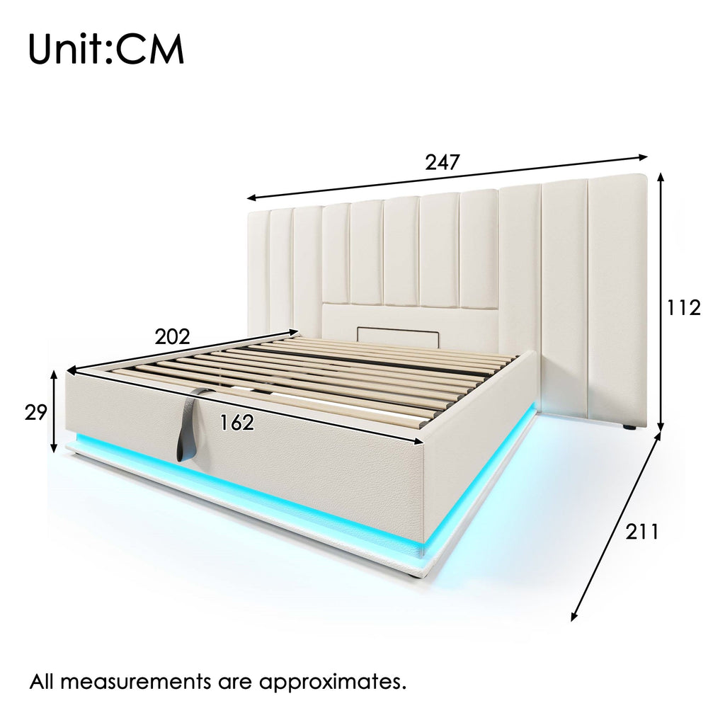 Upholstered Bed 160x200 Double Storage with App Control LED & USB-C Charging, White PU