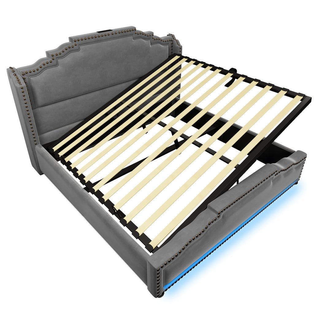 Upholstered Bed 160x200, Hydraulic Storage, LED, USB-C, Grey Velvet