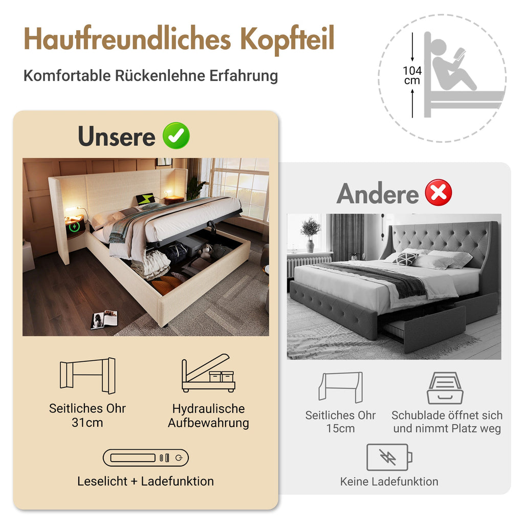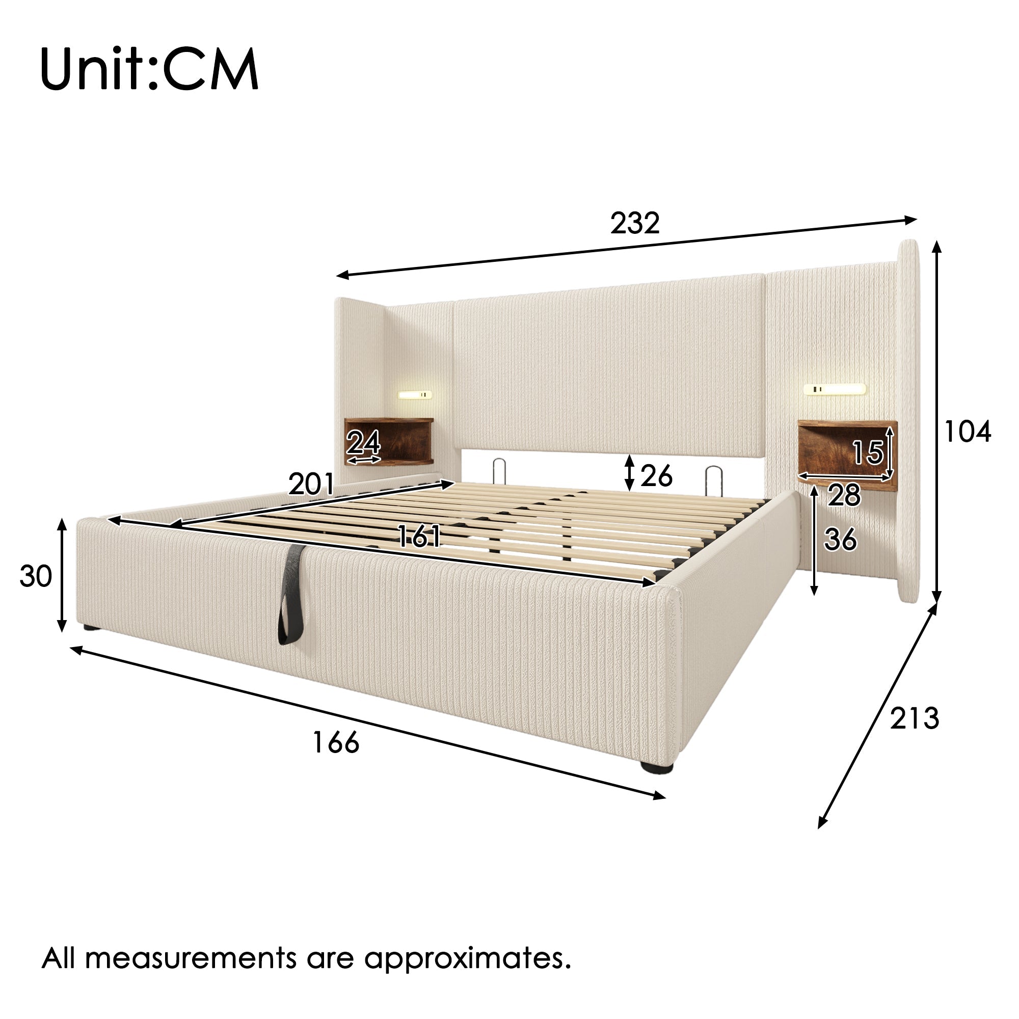 Upholstered Bed, 160x200, Storage, Lamp, USB-C, Beige-White Corduroy