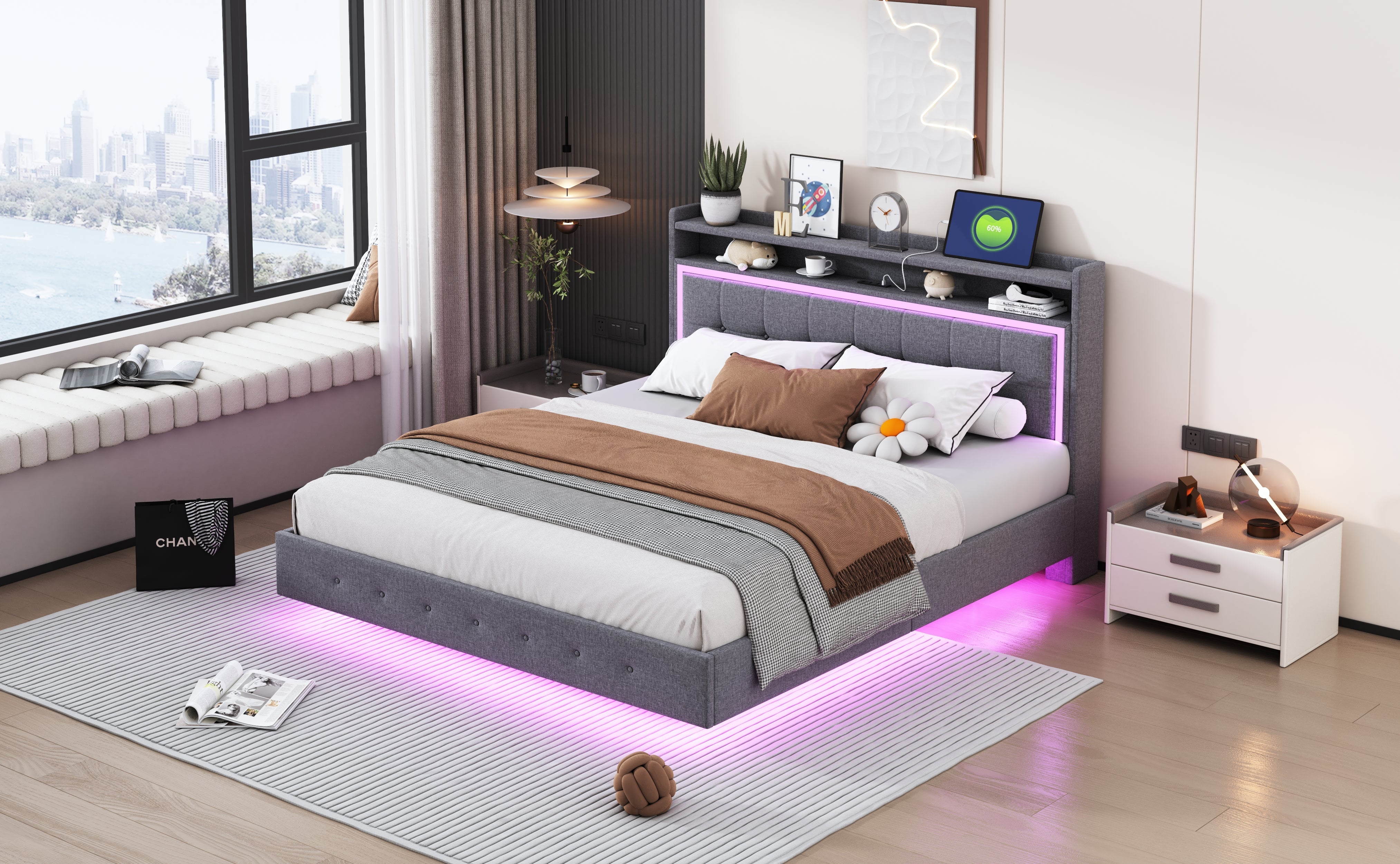 Upholstered Bed, 160x200 USB & LED, Linen Fabric Gray