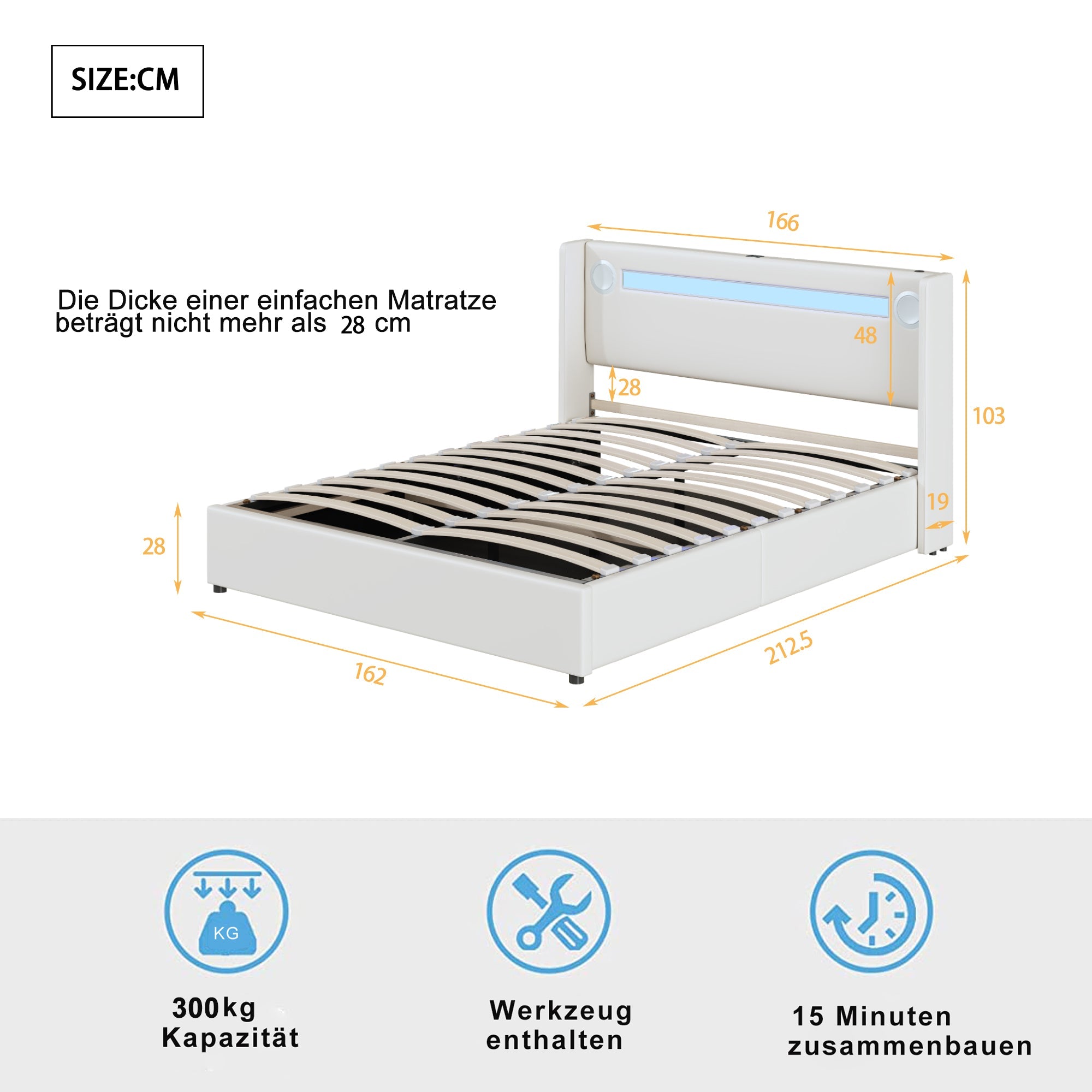 The recommended mattress thickness is no more than 28 cm. It is available in white and made from MDF, metal, and PU leather. It features 24 slats and does not require a spring box. A mattress is not included. Estimated assembly time is 0.5 hours with a recommendation of 2 people for assembly. All necessary tools and screwdrivers are included.