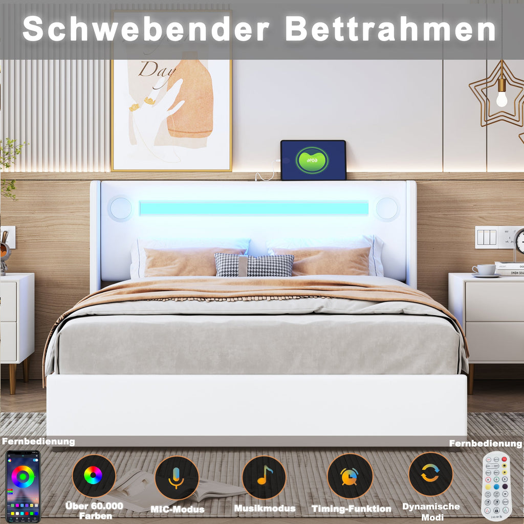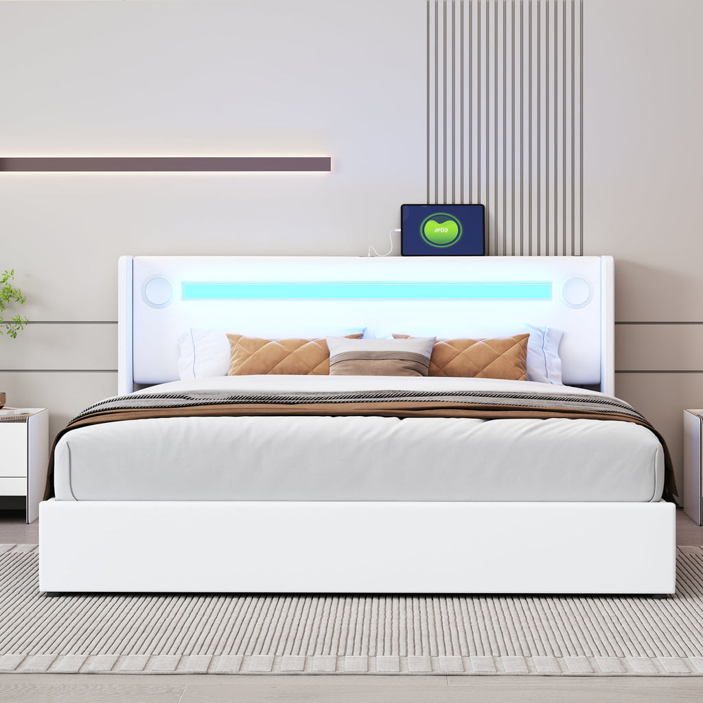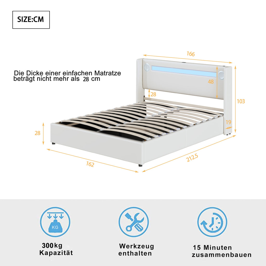 Upholstered Bed 160x200 with LED, Bluetooth, USB, Storage, PU Leather White