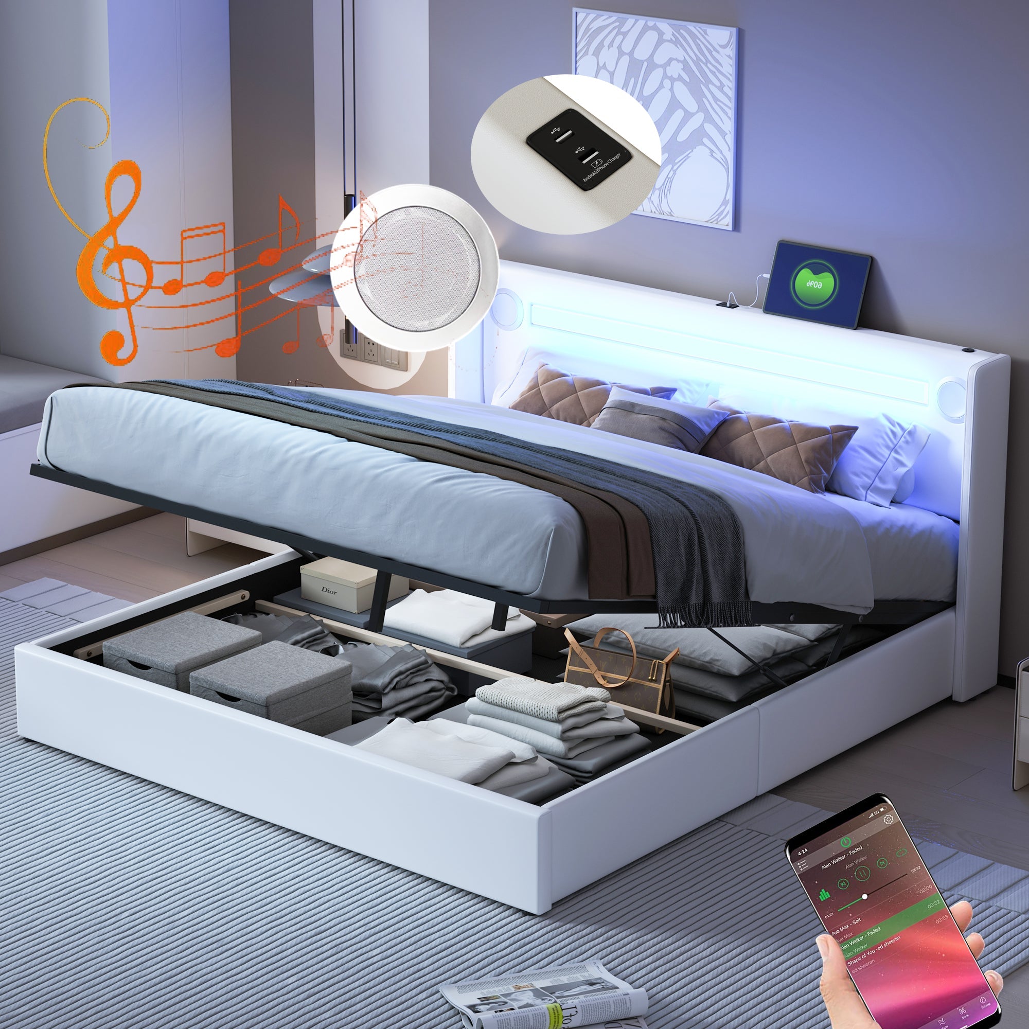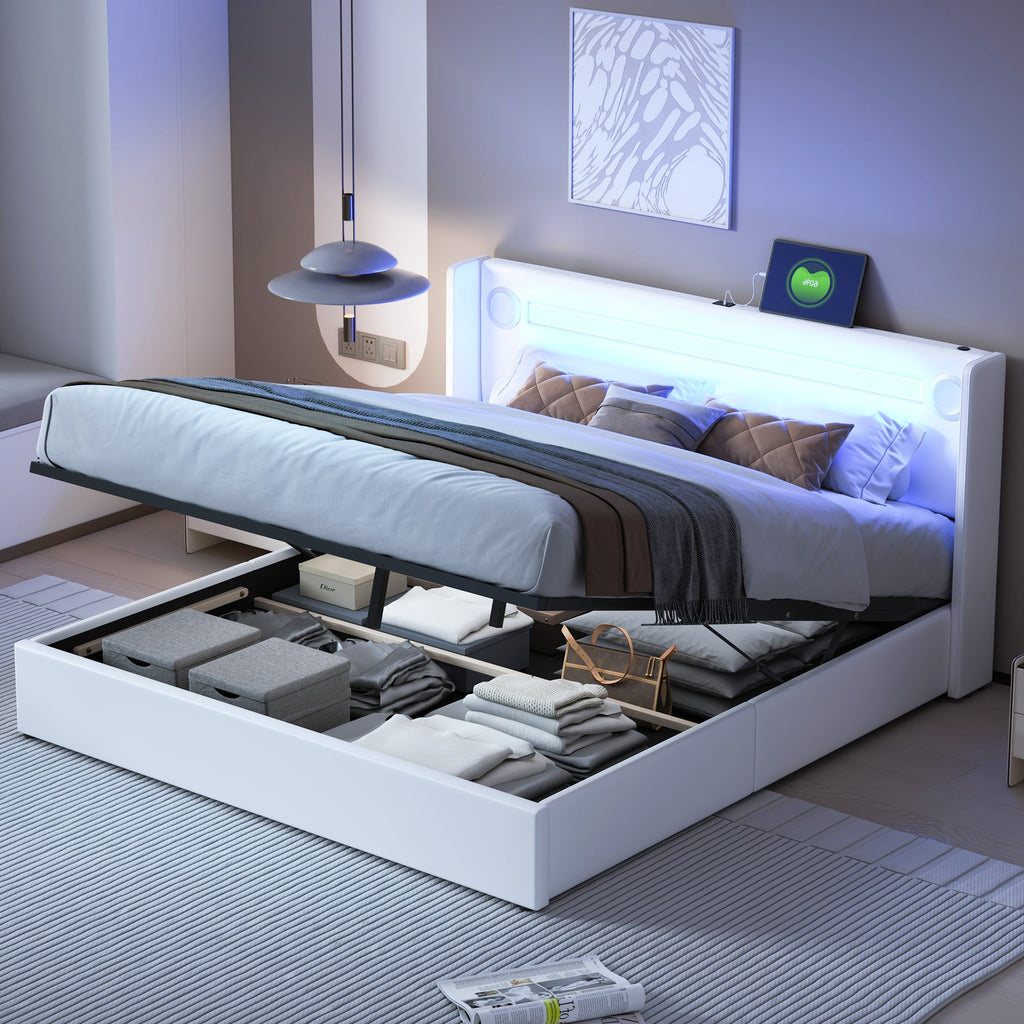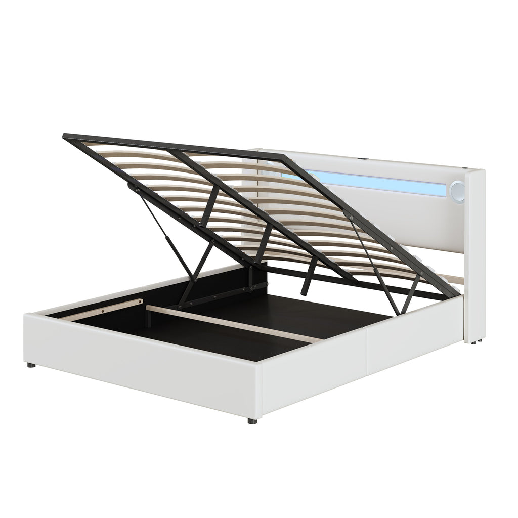 Upholstered Bed 160x200 with LED, Bluetooth, USB, Storage, PU Leather White