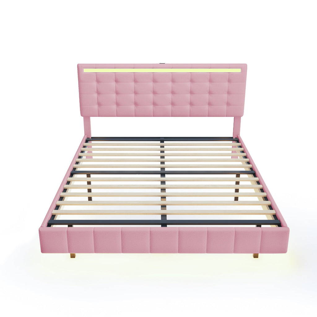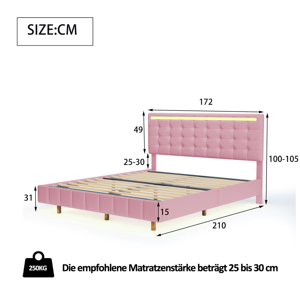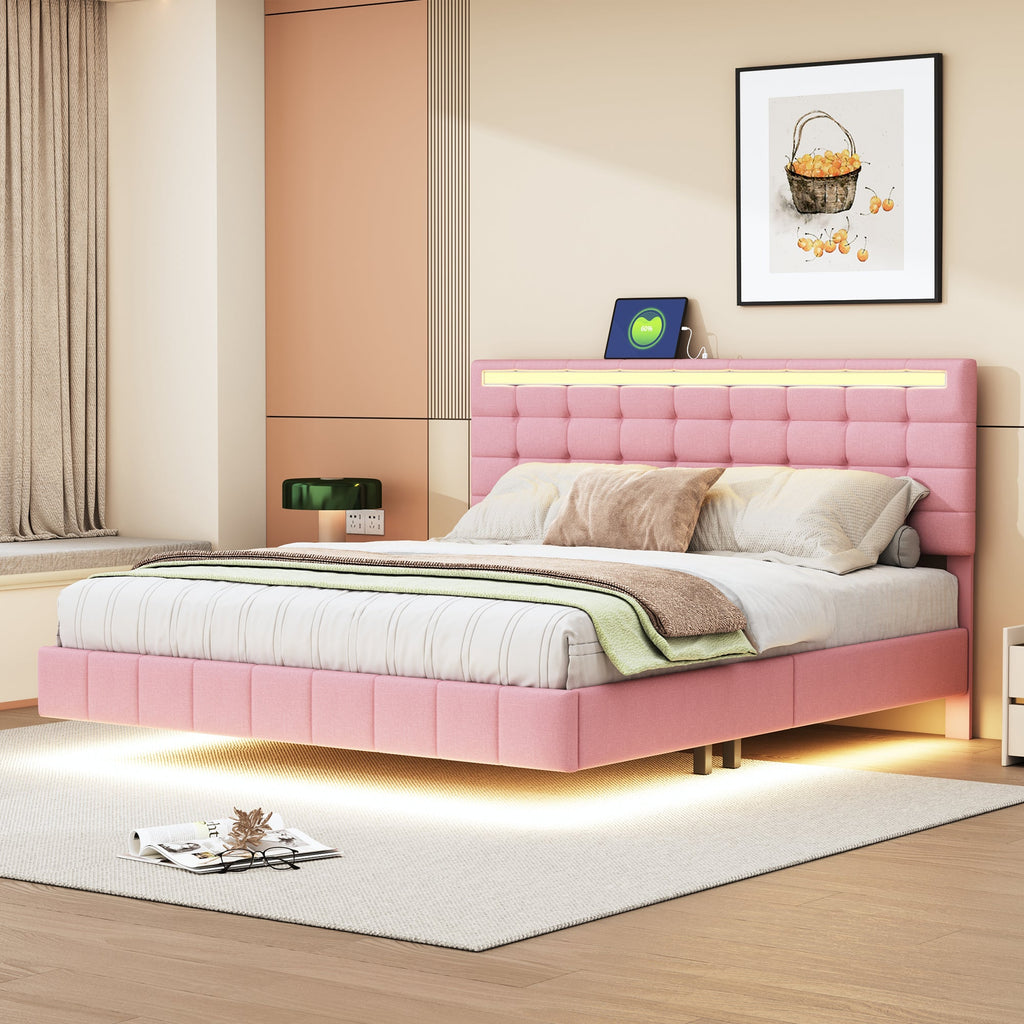 Upholstered Bed, 160x200cm Floating Frame with LED Lights & Headboard, Pink Linen