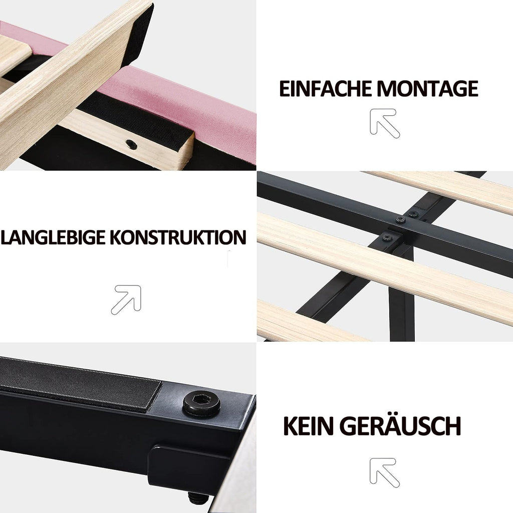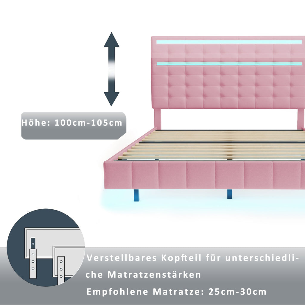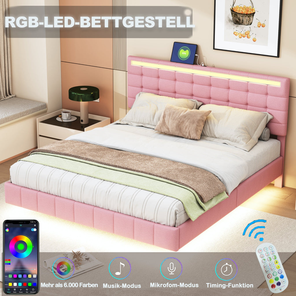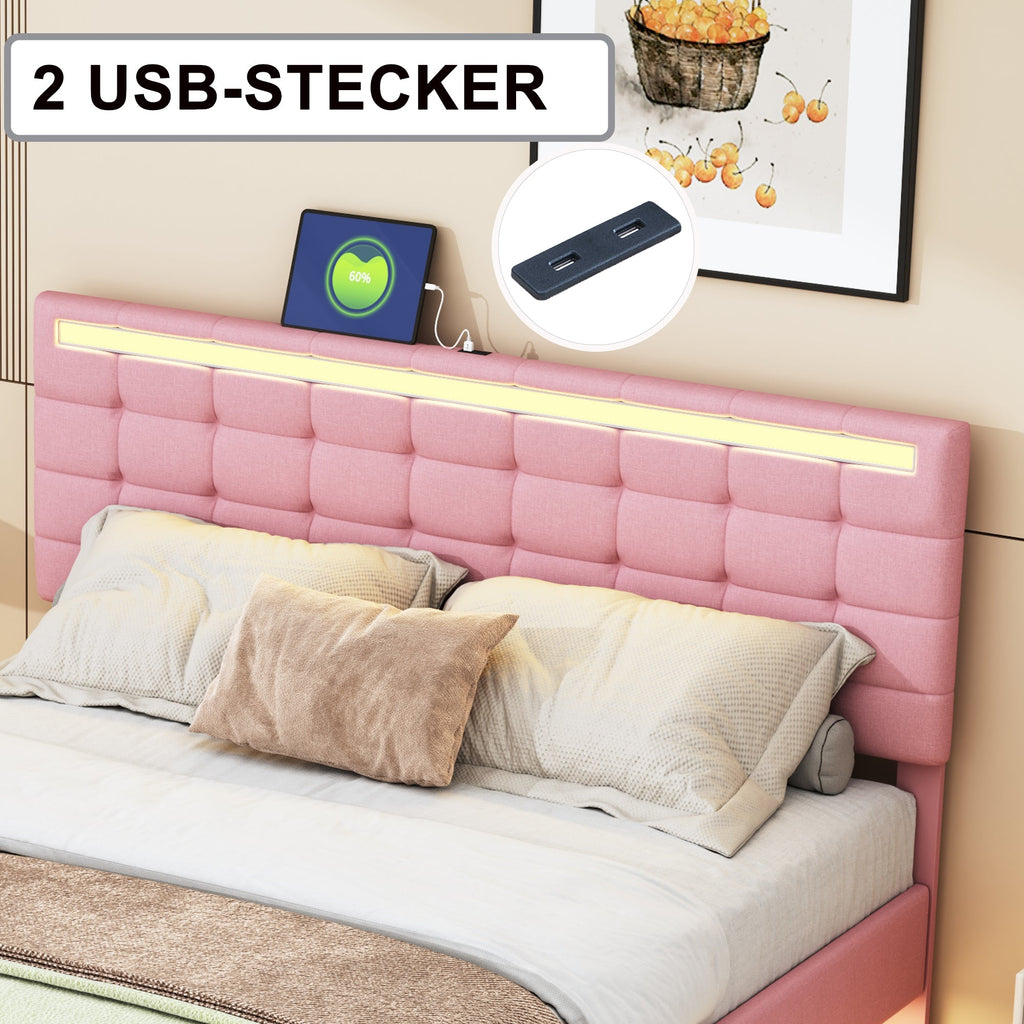 Upholstered Bed, 160x200cm Floating Frame with LED Lights & Headboard, Pink Linen