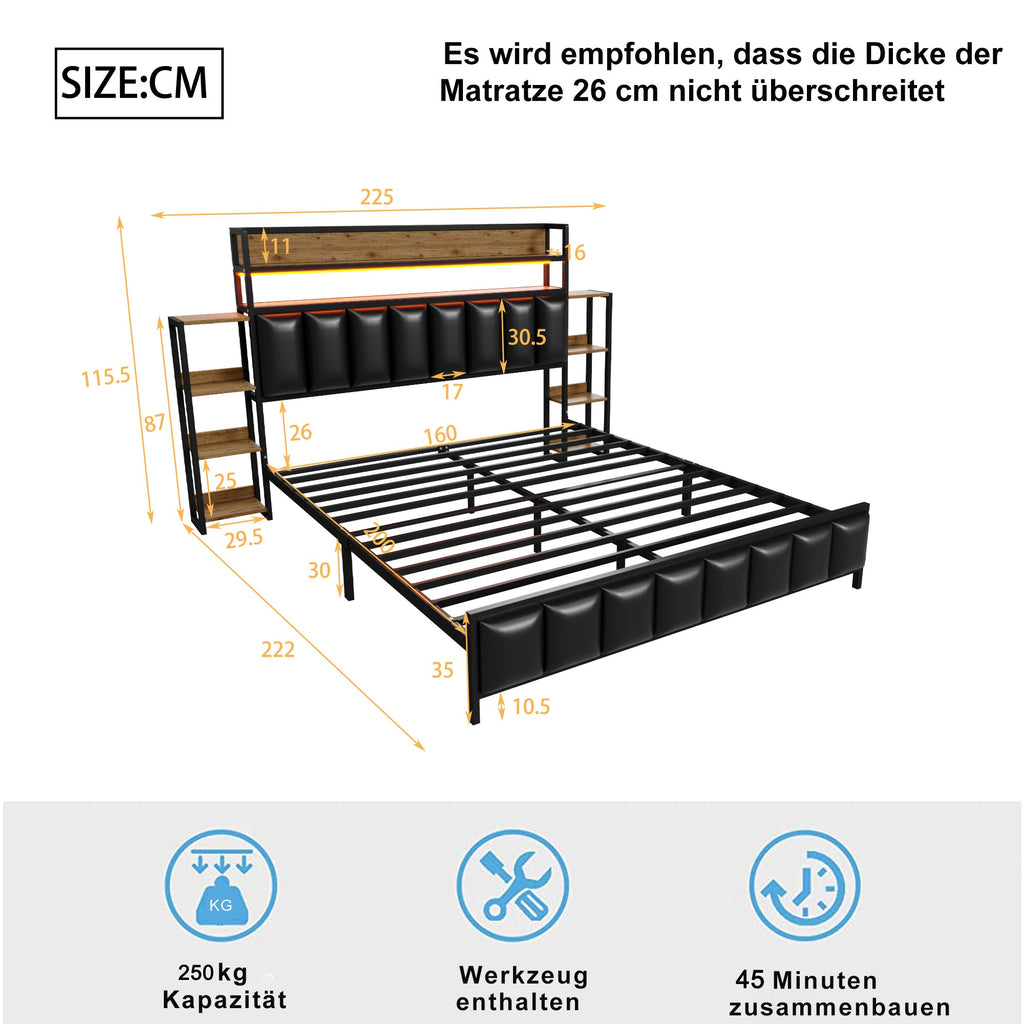 Upholstered Bed 160x200cm, LED Lighting, Storage Headboard, Faux Leather, Black