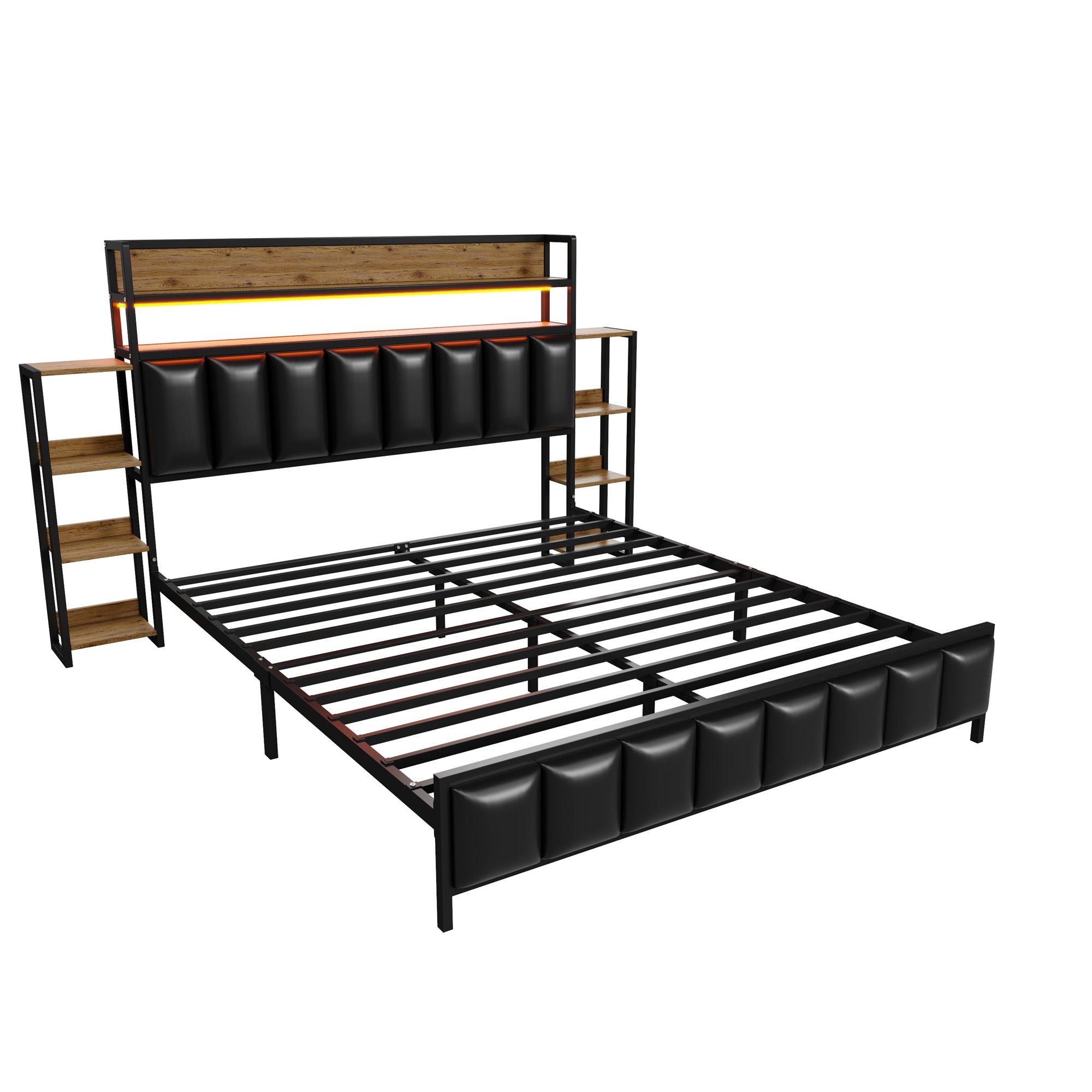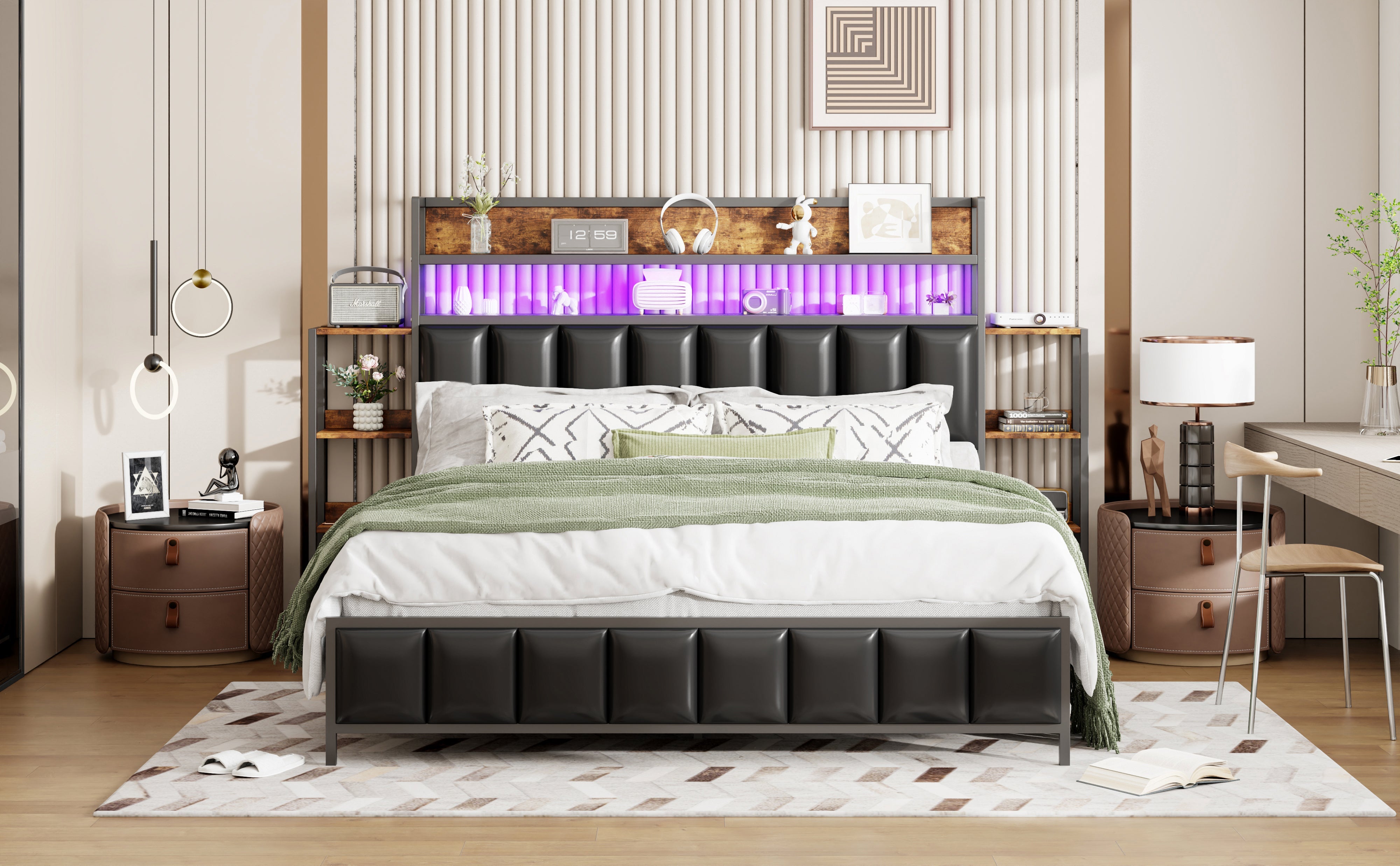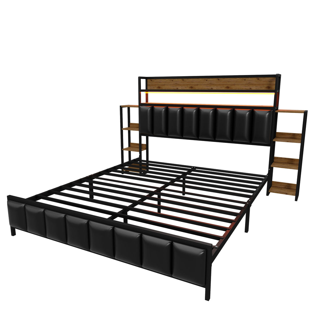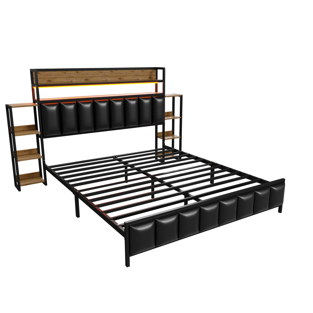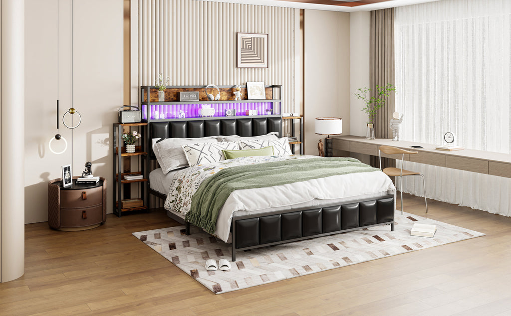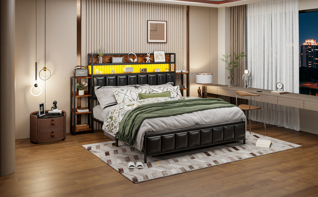 Our versatile upholstered bed combines unique design with practical functionality. The bed features LED lights at the headboard, creating a modern and cozy sleeping space. The headboard features double shelves for easy access to bedroom essentials, keeping your bedroom organized. The upholstered bed includes a multi-tiered shelf on each side of the headboard, expanding storage space and making it easier to access your belongings.
