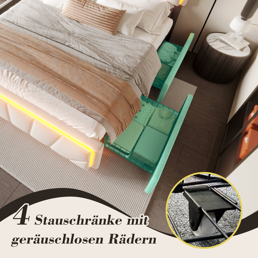 There are two iron drawers with casters on each side of the bed, for a total of four drawers. The drawers offer ample storage space and can be used to store clothes, bedding, miscellaneous items, and more. The caster design makes it easy to slide and pull, and it is easy and effortless to retrieve and adjust items. This allows you to efficiently organize your bedroom space and keep your bedroom clean and tidy.