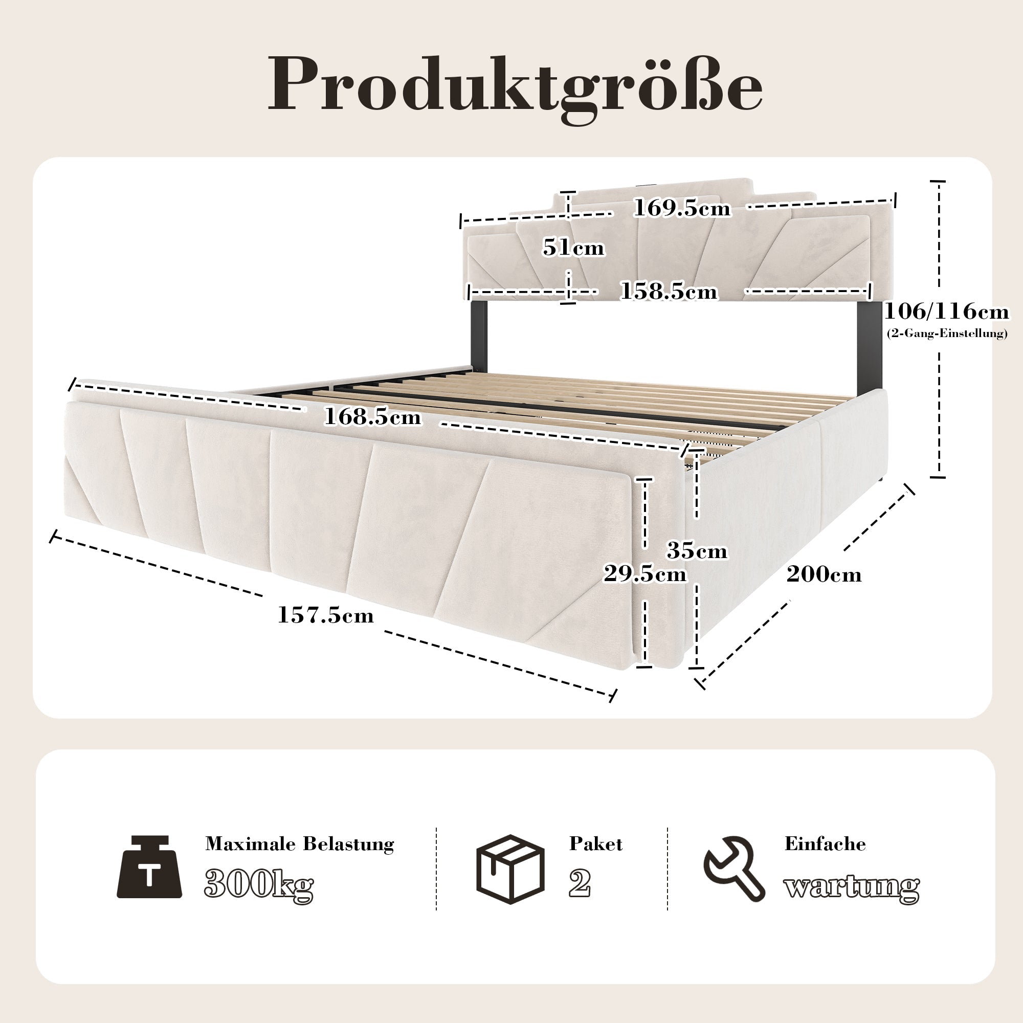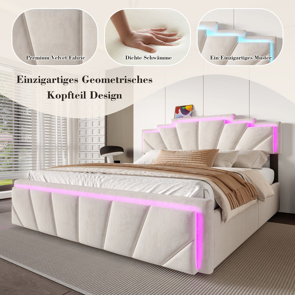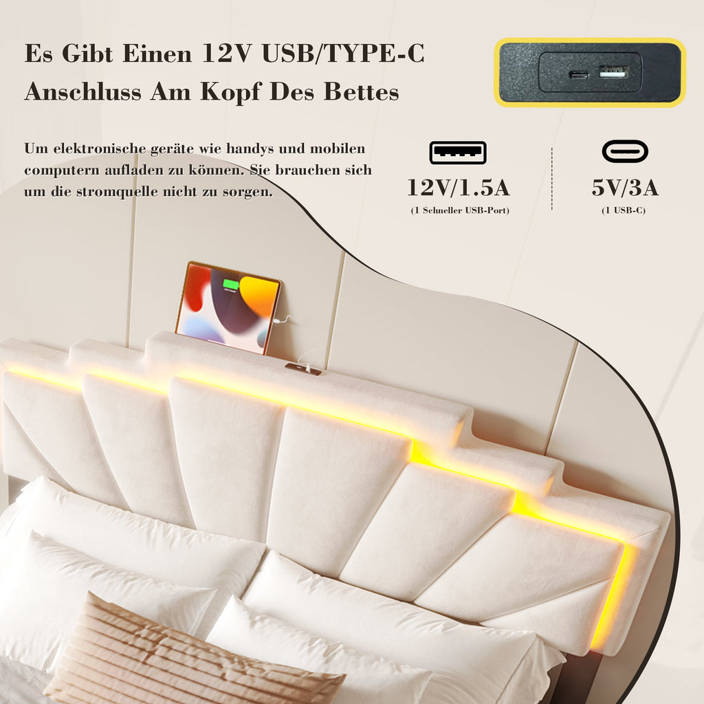 Upholstered Bed, 160x200CM Modern with LED, USB-C, 2 Drawers