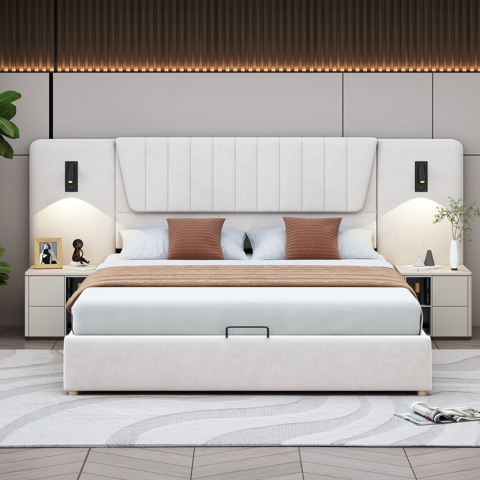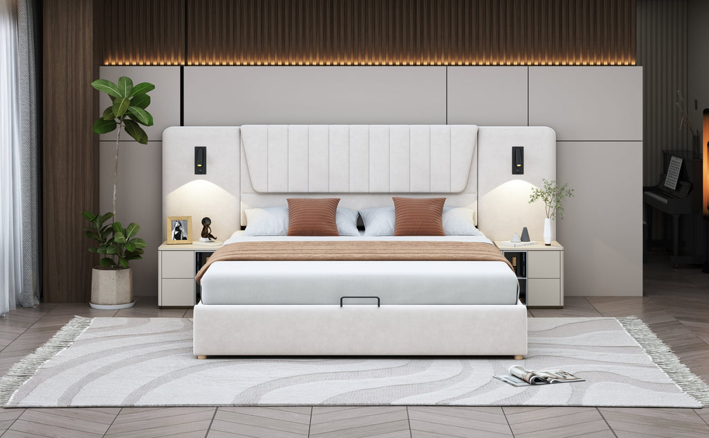 Upholstered Bed, 180*200cm, Extra-Long Backrest, Reading Lamp, USB Port, Hydraulic Storage, Beige Velvet