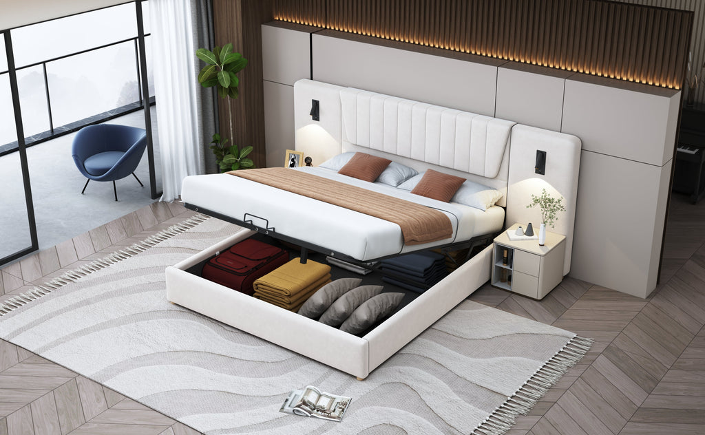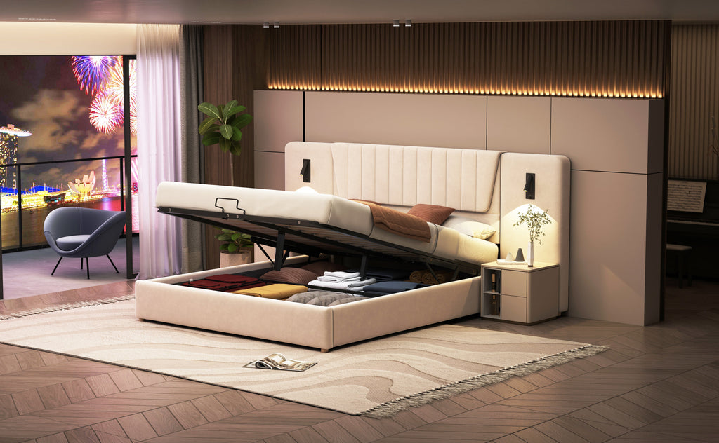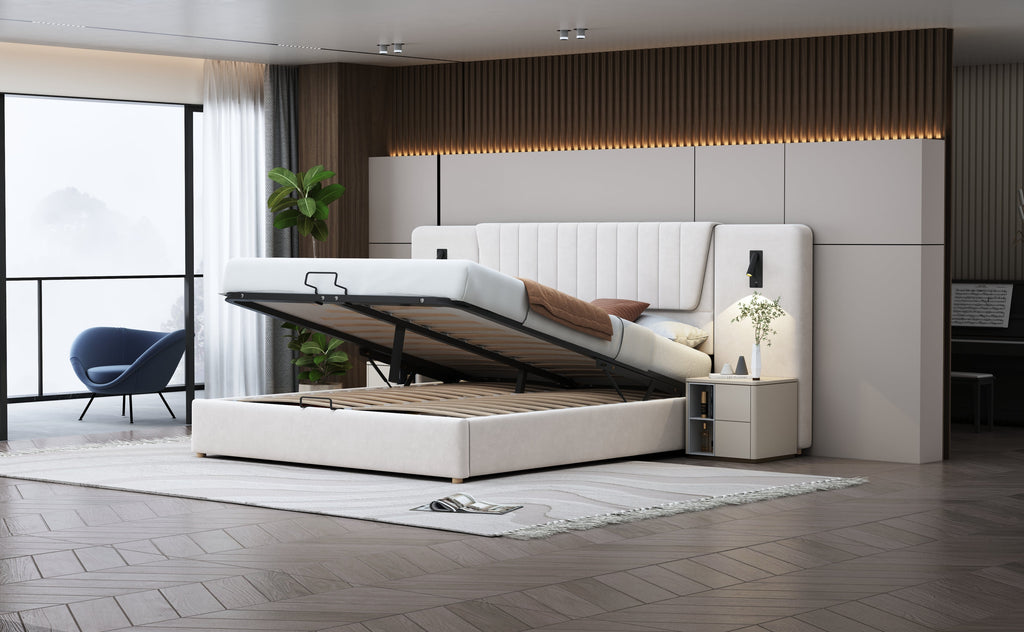 Upholstered Bed 180*200cm, Hydraulic Storage, Extra-Long Backrest, Reading Lamp, USB Charging, Velvet Fabric, Beige