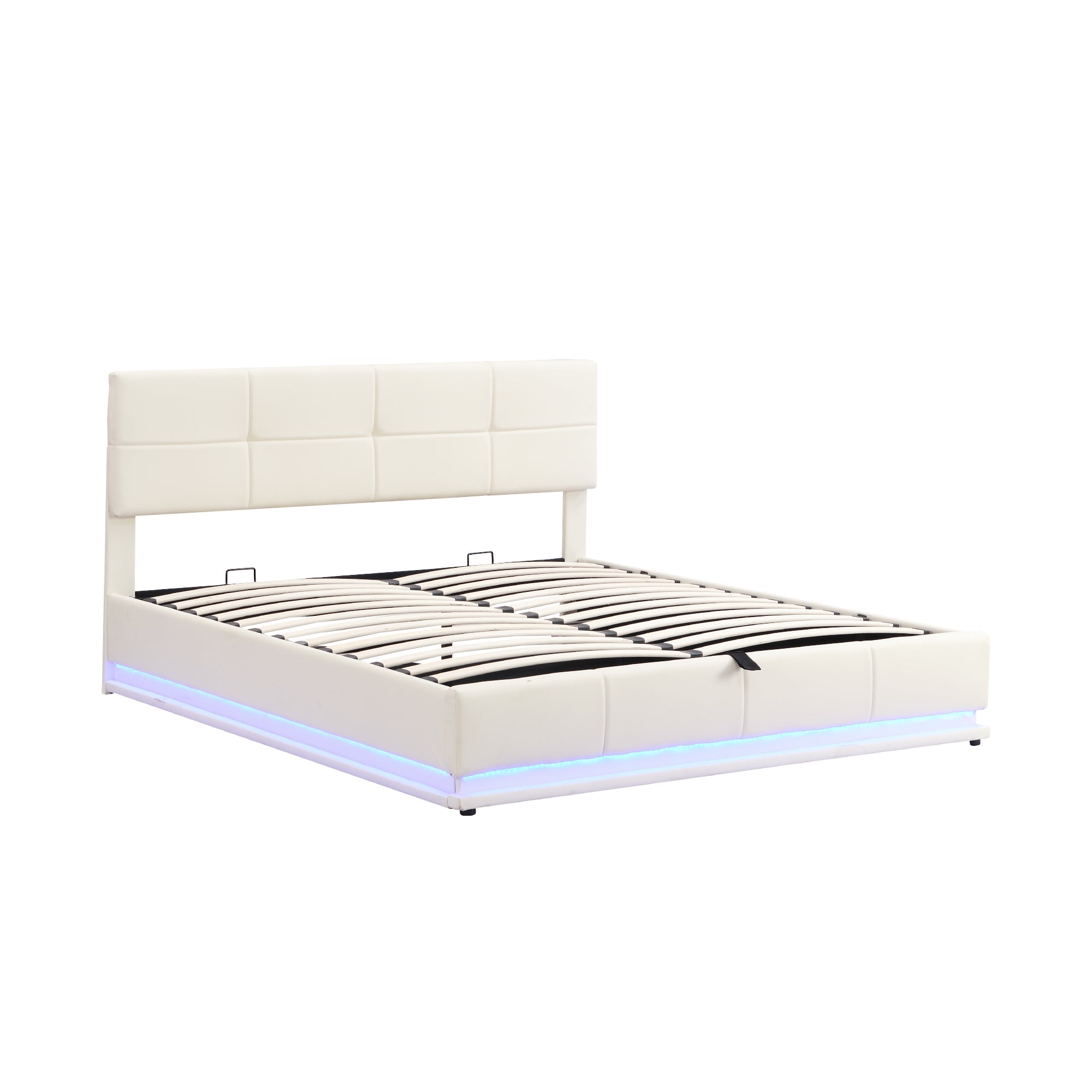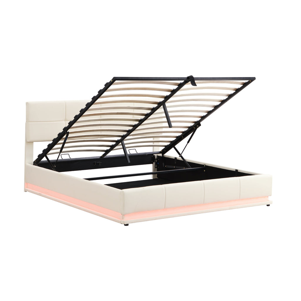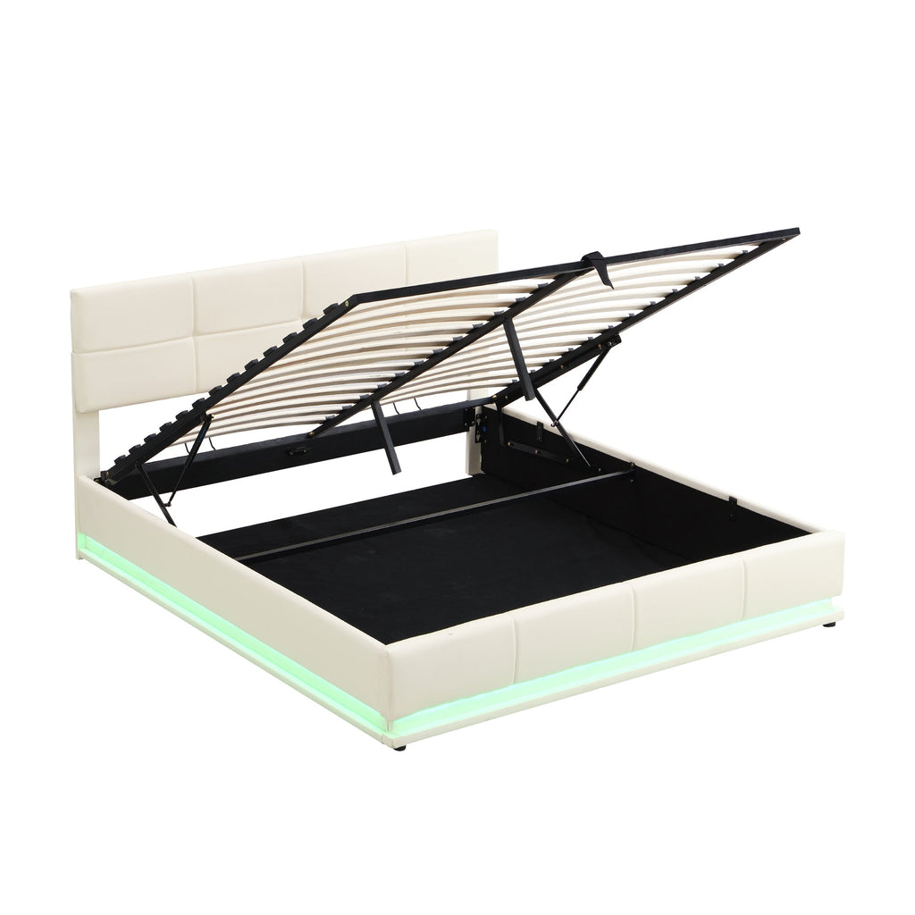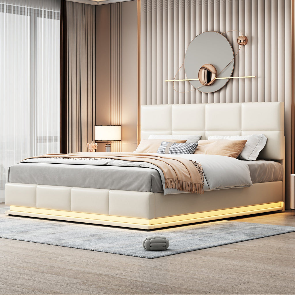 Upholstered Bed 180x200 cm with LED Lighting & Hydraulic Storage, Faux Leather Beige