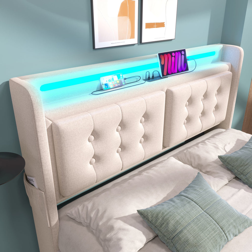 Upholstered Bed 180x200, LED Headboard with USB-C, Hydraulic, Beige Cotton