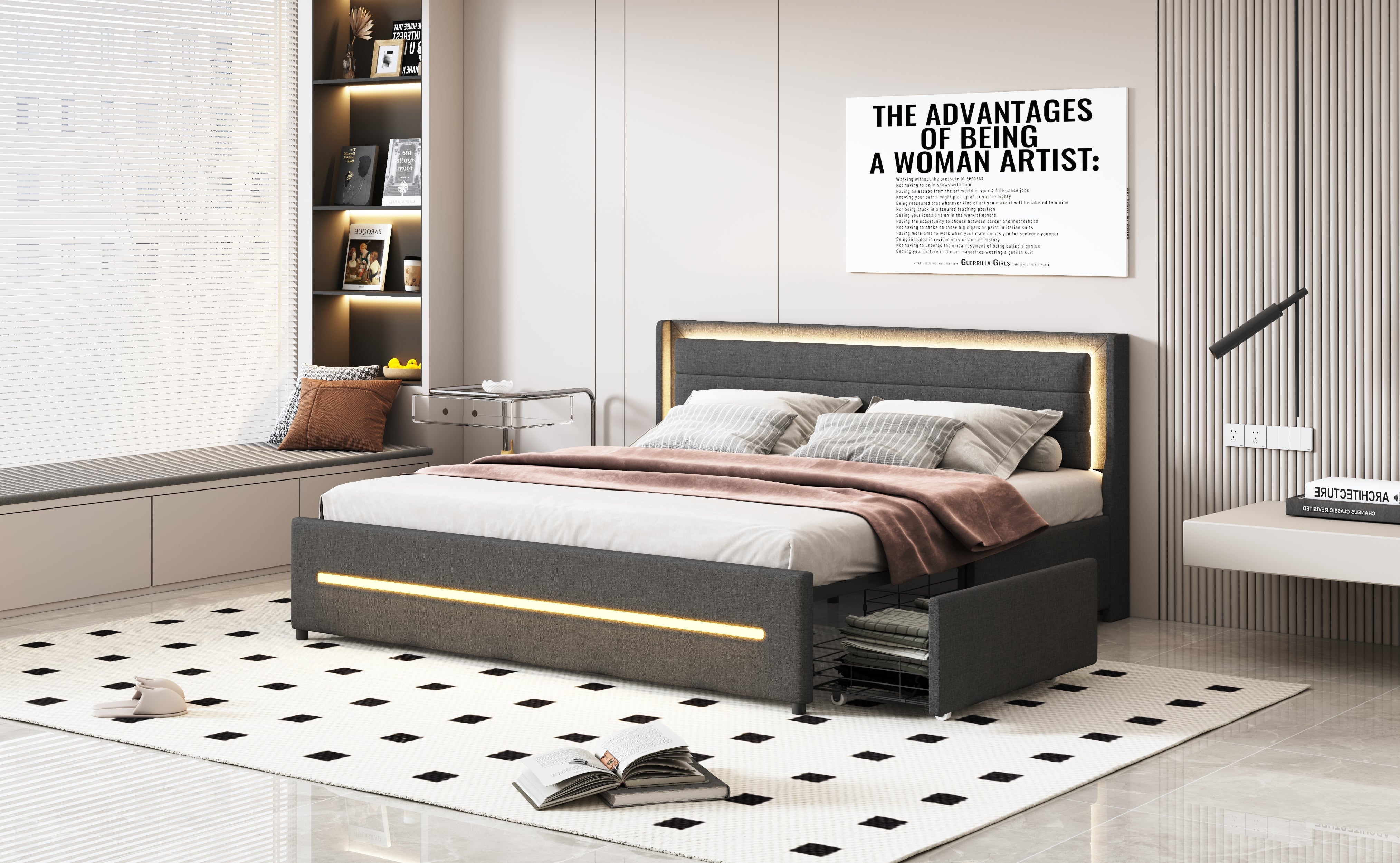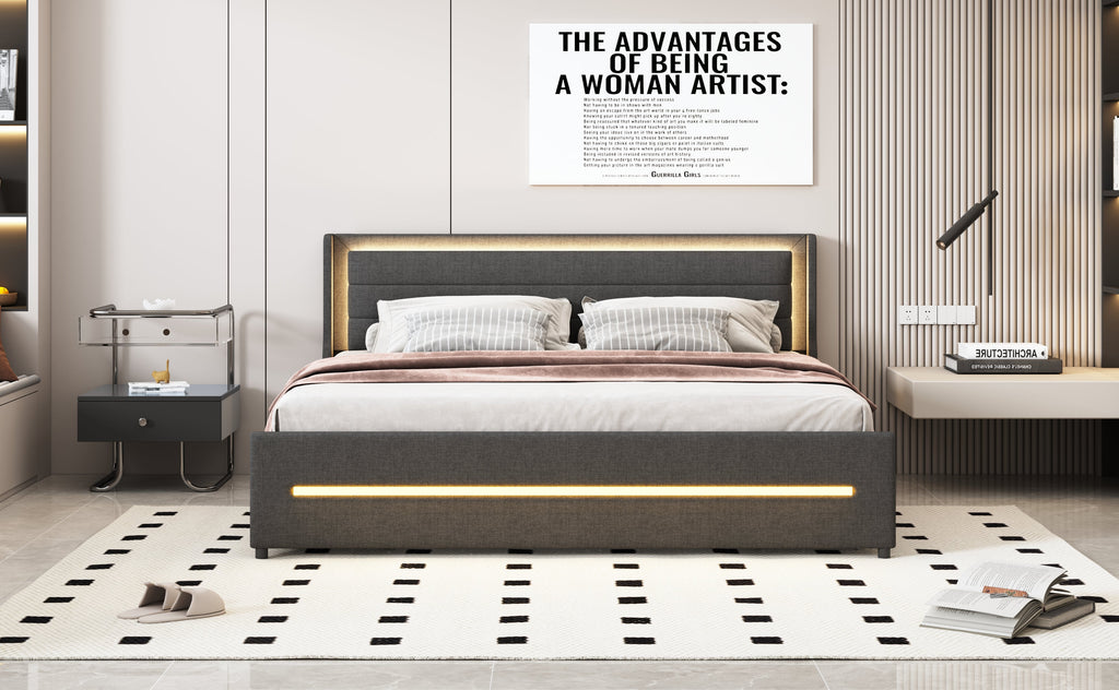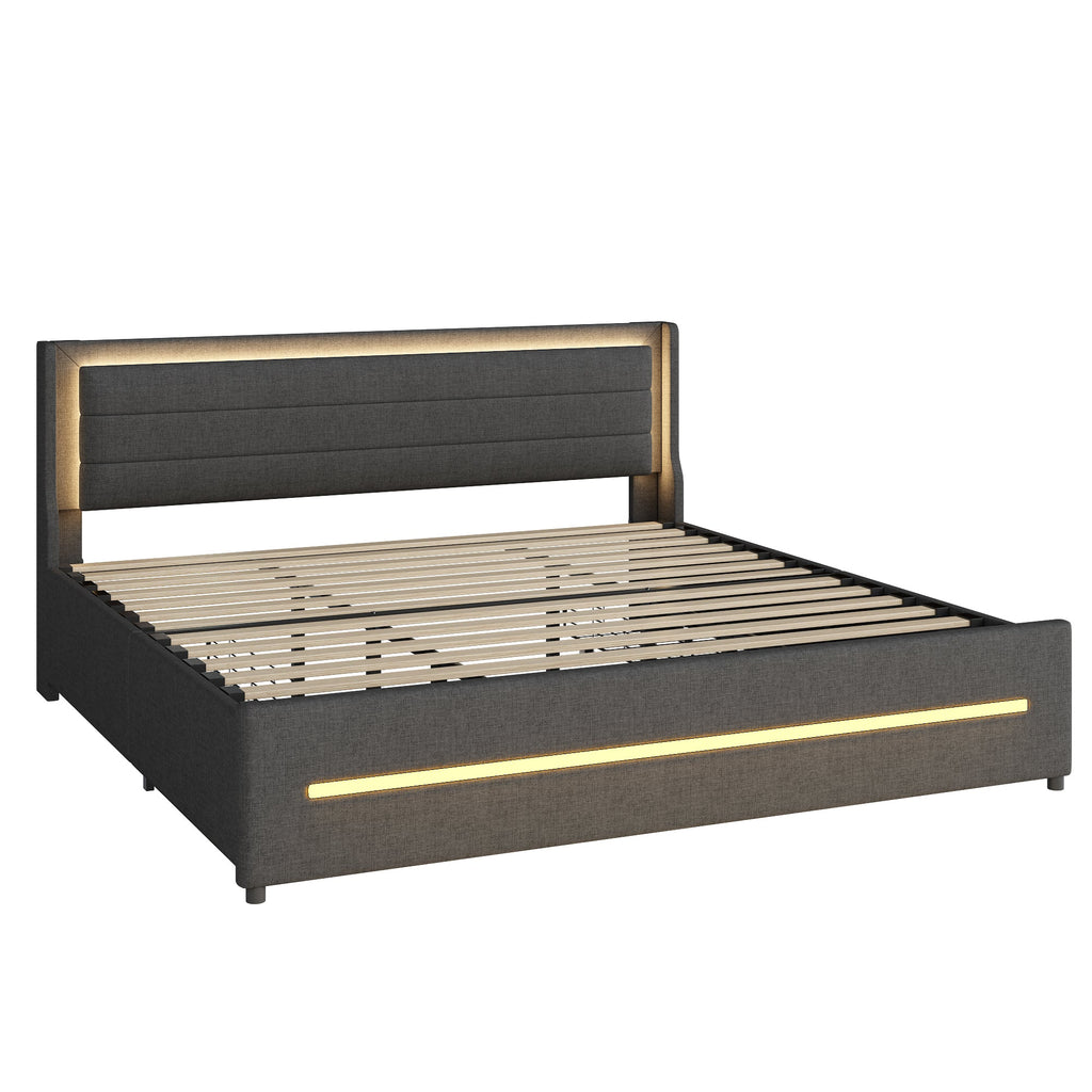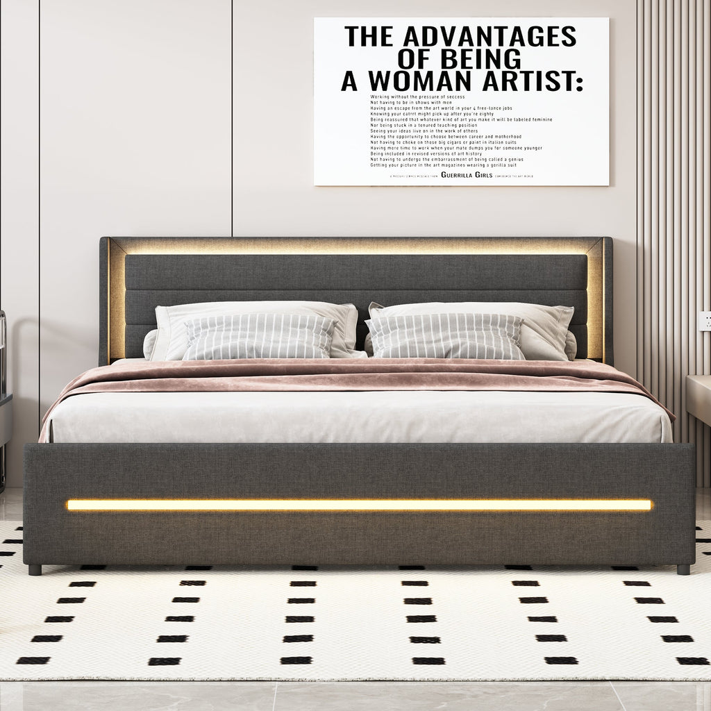 Upholstered Bed 180x200 with LED Lighting, 4 Storage, Linen Fabric, Gray