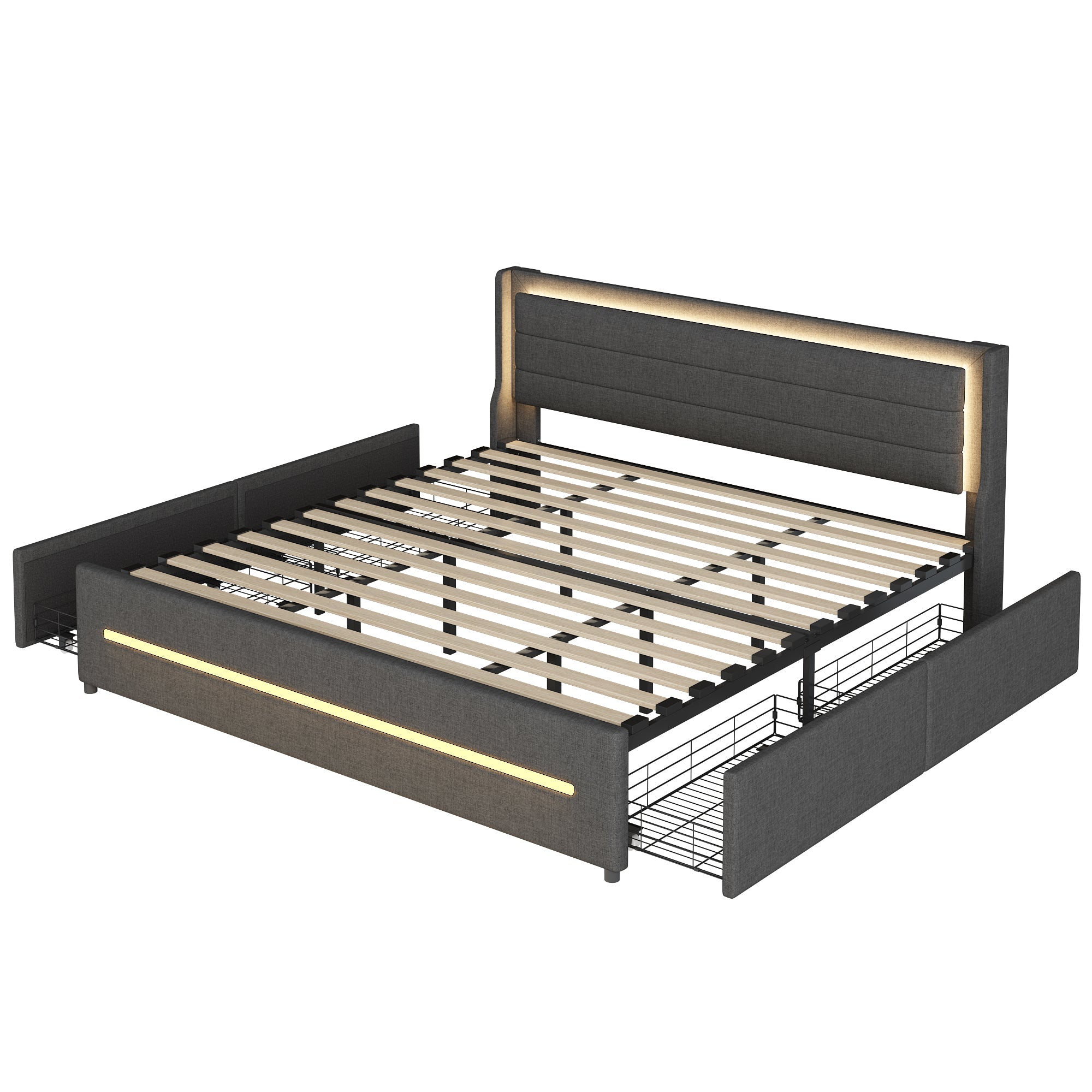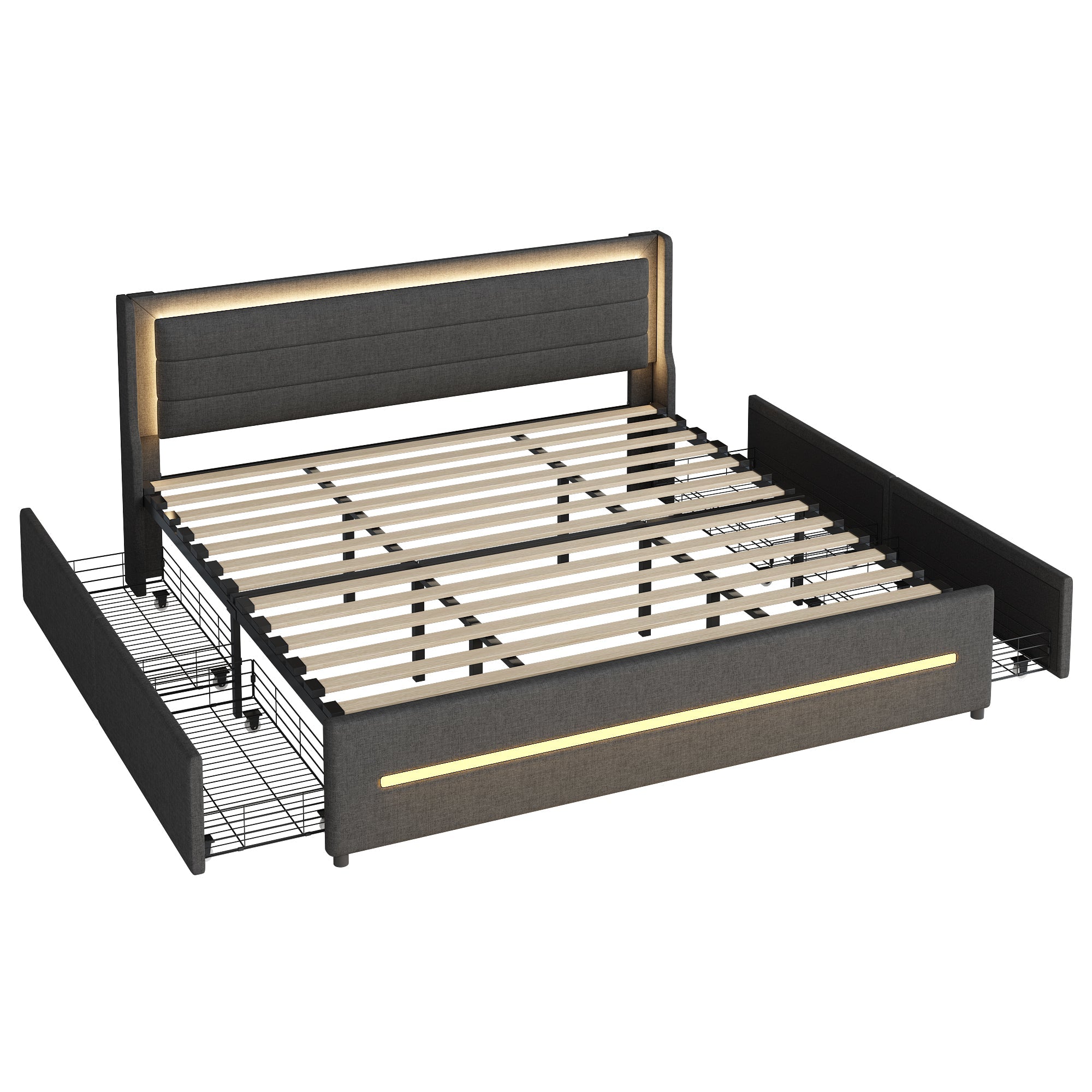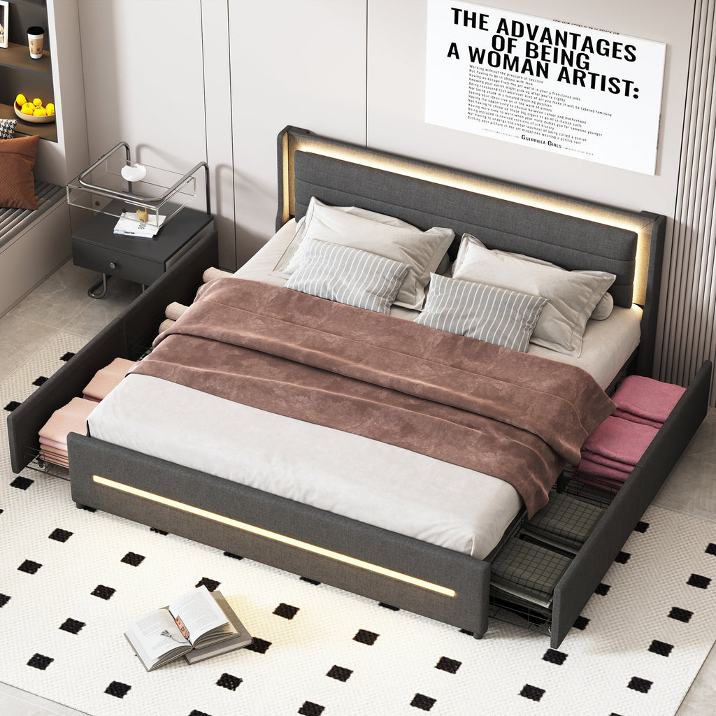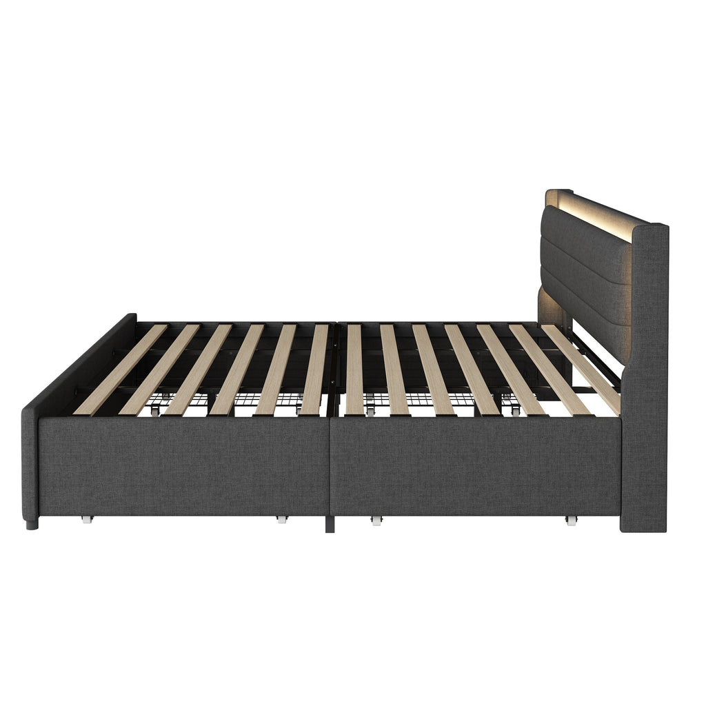 Upholstered Bed 180x200 with LED Lighting, 4 Storage, Linen Fabric, Gray