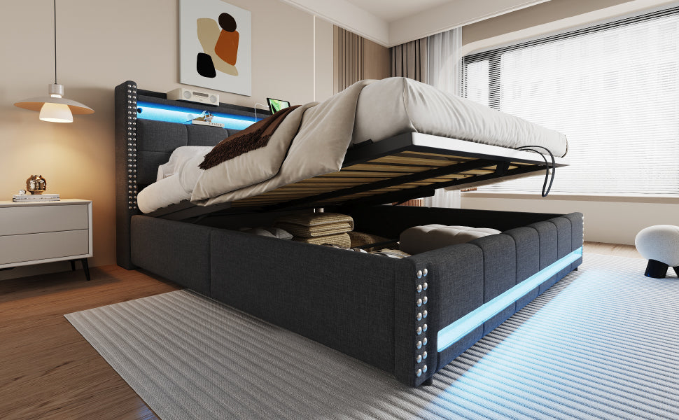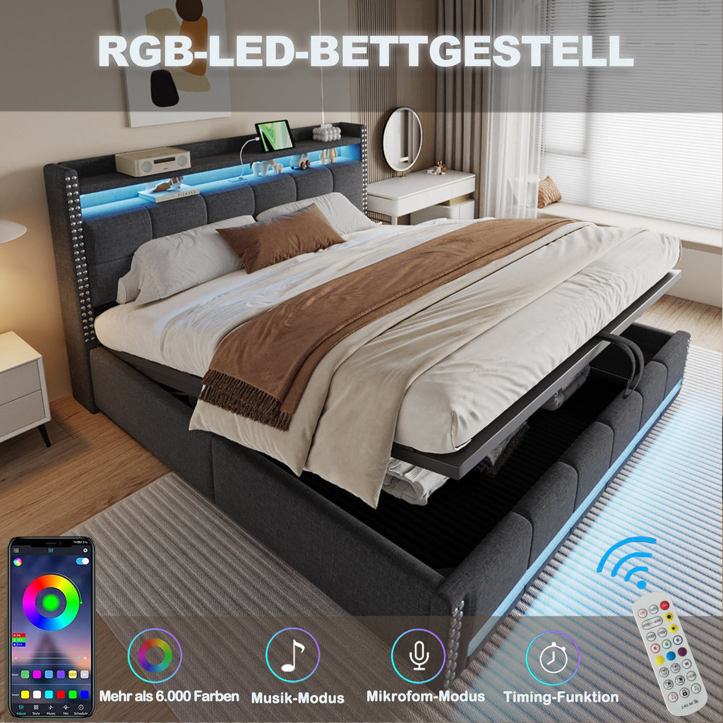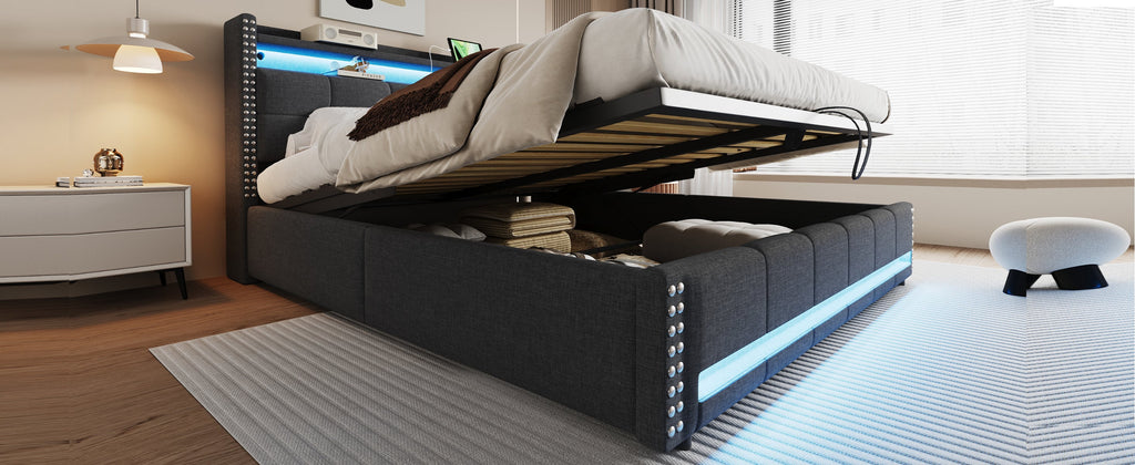Upholstered Bed 180x200cm, LED Lighting, USB Socket, Hydraulic Storage, Linen Fabric Gray