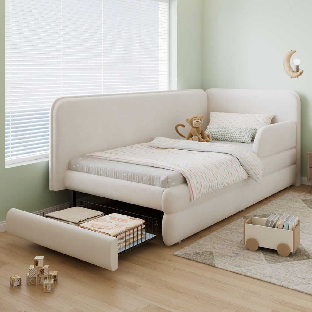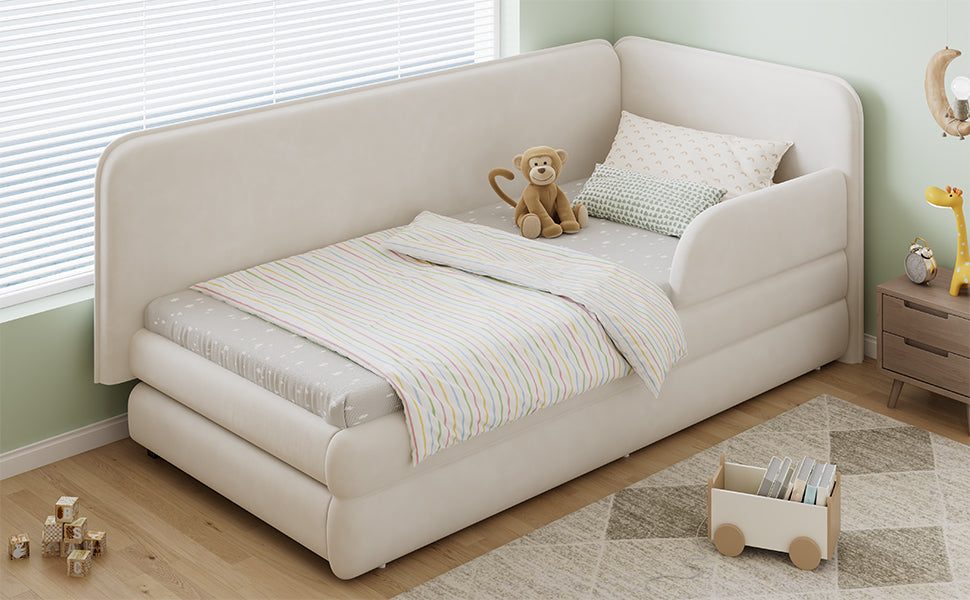 Complemented by its simple design, the bed features clean lines and a minimalist aesthetic that feels timeless—a sleek look that enhances rather than overwhelms your room. The soft beige color adds a warm, inviting vibe to your space, effortlessly complementing neutral or vibrant decor, while the comfortable velvet upholstery makes every interaction with the bed a pleasant one. For added peace of mind, it comes with side rails on the bed: These thoughtful rails provide gentle support, especially useful for younger users or anyone who prefers extra stability when getting in and out. This single bed is suitable for different decoration styles, fitting right in whether your home leans into modern minimalism, cozy Scandinavian charm, or classic elegance. It is a practical, stylish choice that checks all the boxes for comfort, storage, and versatility.