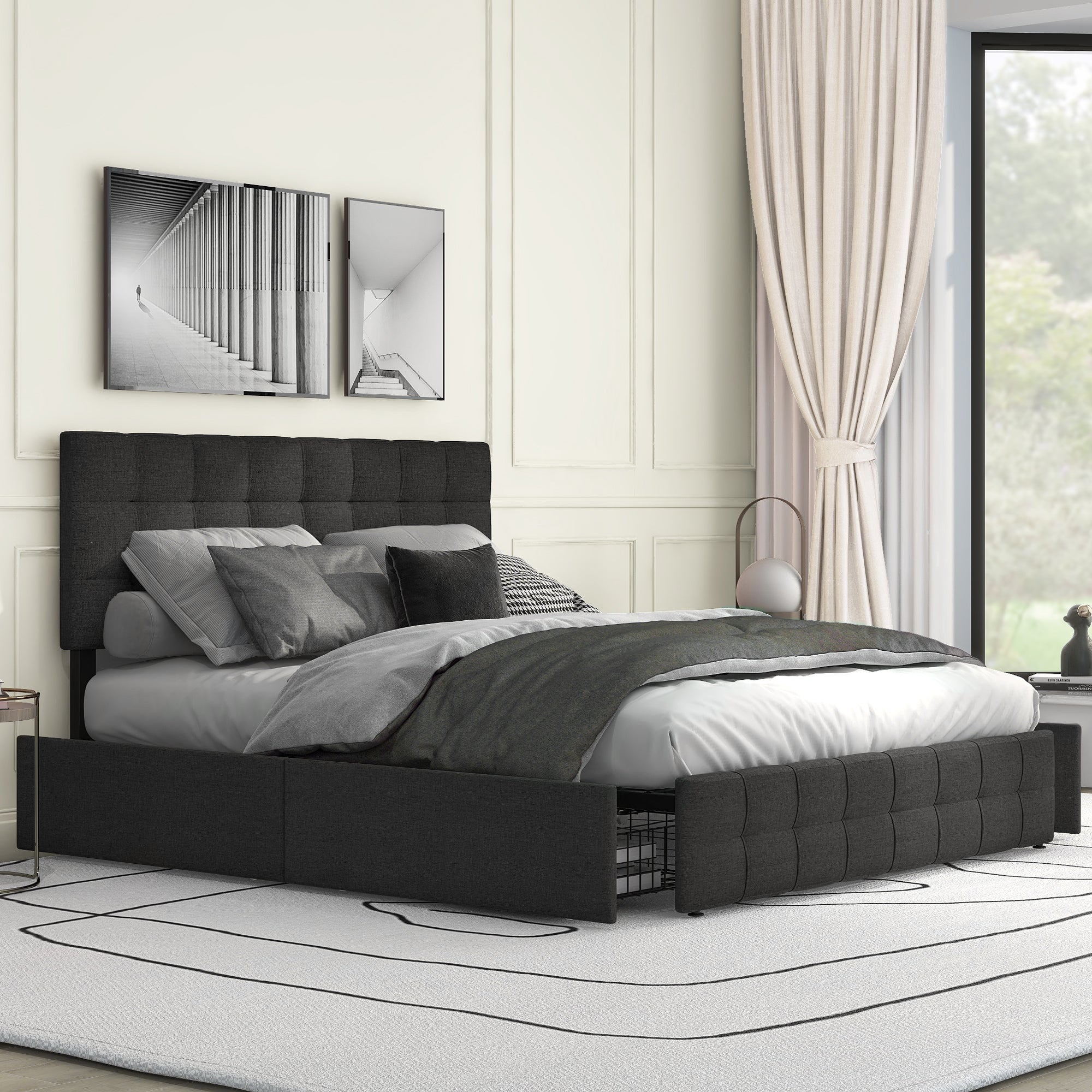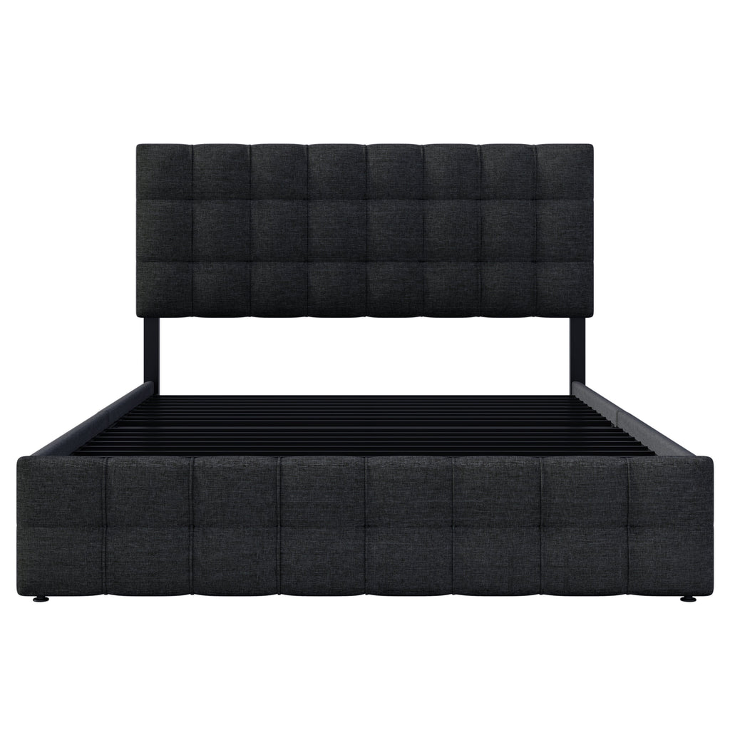 Upholstered Bed, 4 Drawers, Adjustable Headboard, Black Linen