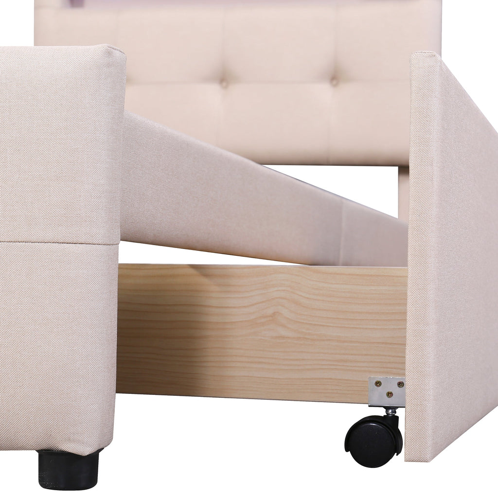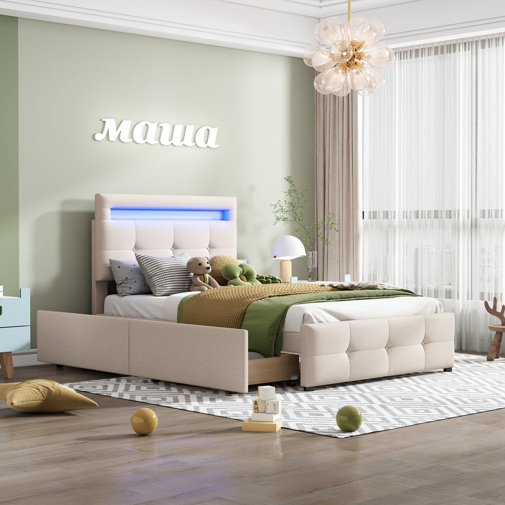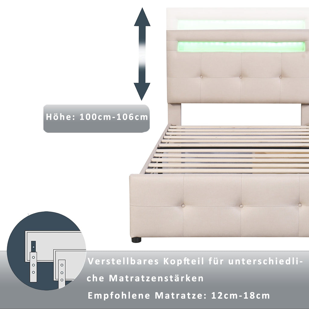 Upholstered Bed 90x200cm, LED Lights, 2 Drawers, Linen Beige